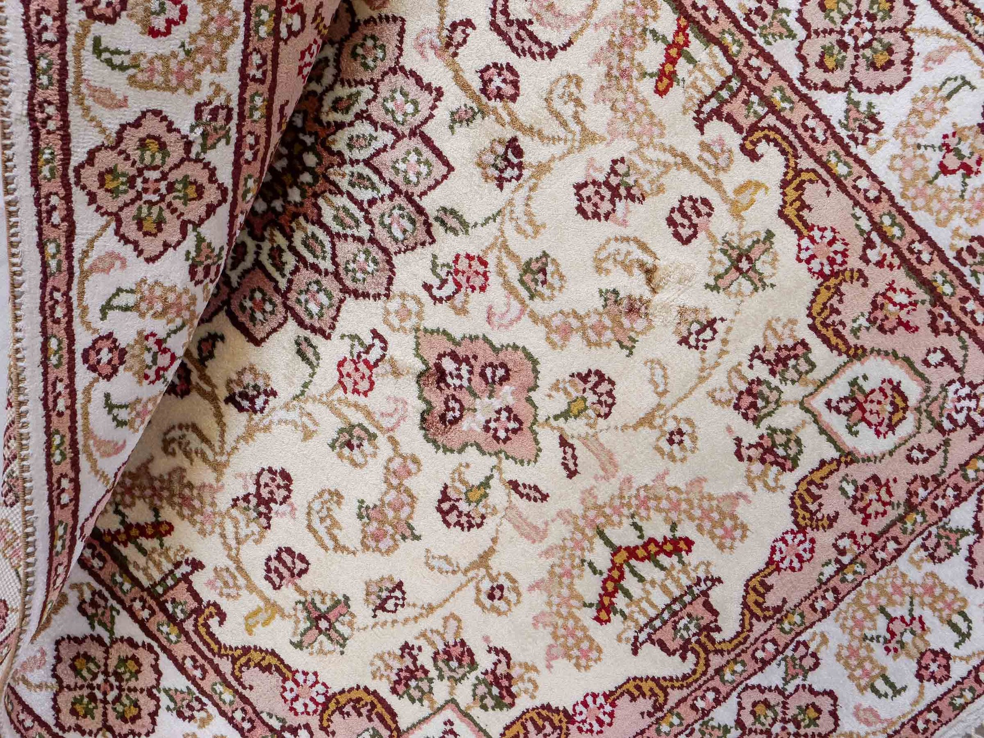 Seidenteppiche sollten niemals nass werden, da Wasser die empfindlichen Fasern und Farben erheblich schädigen kann. Nässe kann zu Verformung, Farbverlust und Faserschwächung führen. Sollte der Teppich versehentlich mit Flüssigkeit in Kontakt kommen, tupfen Sie die betroffene Stelle sofort mit einem sauberen, saugfähigen Tuch ab und vermeiden Sie starkes Reiben. Der Teppich sollte so schnell wie möglich an der Luft getrocknet werden, ohne direkte Sonneneinstrahlung oder Hitzequellen, um weitere Schäden zu verhindern. In schweren Fällen wird dringend empfohlen, professionelle Hilfe in Anspruch zu nehmen.