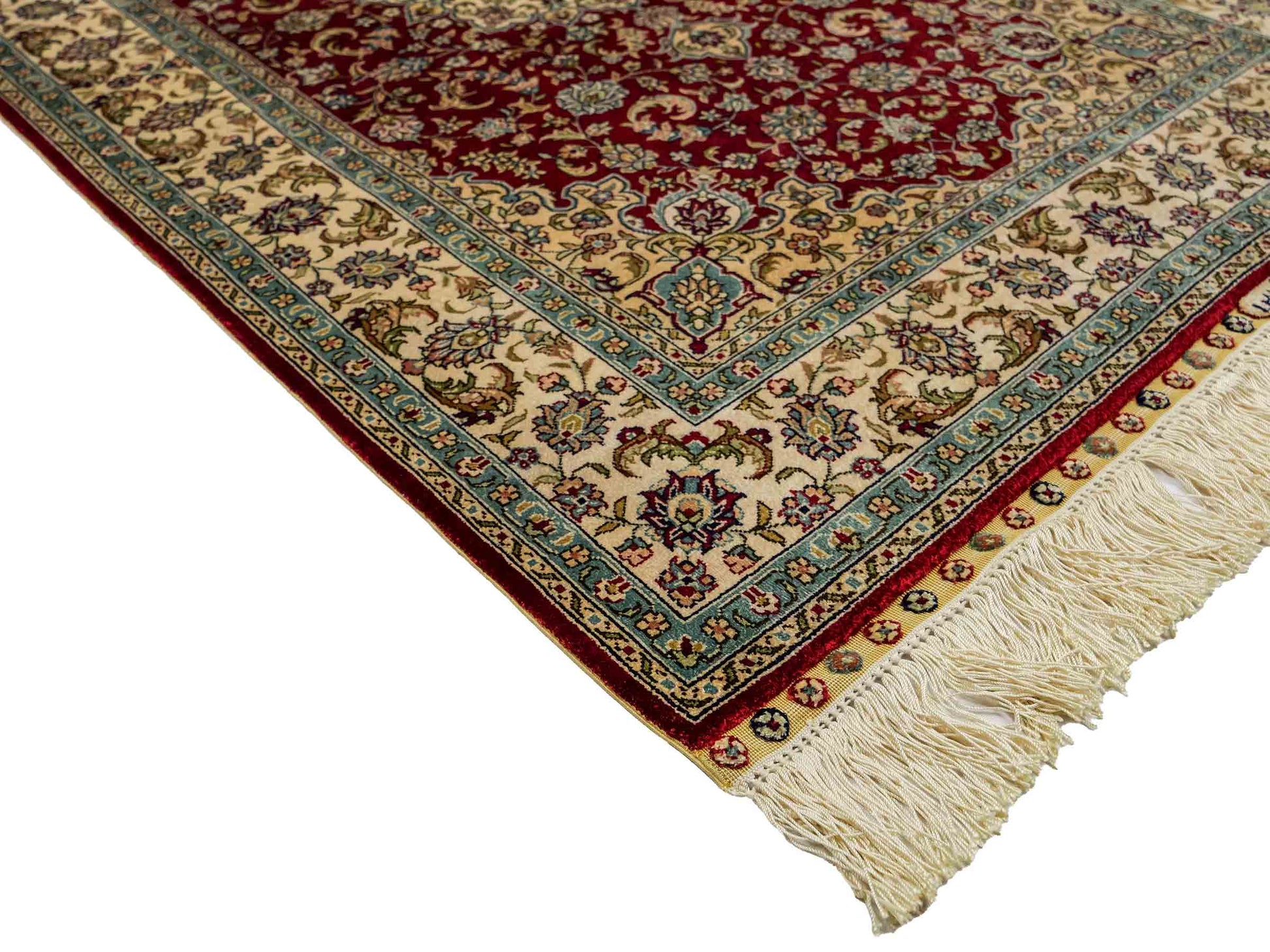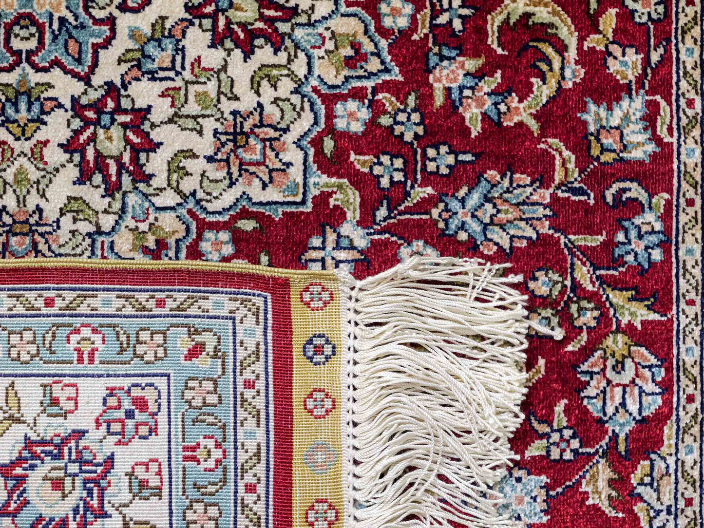 Der Flor und die Kette bestehen aus reiner Seide, was dem Teppich nicht nur einen unfassbaren Wert, eine unvergleichliche Haptik und atemberaubende Schönheit, sondern auch je nach Blickwinkel und Lichtverhältnis ein einzigartig schimmerndes Antlitz verleiht.