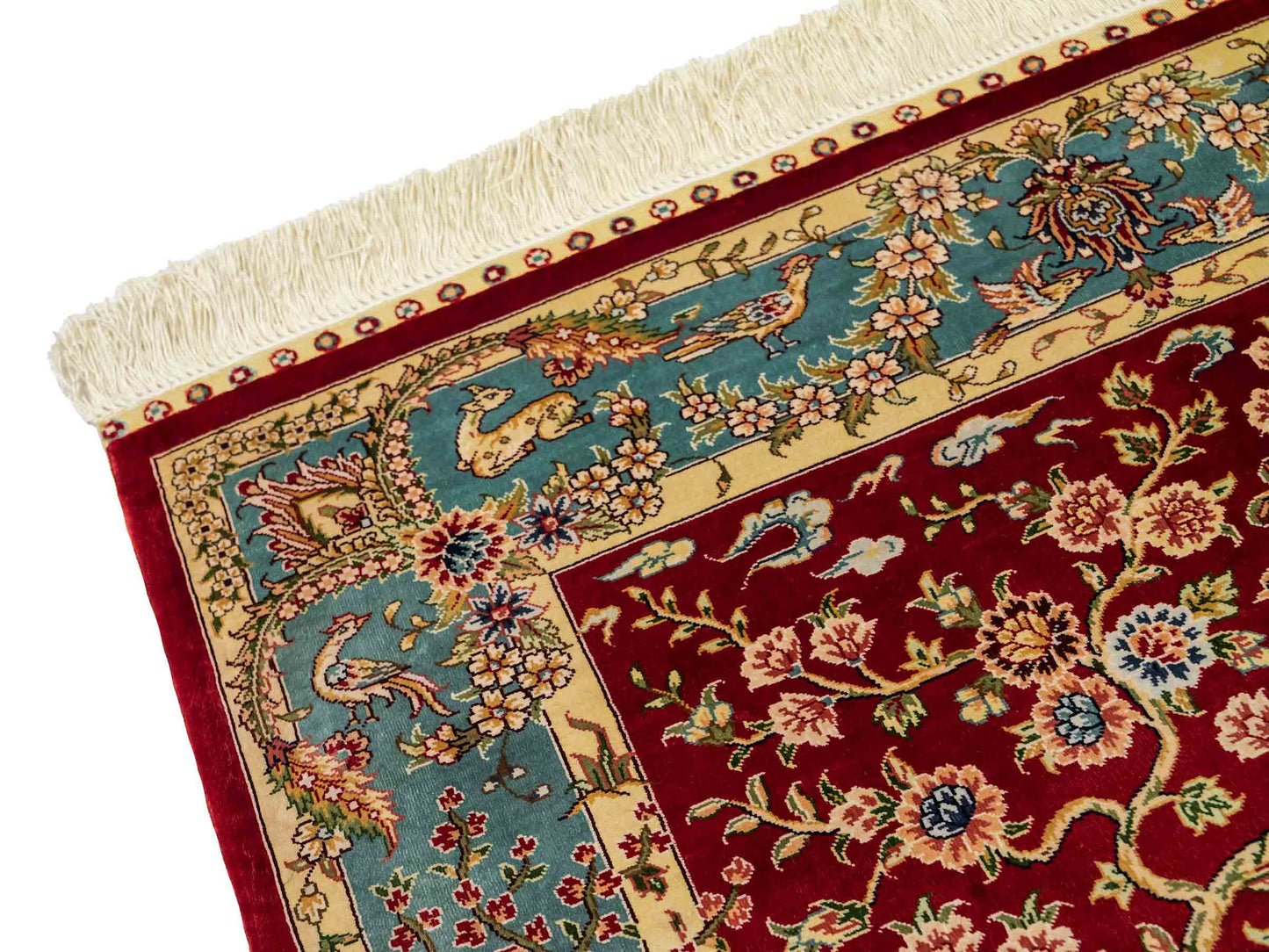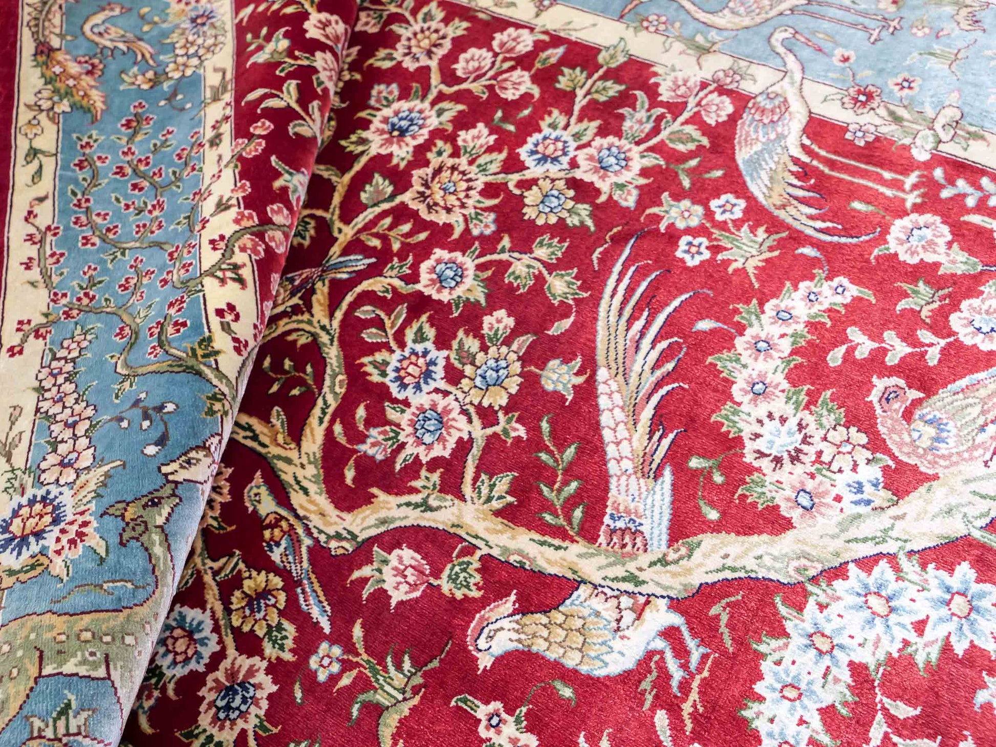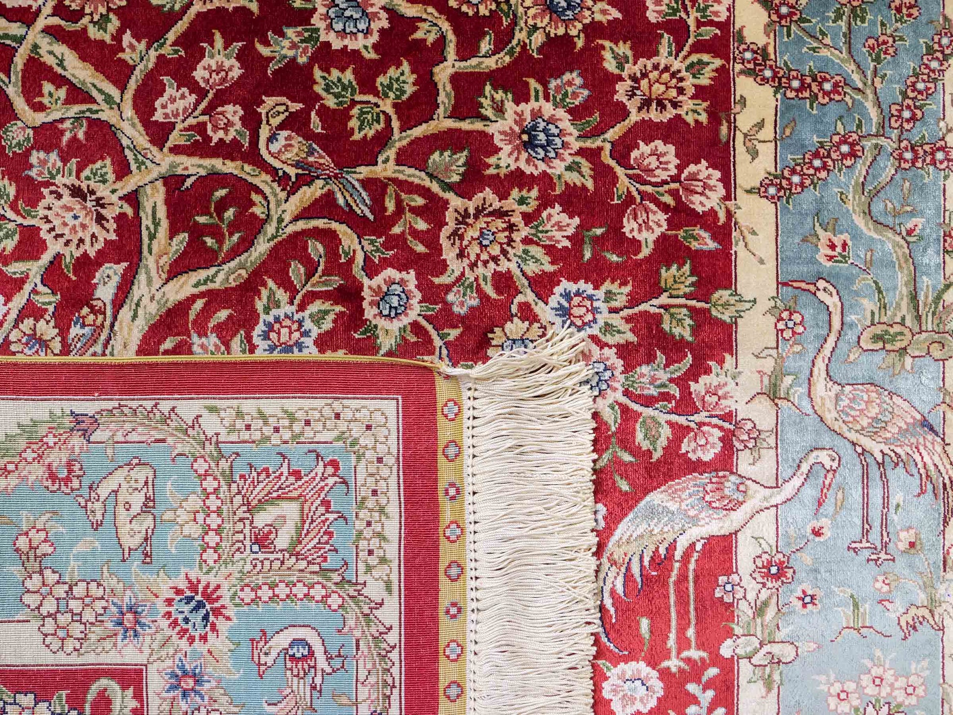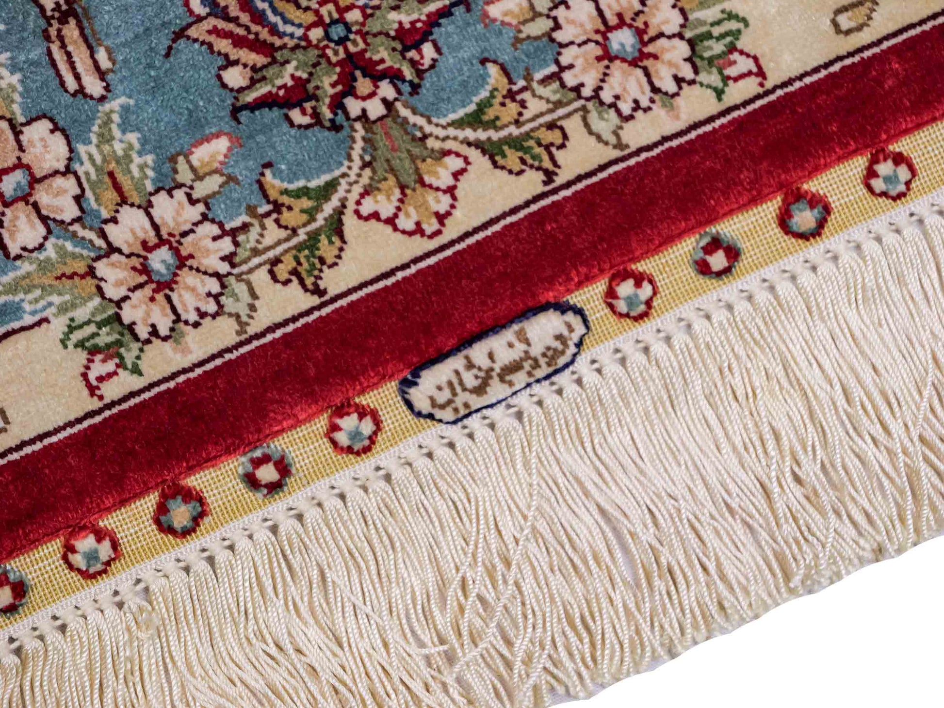 Der Flor und die Kette bestehen aus reiner Seide, was dem Teppich nicht nur einen unfassbaren Wert, eine unvergleichliche Haptik und atemberaubende Schönheit, sondern auch je nach Blickwinkel und Lichtverhältnis ein einzigartig schimmerndes Antlitz verleiht.