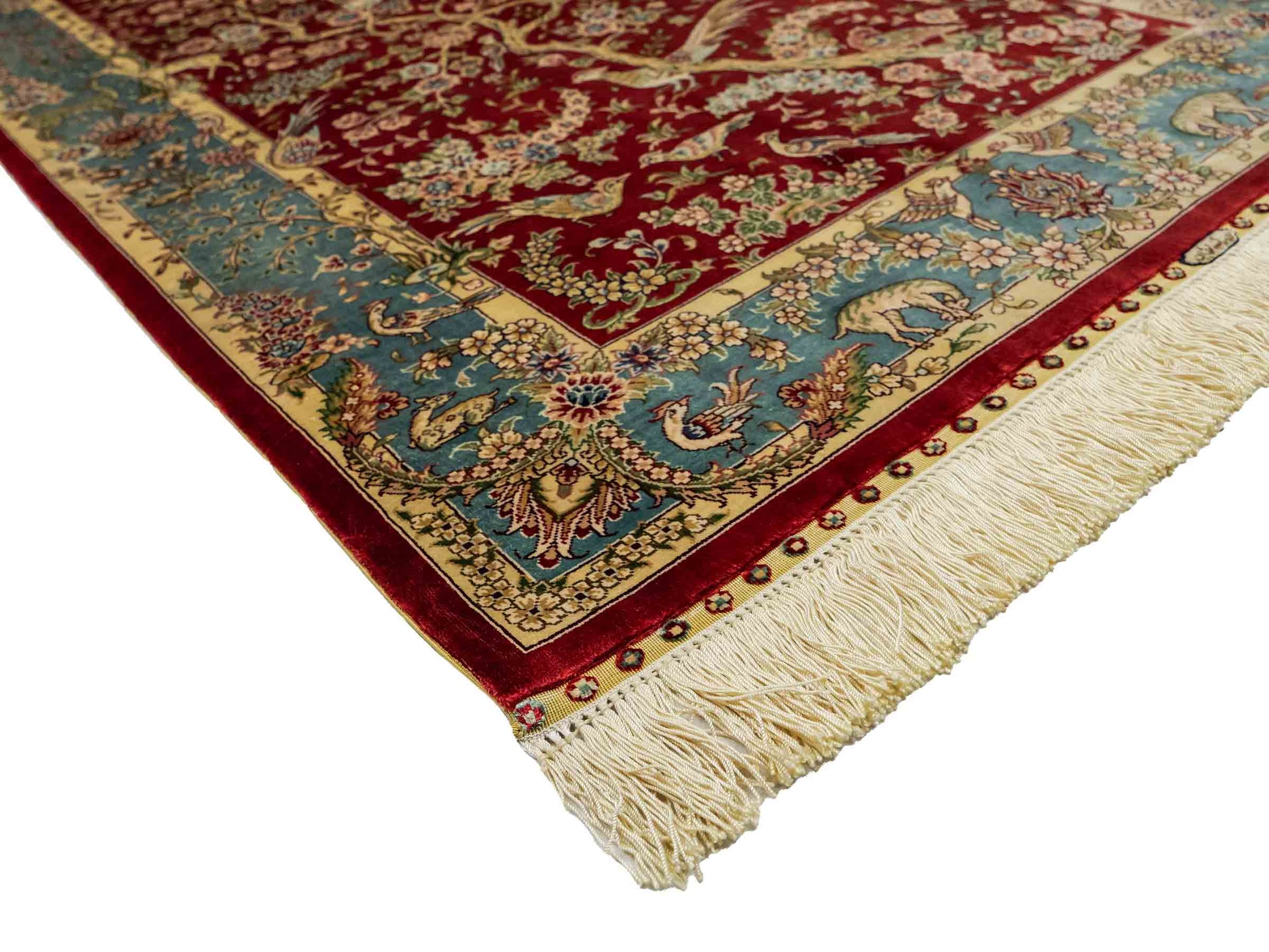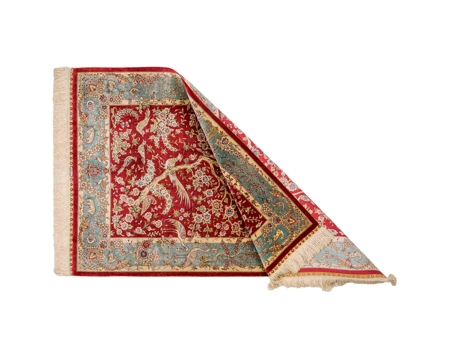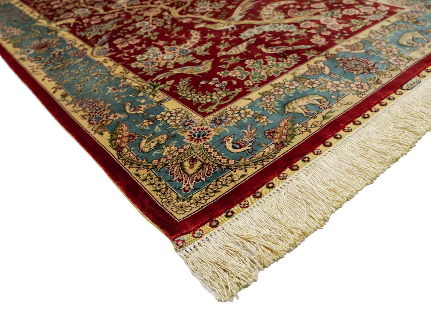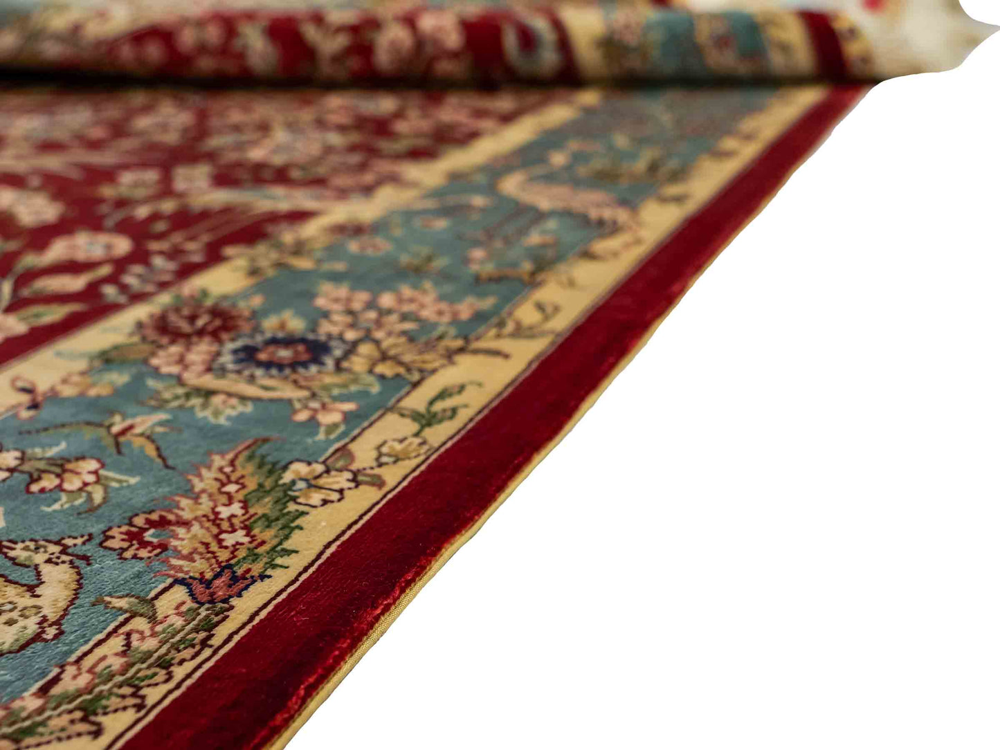 Der Flor und die Kette bestehen aus reiner Seide, was dem Teppich nicht nur einen unfassbaren Wert, eine unvergleichliche Haptik und atemberaubende Schönheit, sondern auch je nach Blickwinkel und Lichtverhältnis ein einzigartig schimmerndes Antlitz verleiht.