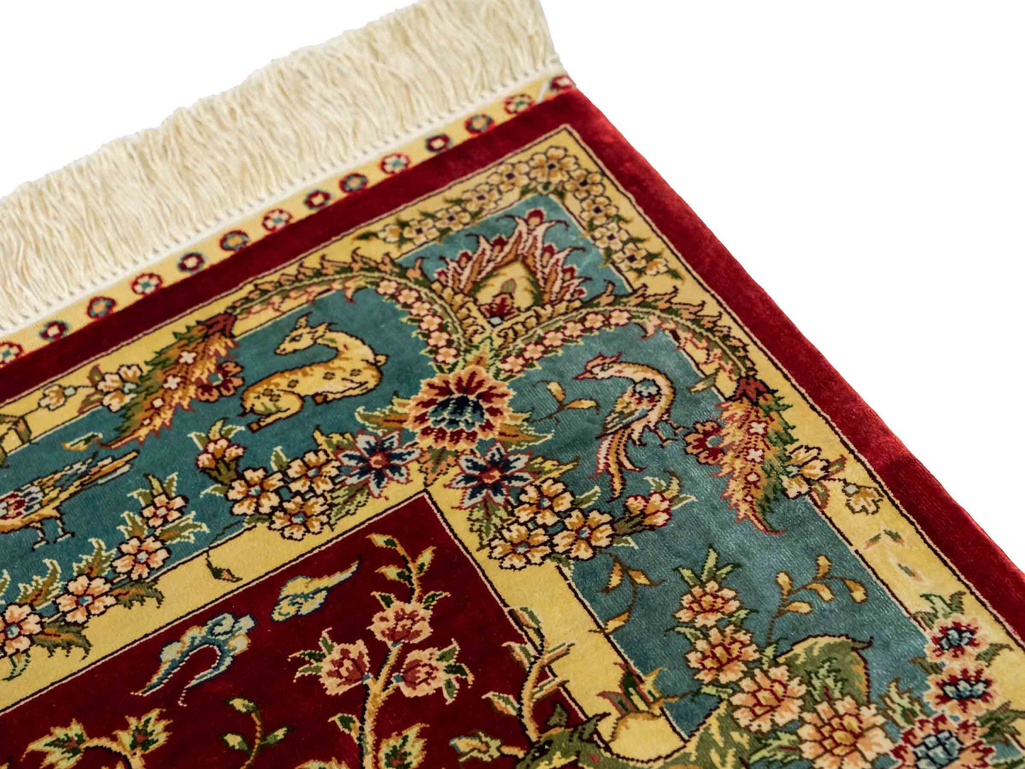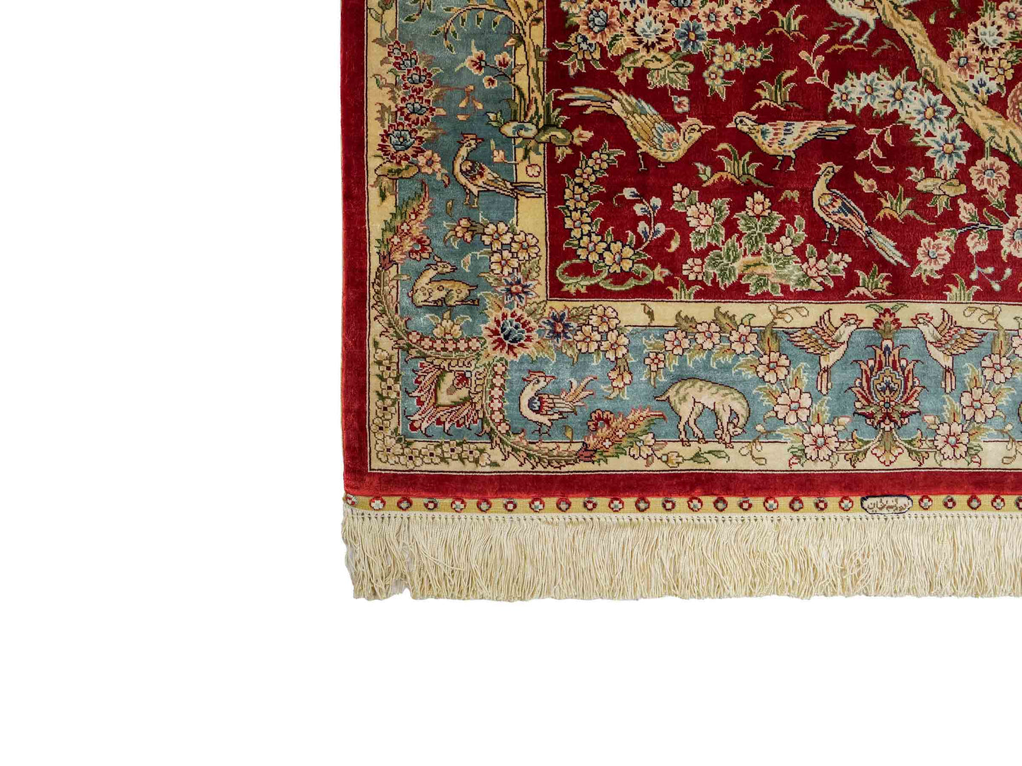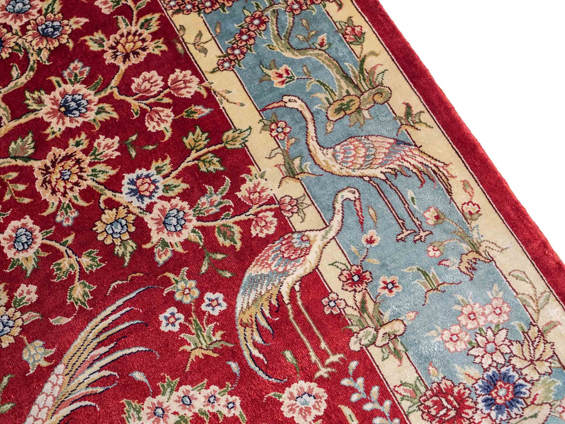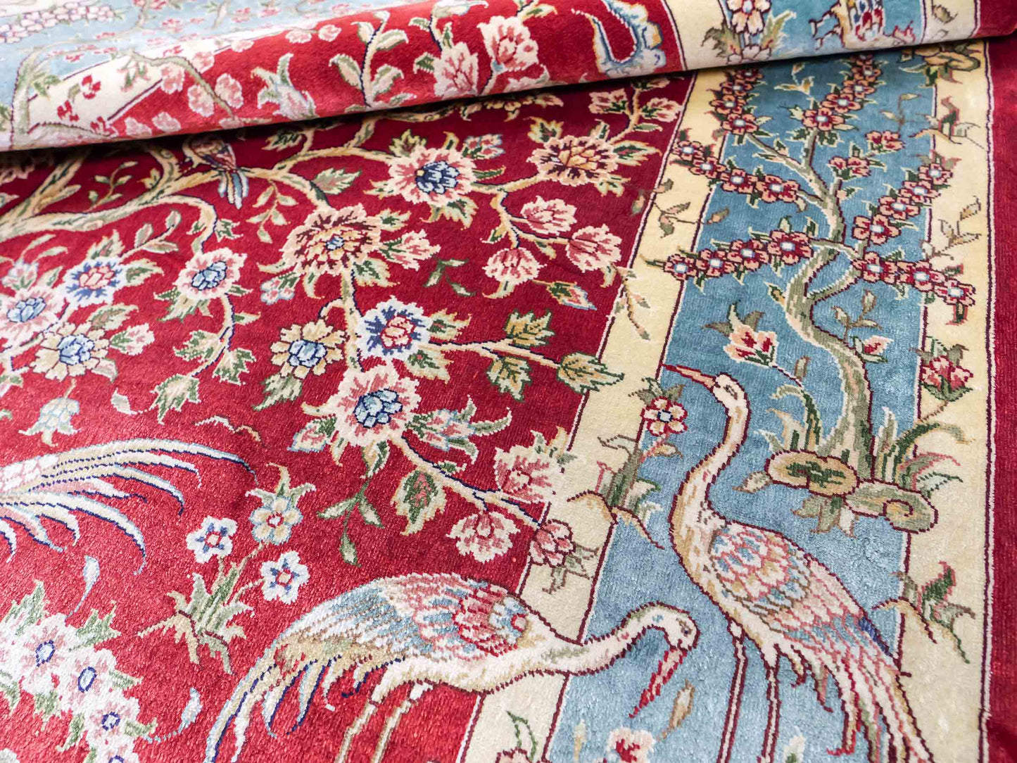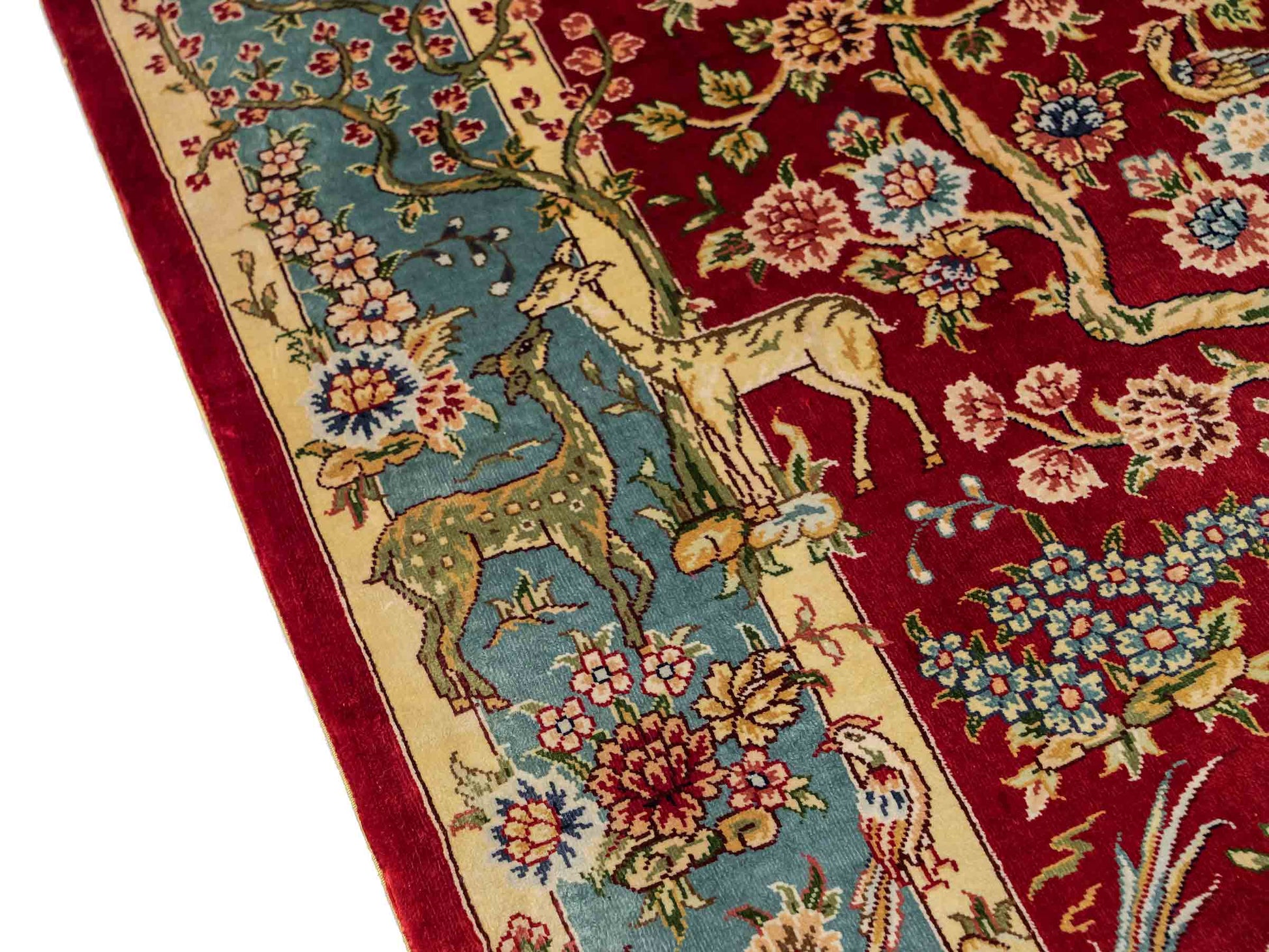 Der Flor und die Kette bestehen aus reiner Seide, was dem Teppich nicht nur einen unfassbaren Wert, eine unvergleichliche Haptik und atemberaubende Schönheit, sondern auch je nach Blickwinkel und Lichtverhältnis ein einzigartig schimmerndes Antlitz verleiht.
