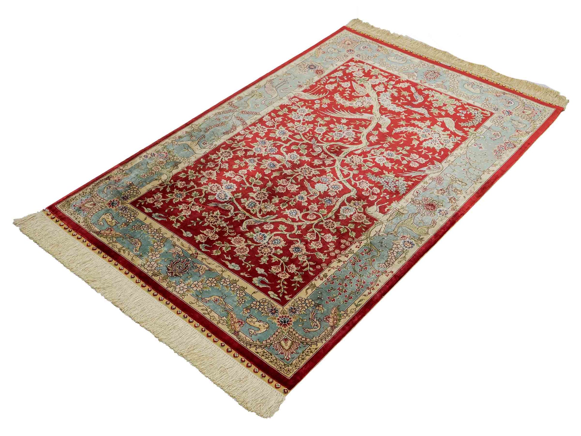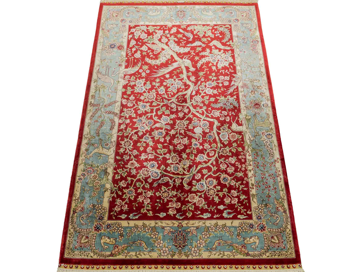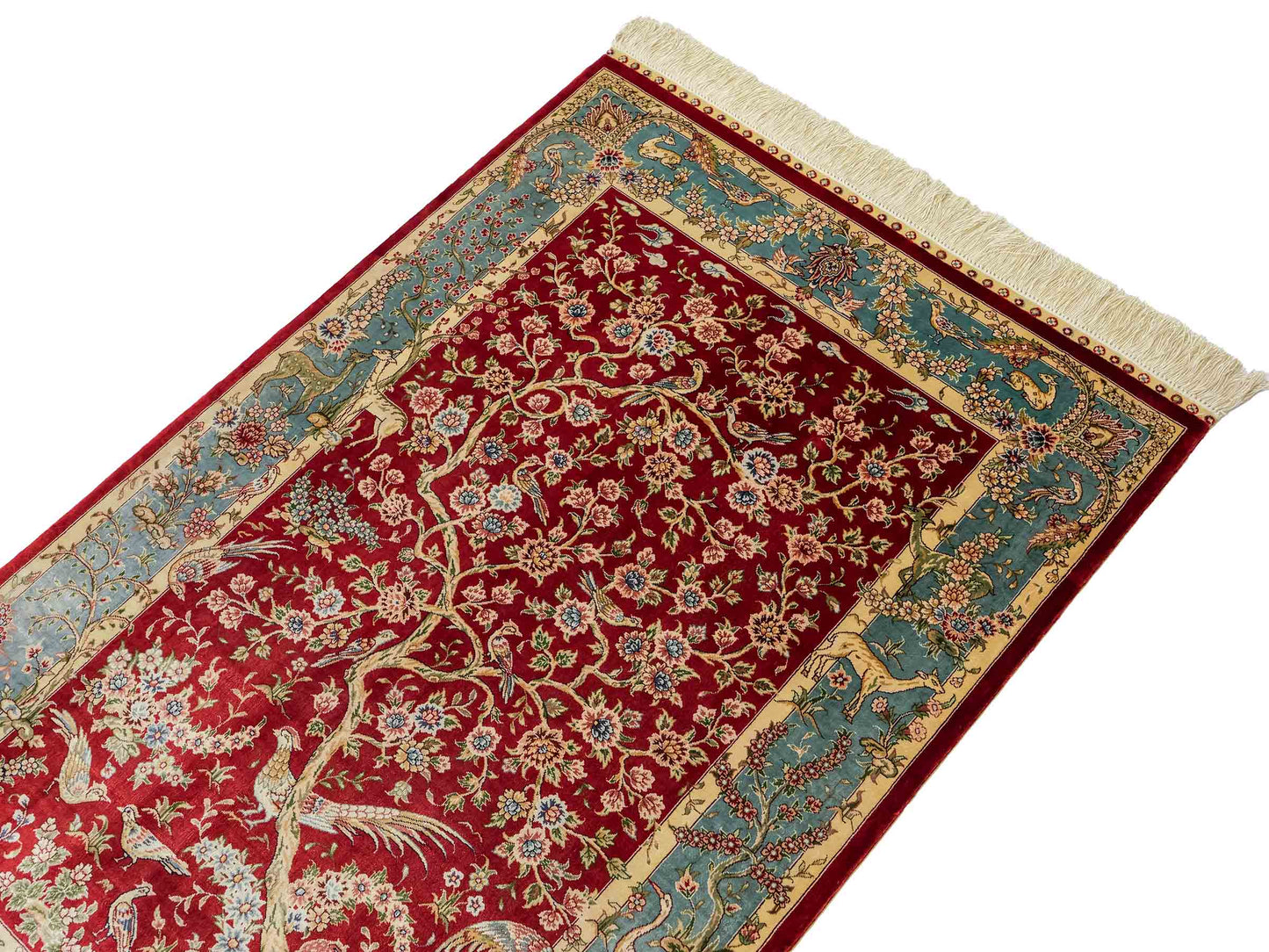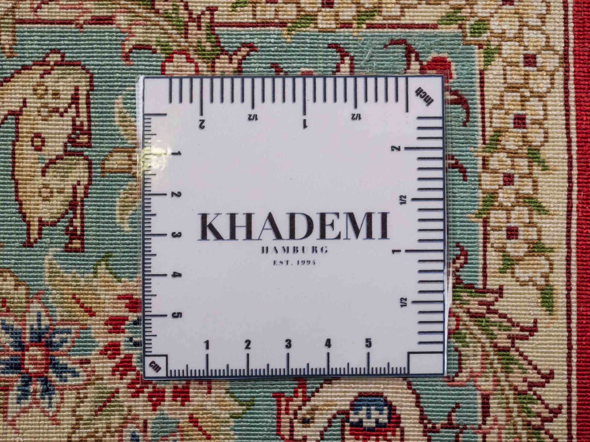 Der Flor und die Kette bestehen aus reiner Seide, was dem Teppich nicht nur einen unfassbaren Wert, eine unvergleichliche Haptik und atemberaubende Schönheit, sondern auch je nach Blickwinkel und Lichtverhältnis ein einzigartig schimmerndes Antlitz verleiht.