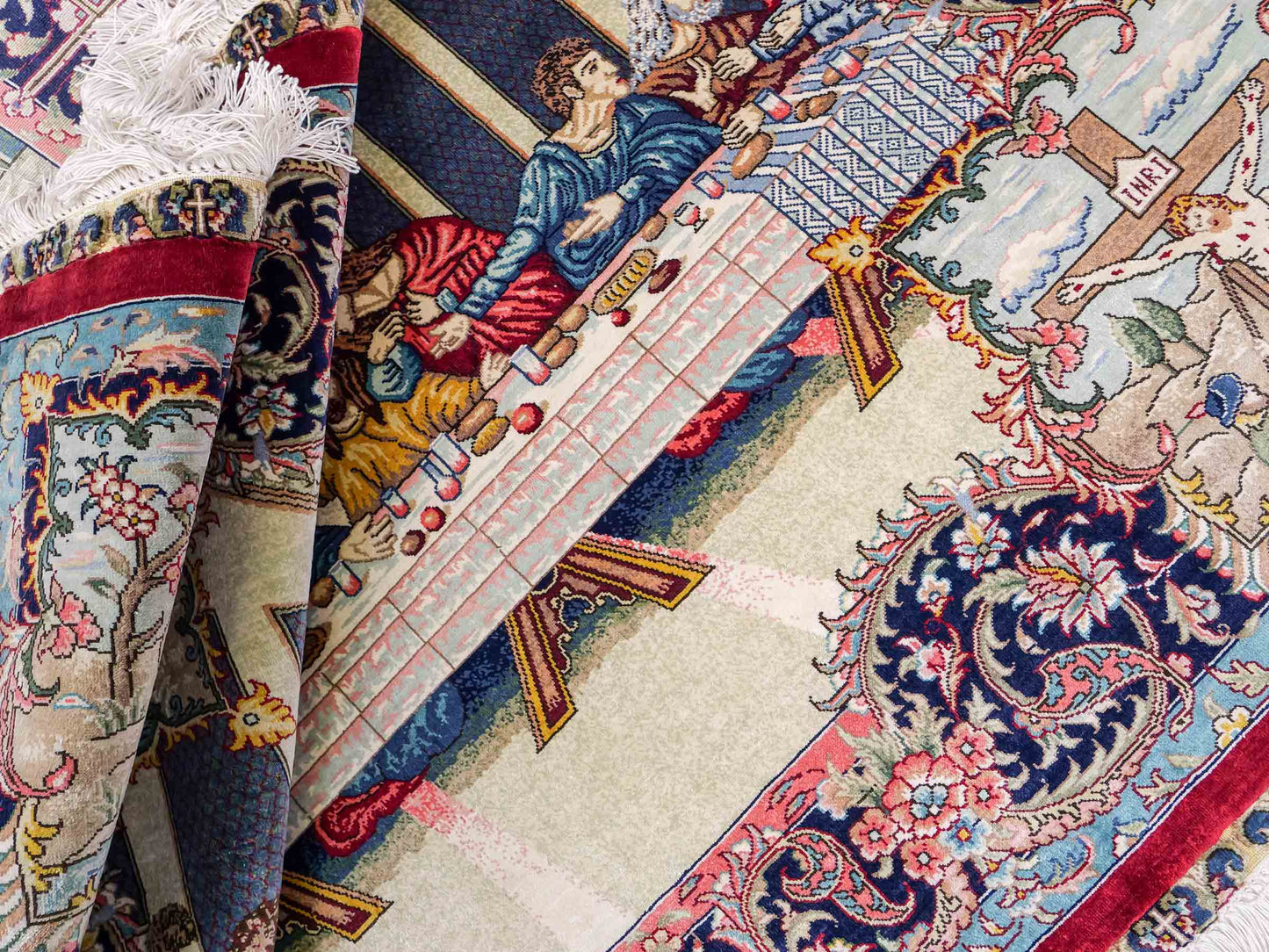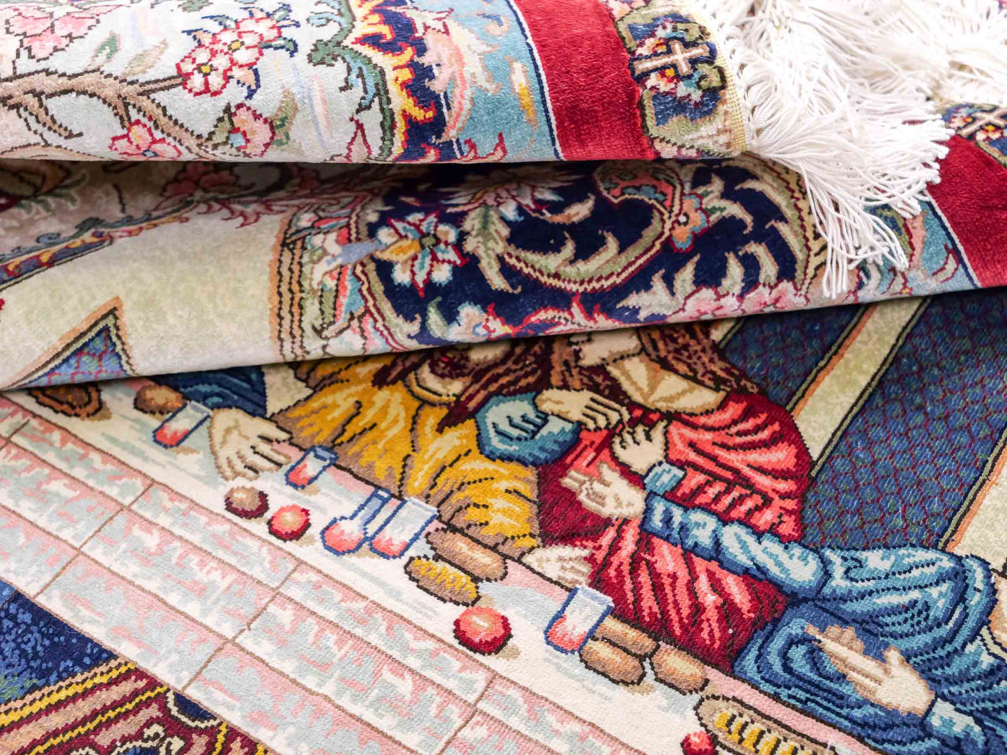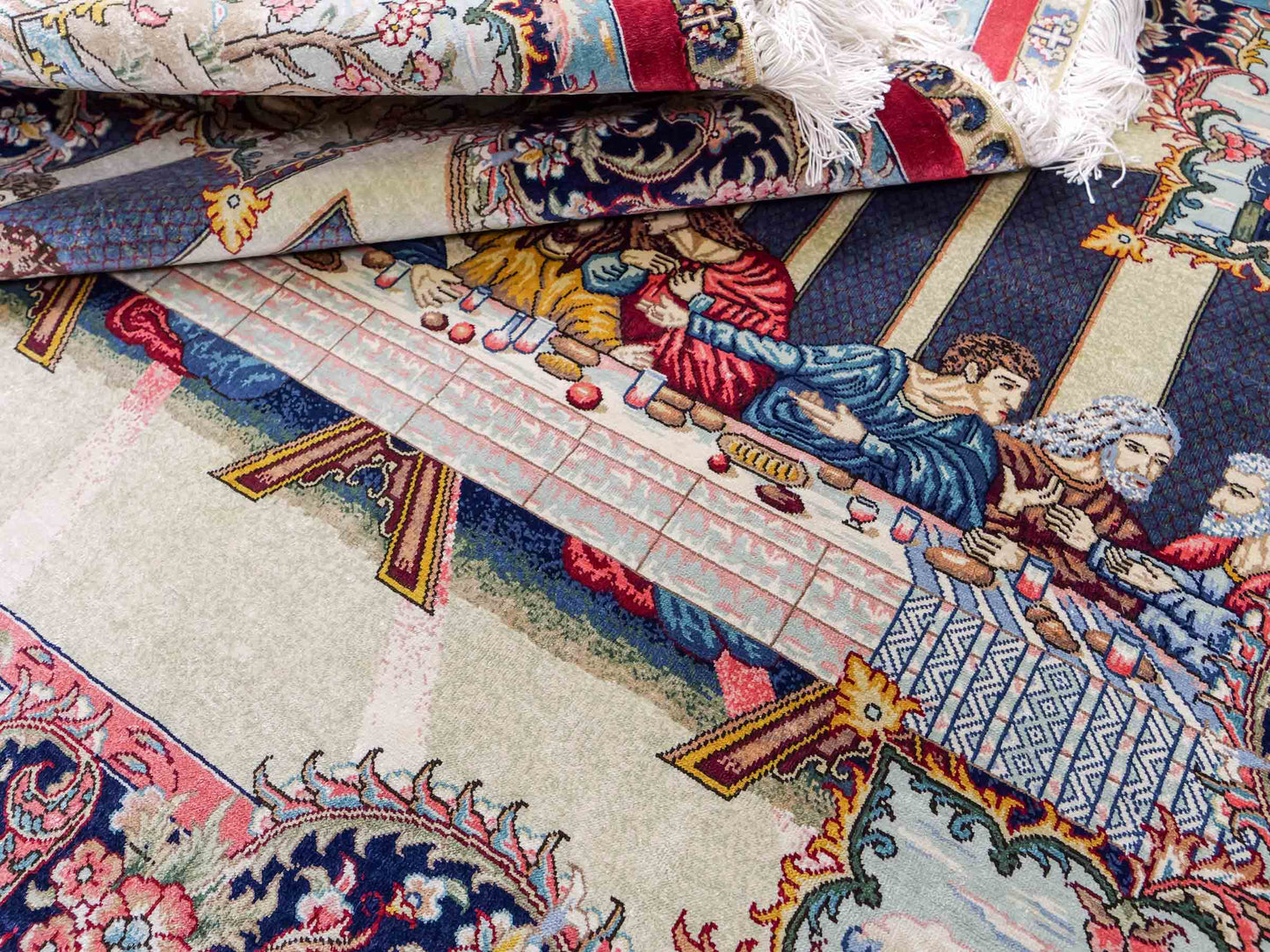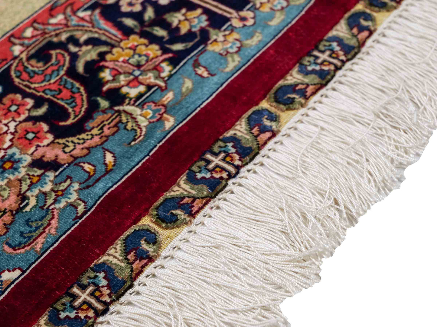 Der Flor und die Kette bestehen aus reiner Seide, was dem Teppich nicht nur einen unfassbaren Wert, eine unvergleichliche Haptik und atemberaubende Schönheit, sondern auch je nach Blickwinkel und Lichtverhältnis ein einzigartig schimmerndes Antlitz verleiht.