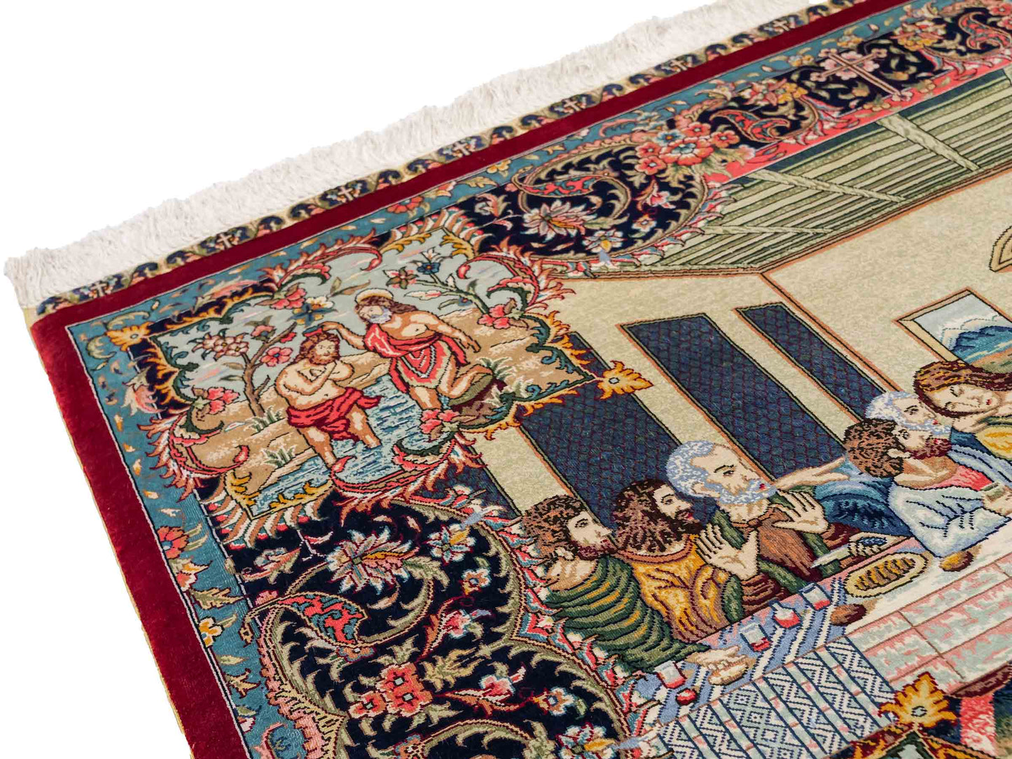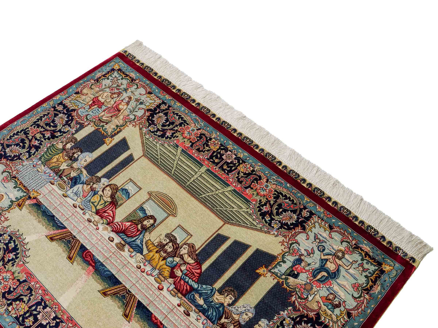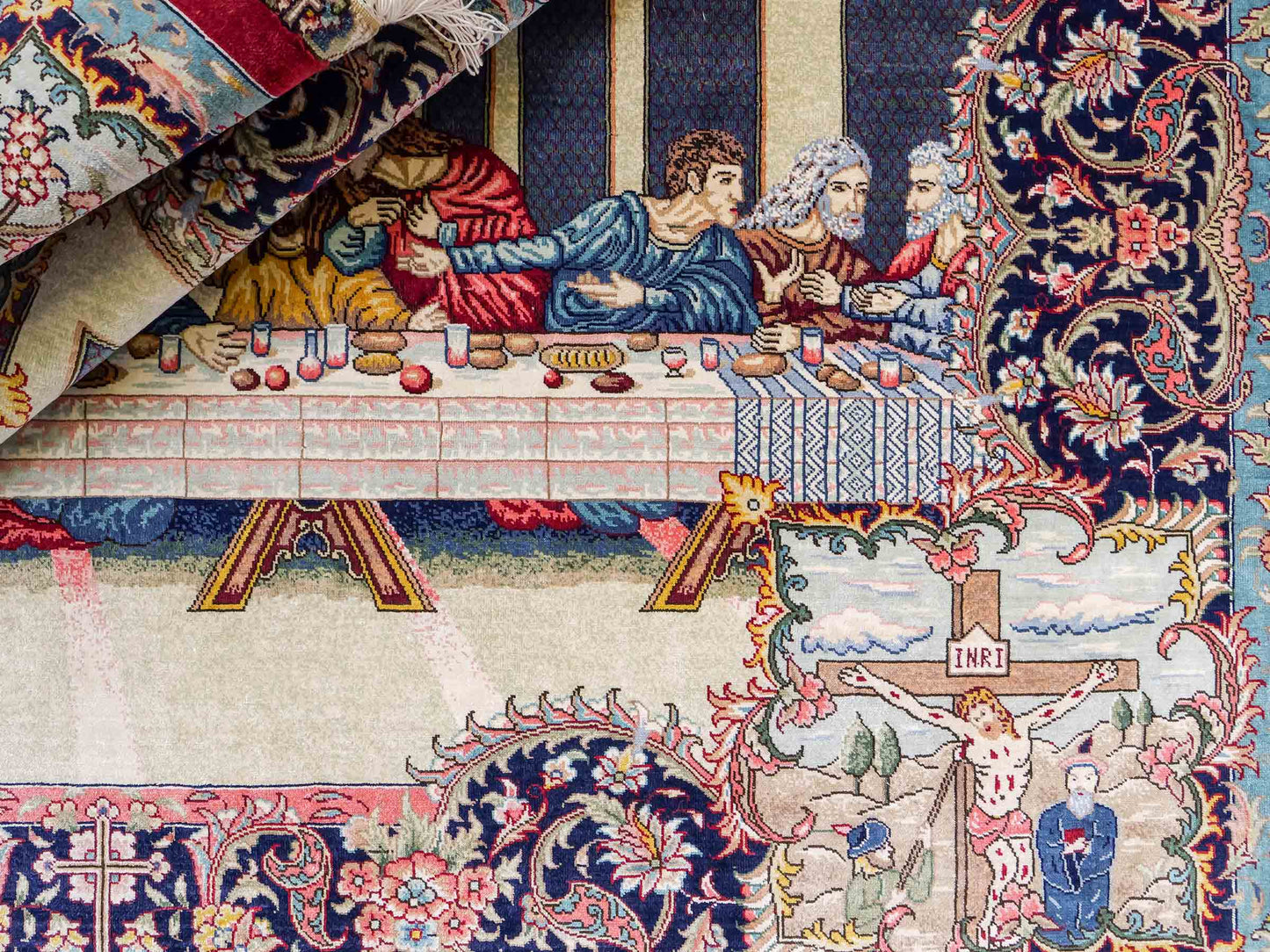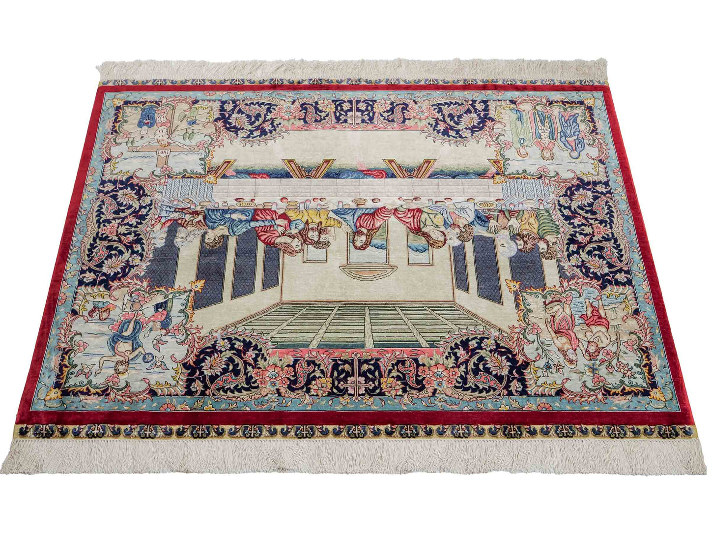 Der Flor und die Kette bestehen aus reiner Seide, was dem Teppich nicht nur einen unfassbaren Wert, eine unvergleichliche Haptik und atemberaubende Schönheit, sondern auch je nach Blickwinkel und Lichtverhältnis ein einzigartig schimmerndes Antlitz verleiht.