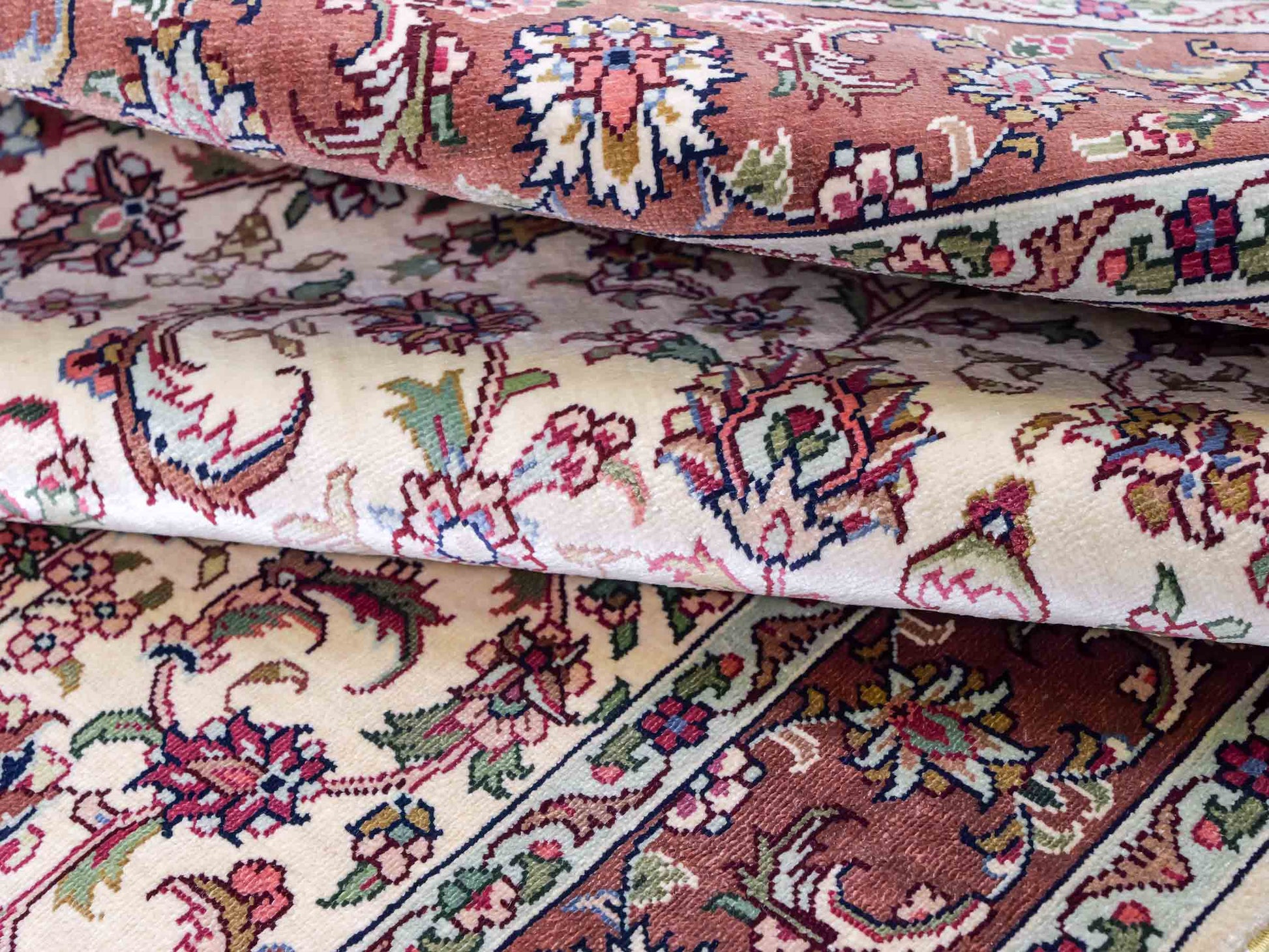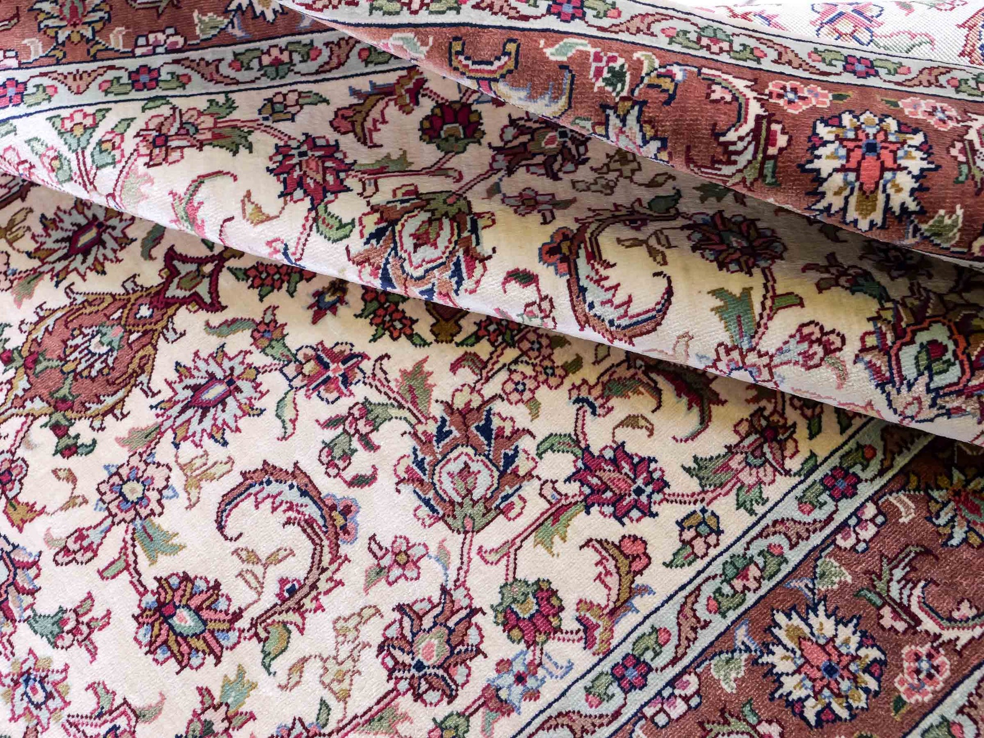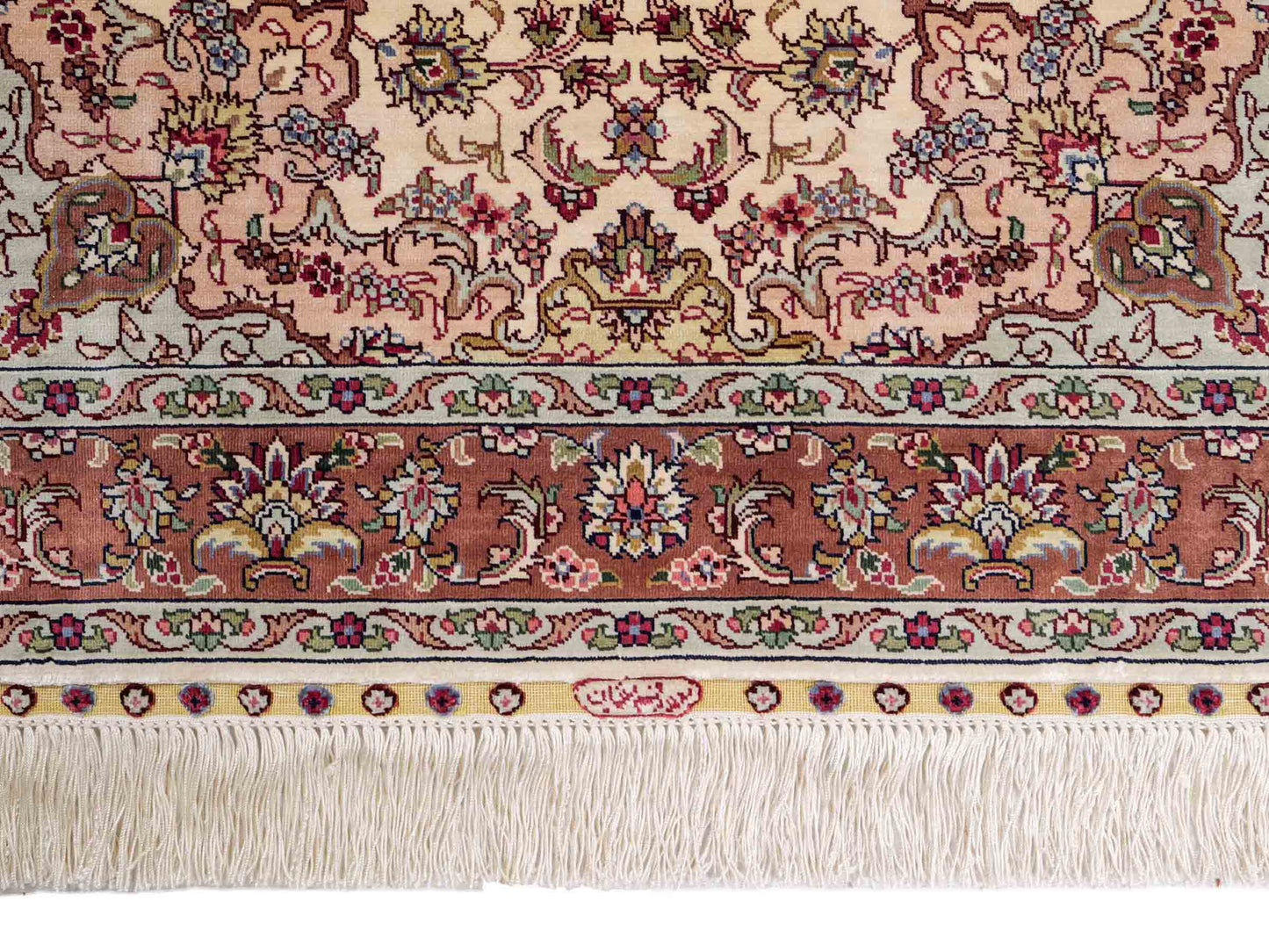 Der Flor und die Kette bestehen aus reiner Seide, was dem Teppich nicht nur einen unfassbaren Wert, eine unvergleichliche Haptik und atemberaubende Schönheit, sondern auch je nach Blickwinkel und Lichtverhältnis ein einzigartig schimmerndes Antlitz verleiht.