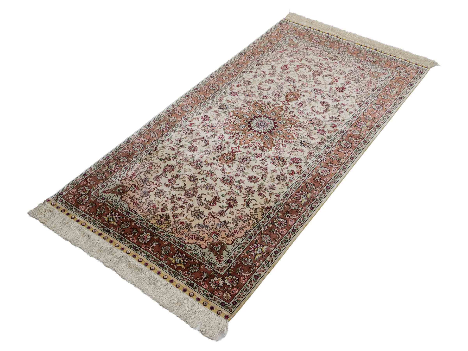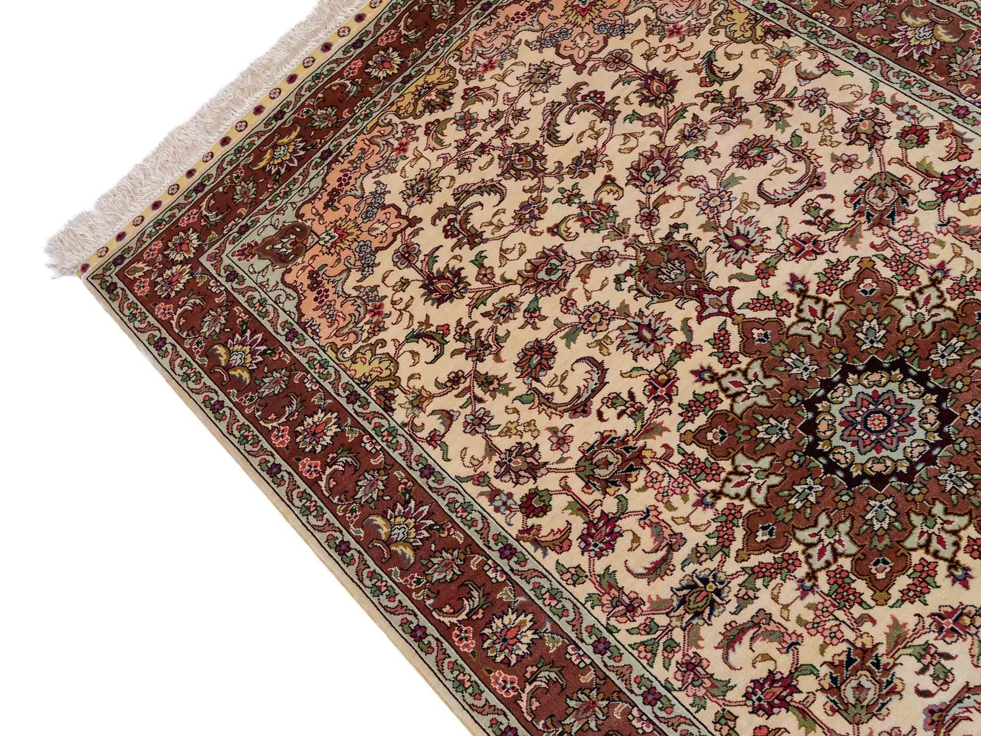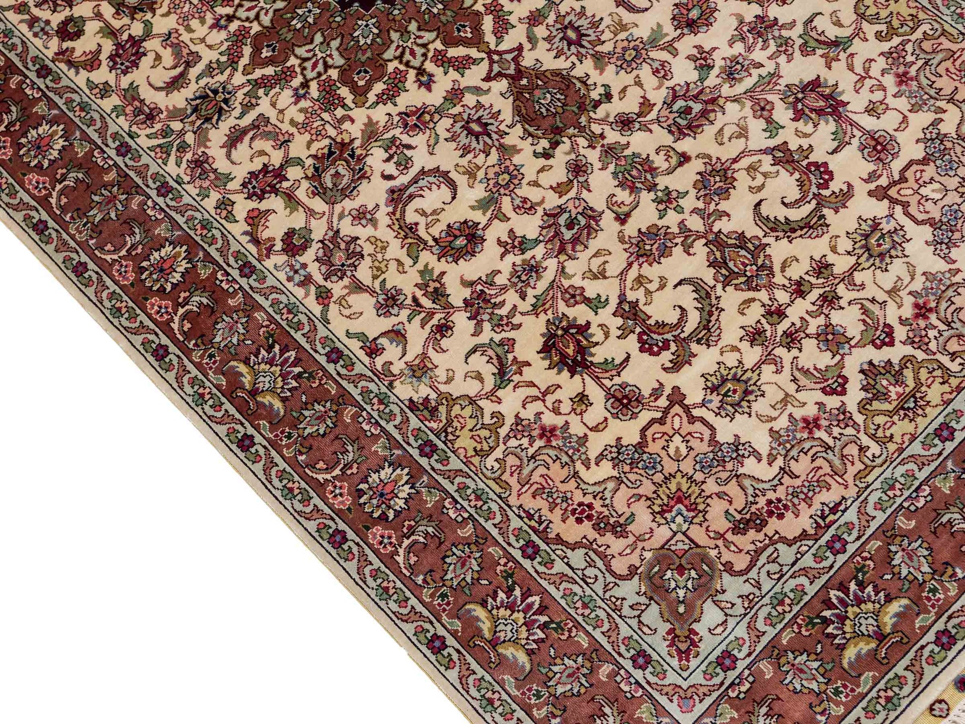 Der Flor und die Kette bestehen aus reiner Seide, was dem Teppich nicht nur einen unfassbaren Wert, eine unvergleichliche Haptik und atemberaubende Schönheit, sondern auch je nach Blickwinkel und Lichtverhältnis ein einzigartig schimmerndes Antlitz verleiht.