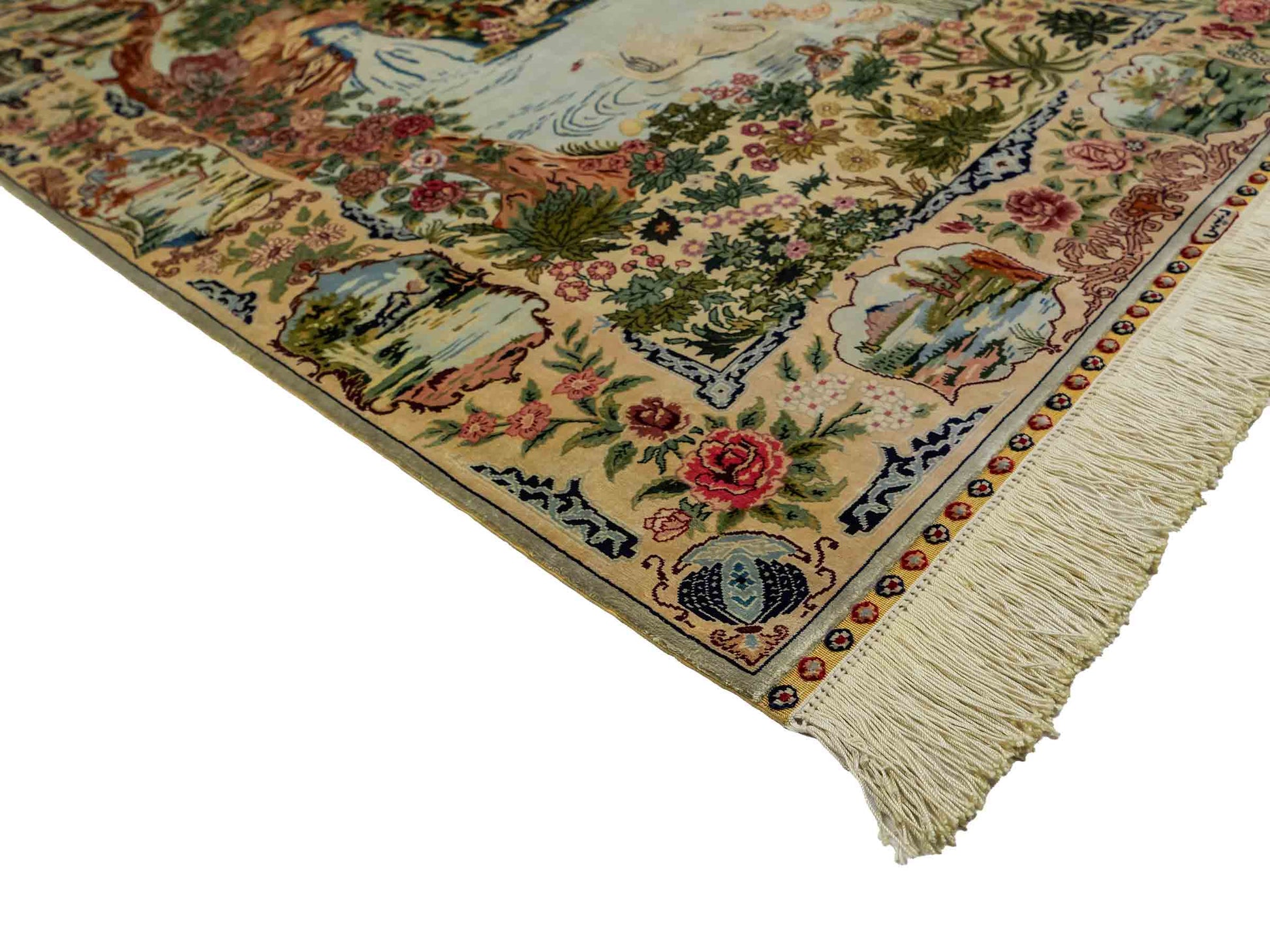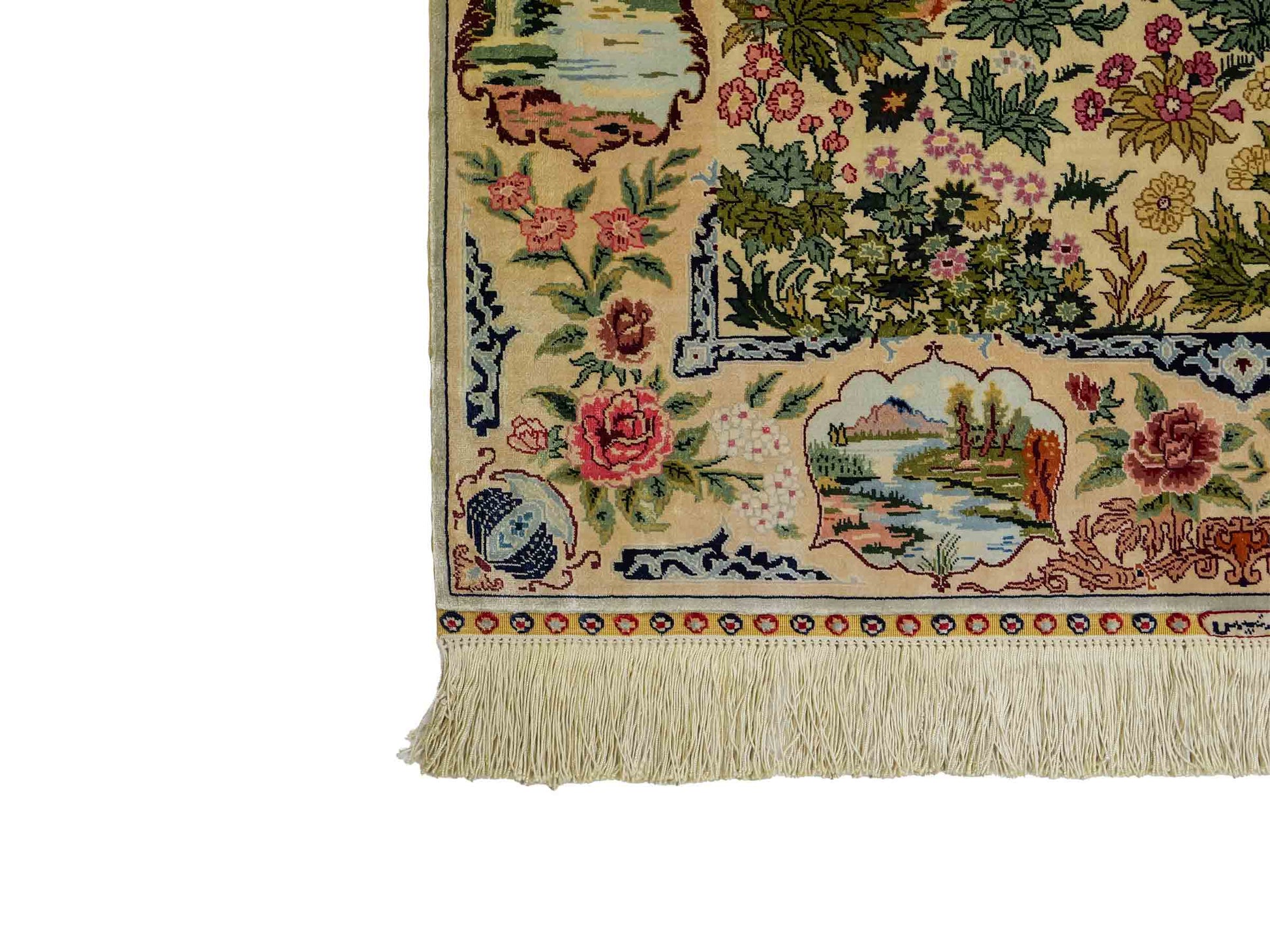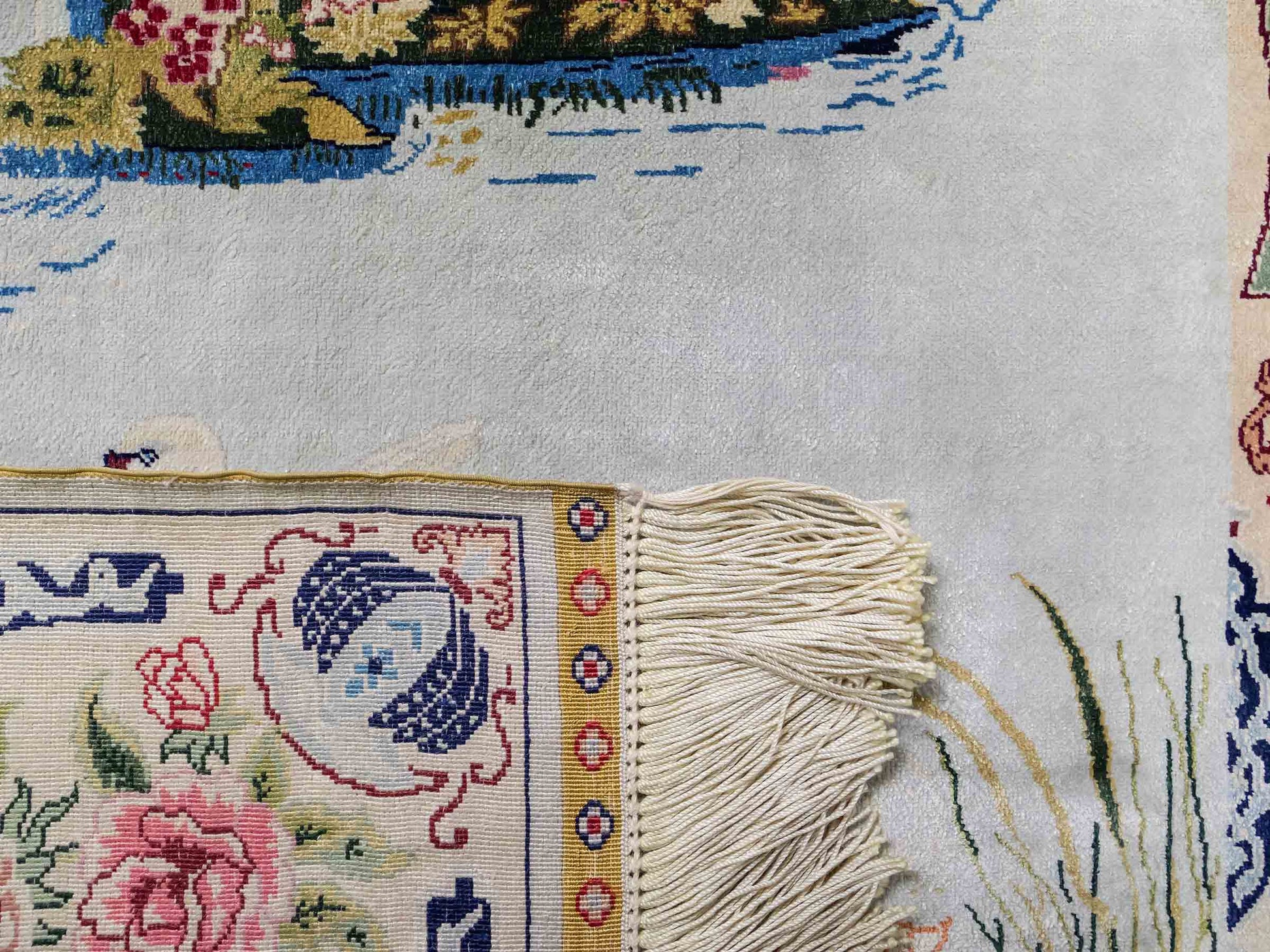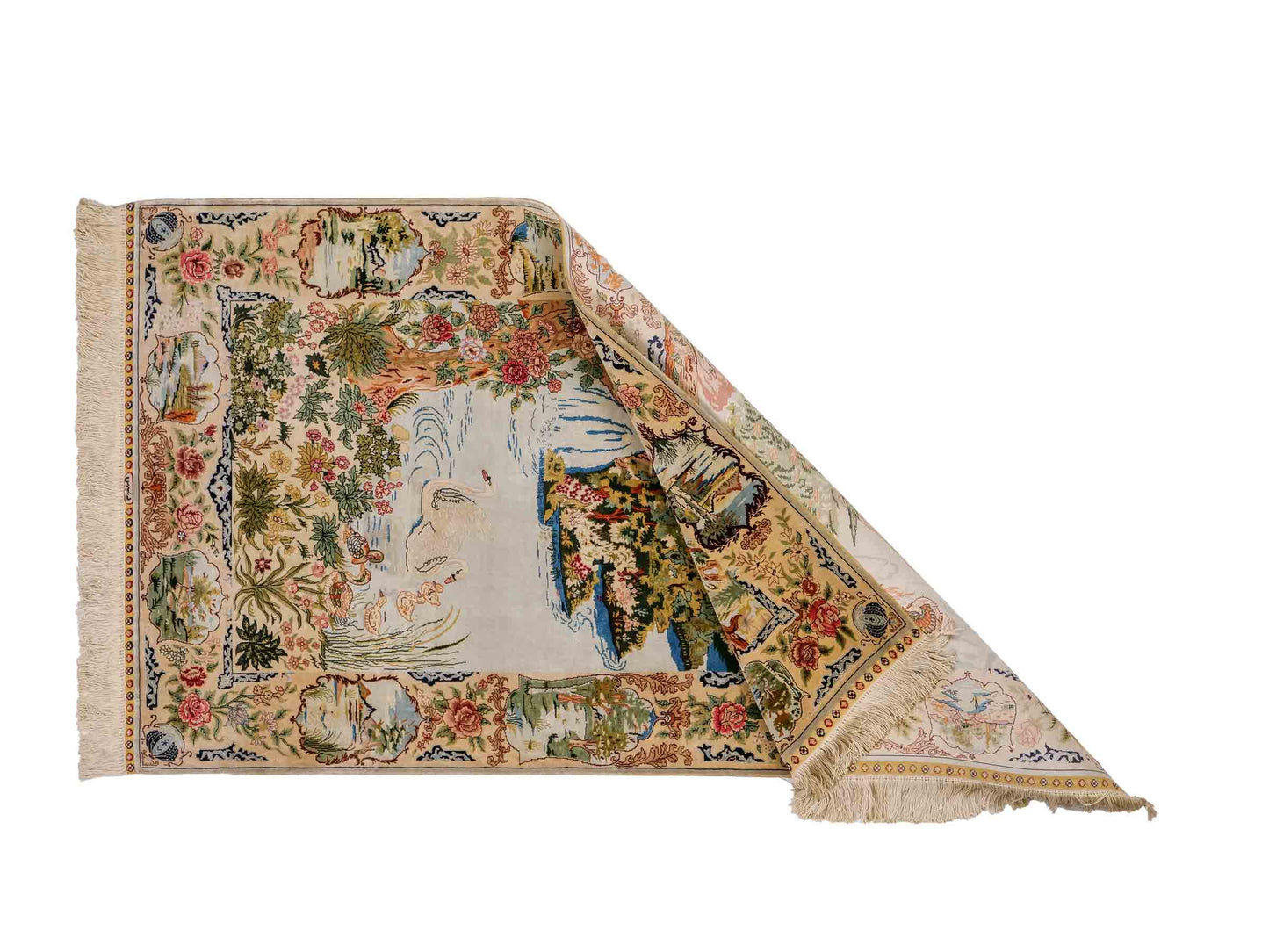 Der Flor und die Kette bestehen aus reiner Seide, was dem Teppich nicht nur einen unfassbaren Wert, eine unvergleichliche Haptik und atemberaubende Schönheit, sondern auch je nach Blickwinkel und Lichtverhältnis ein einzigartig schimmerndes Antlitz verleiht.