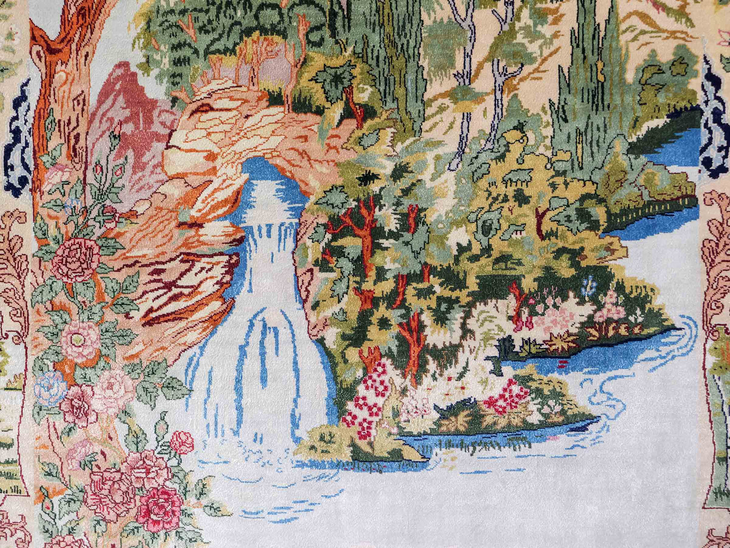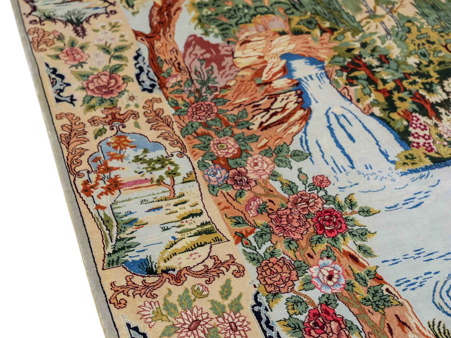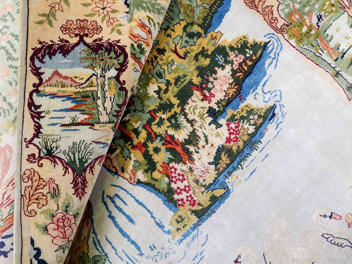 Der Flor und die Kette bestehen aus reiner Seide, was dem Teppich nicht nur einen unfassbaren Wert, eine unvergleichliche Haptik und atemberaubende Schönheit, sondern auch je nach Blickwinkel und Lichtverhältnis ein einzigartig schimmerndes Antlitz verleiht.
