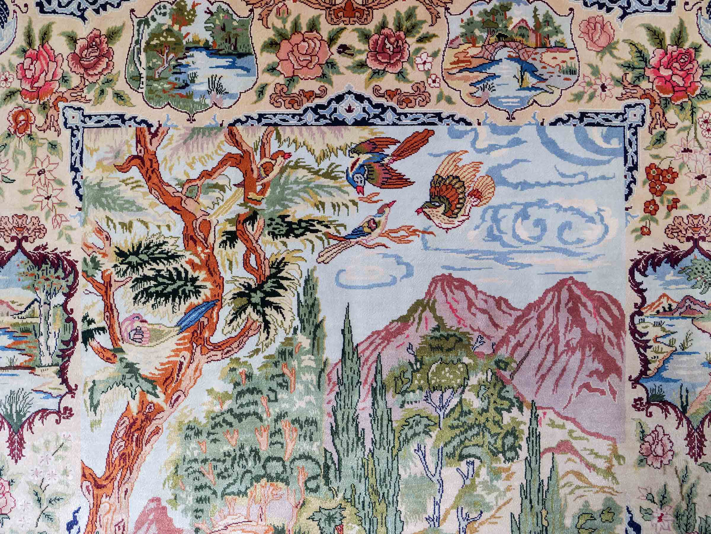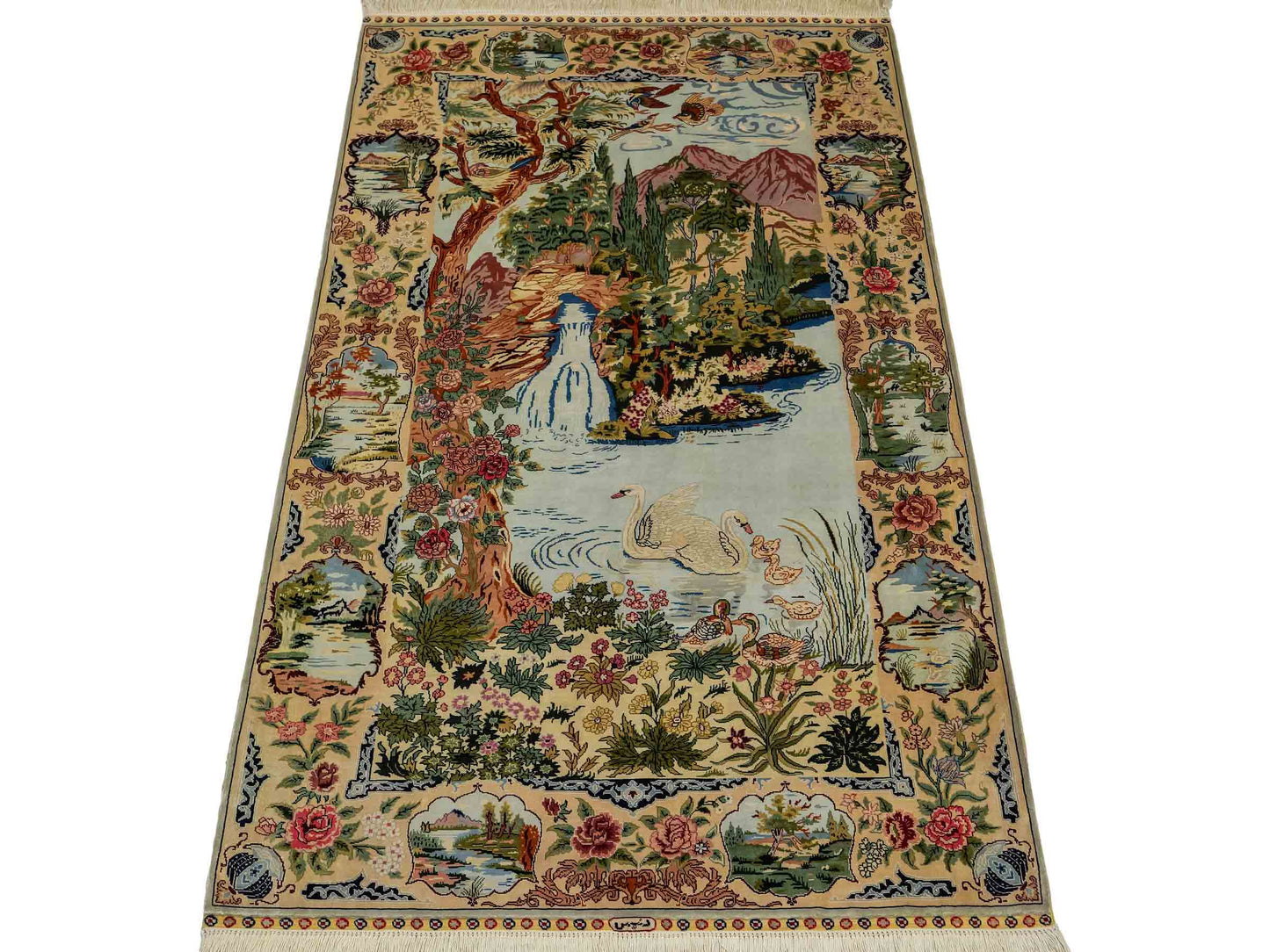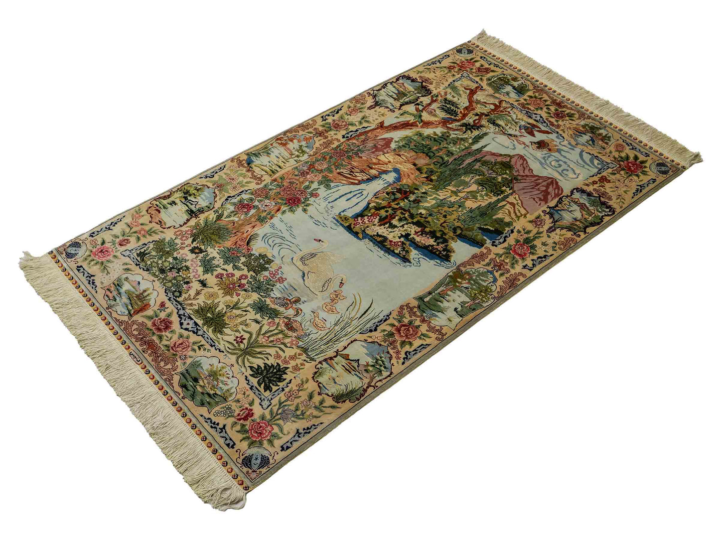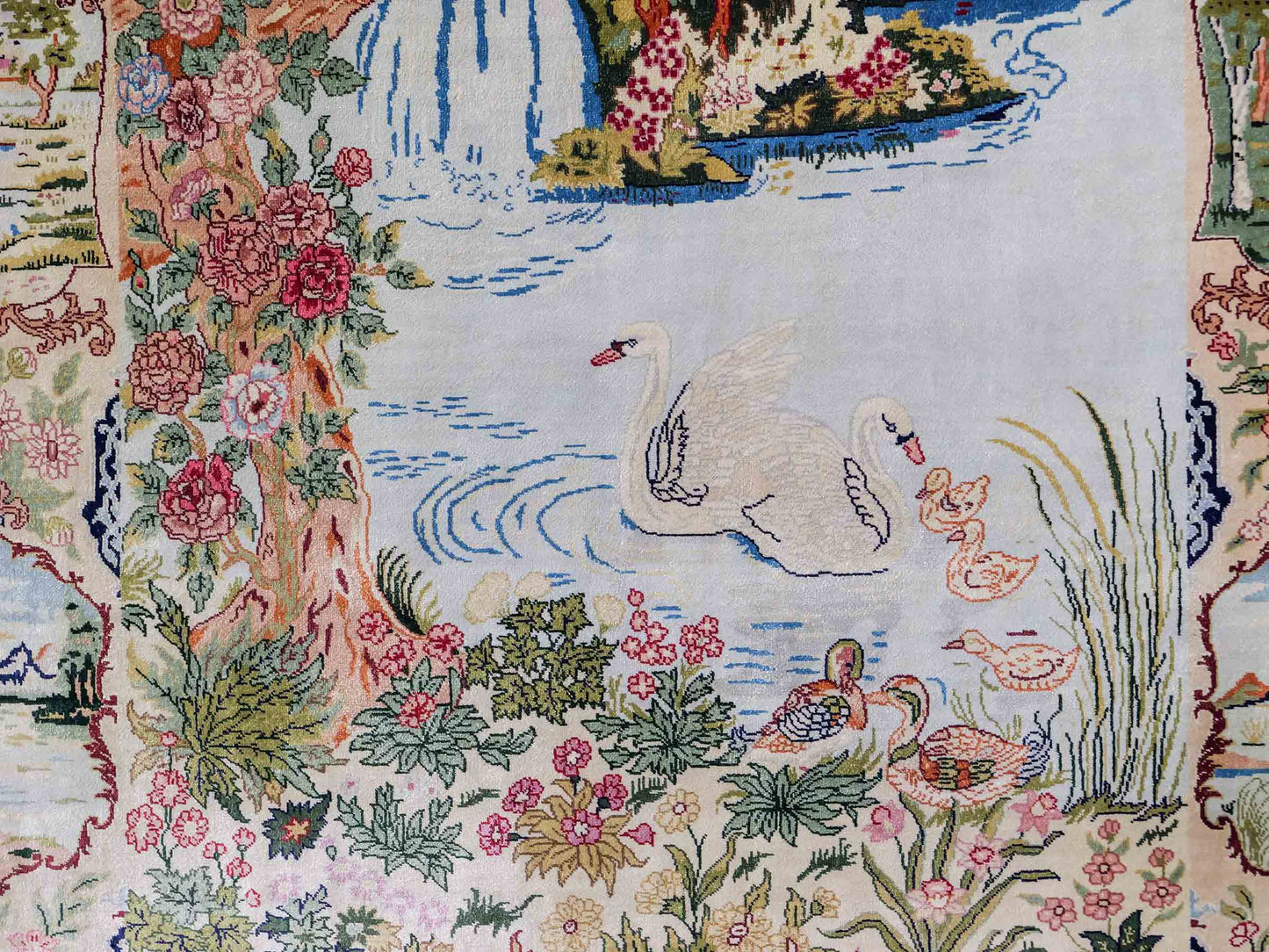 Der Flor und die Kette bestehen aus reiner Seide, was dem Teppich nicht nur einen unfassbaren Wert, eine unvergleichliche Haptik und atemberaubende Schönheit, sondern auch je nach Blickwinkel und Lichtverhältnis ein einzigartig schimmerndes Antlitz verleiht.