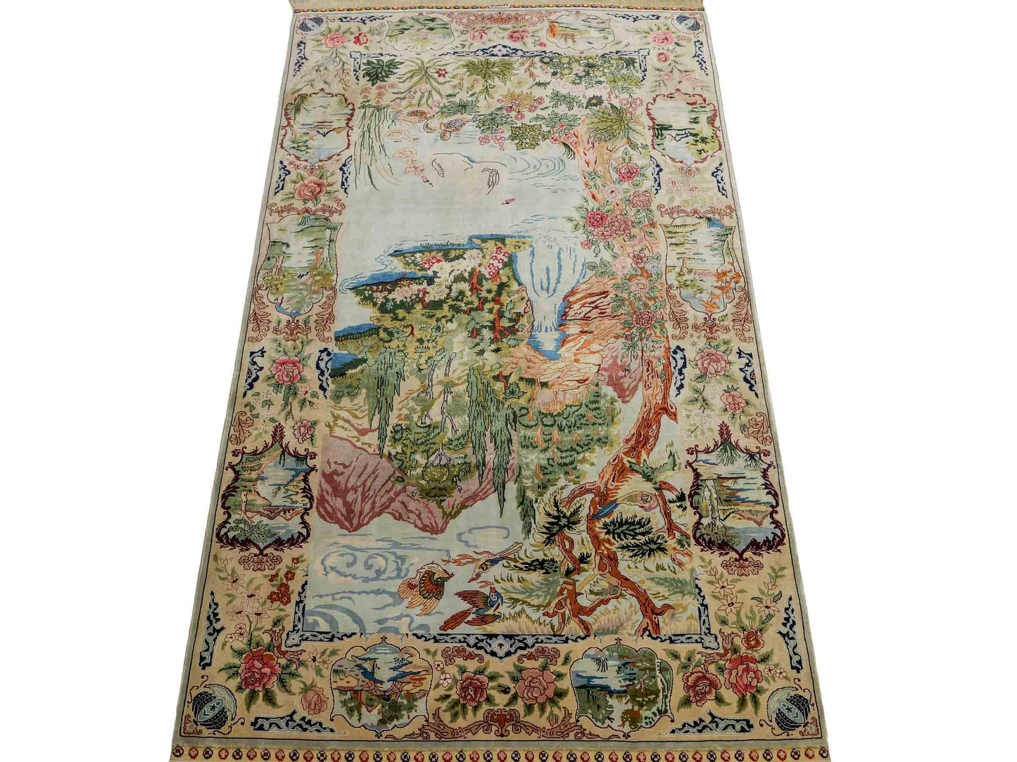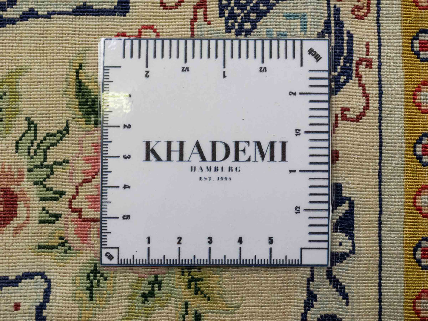 Bekannt durch die Seidenstraße blickt das Ursprungsland dieses aus chinesischer Meisterhand stammenden Unikats zurück auf eine überaus traditionsreiche Knüpfkultur. Neben seiner herausragenden Qualität und bemerkenswerten Anzahl an Knoten zeichnet sich dieses Exemplar durch sein zeitloses Ghom Design und seine Detailverliebtheit aus.