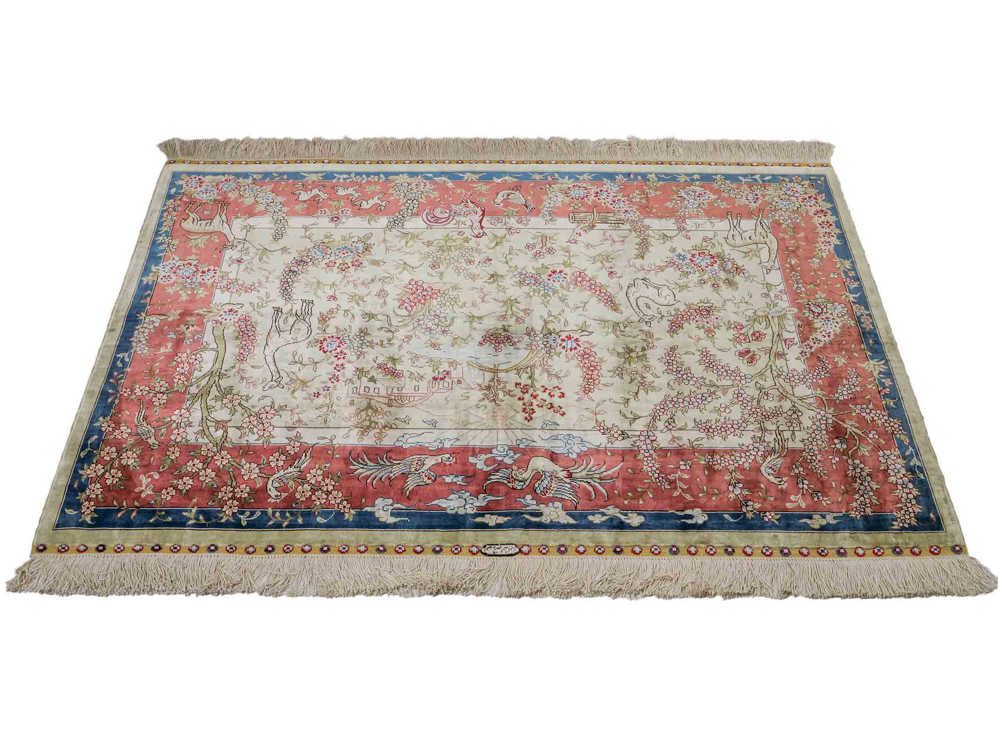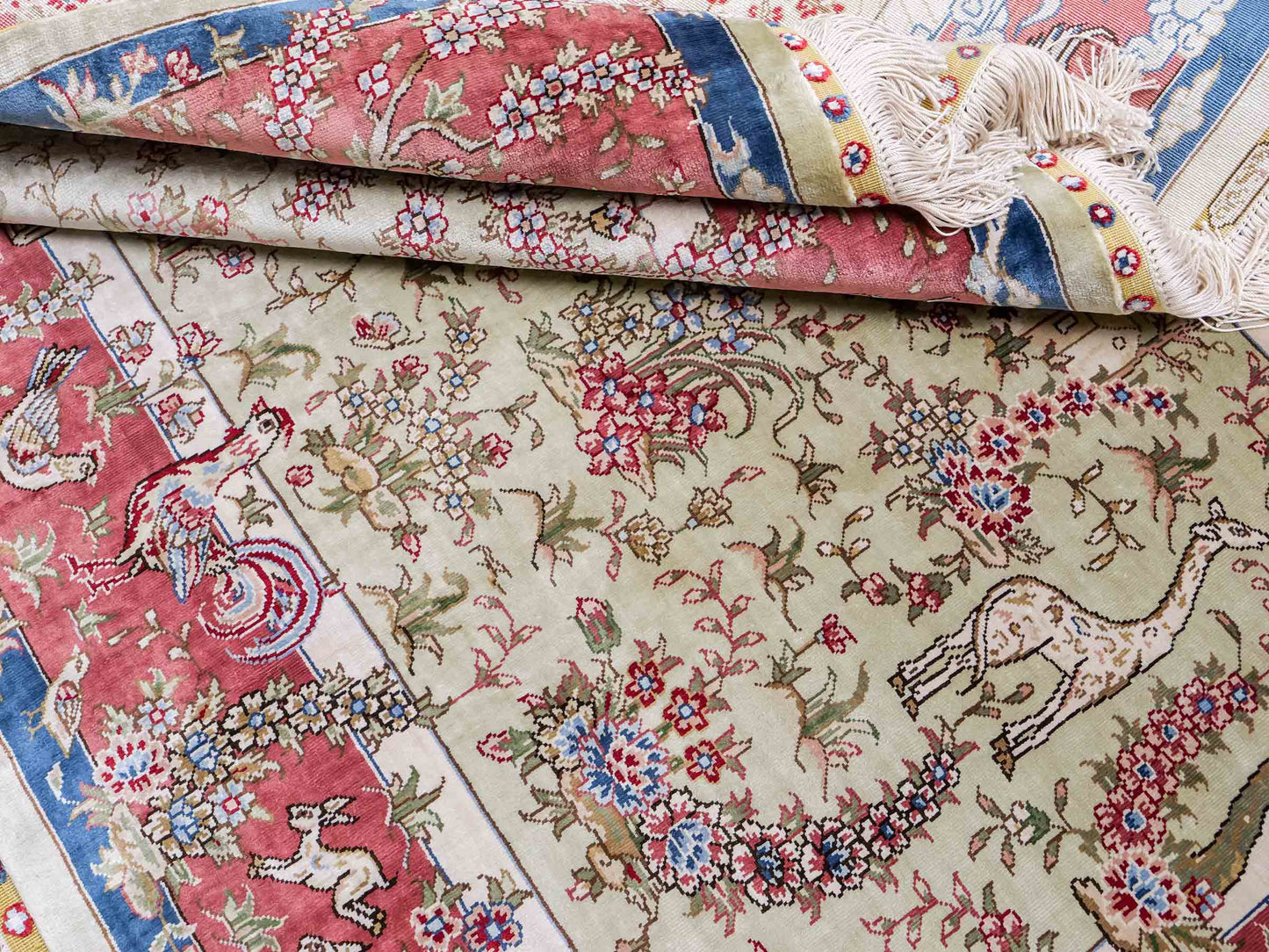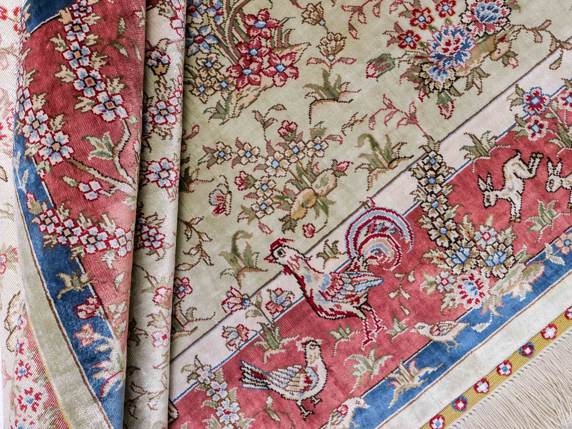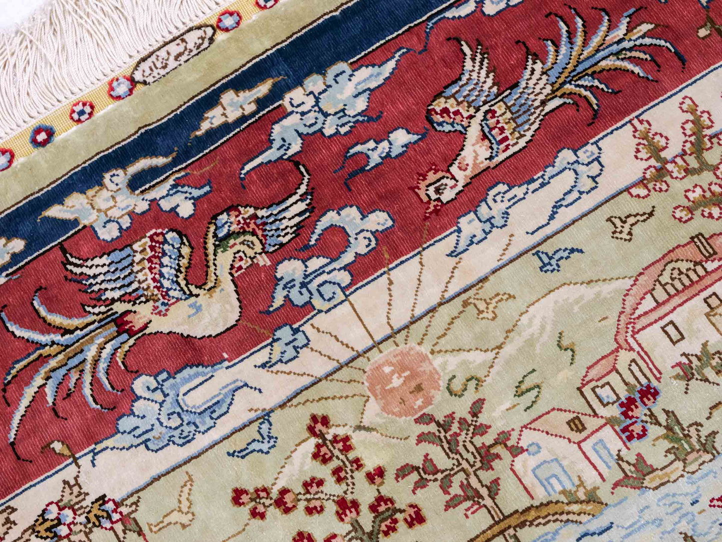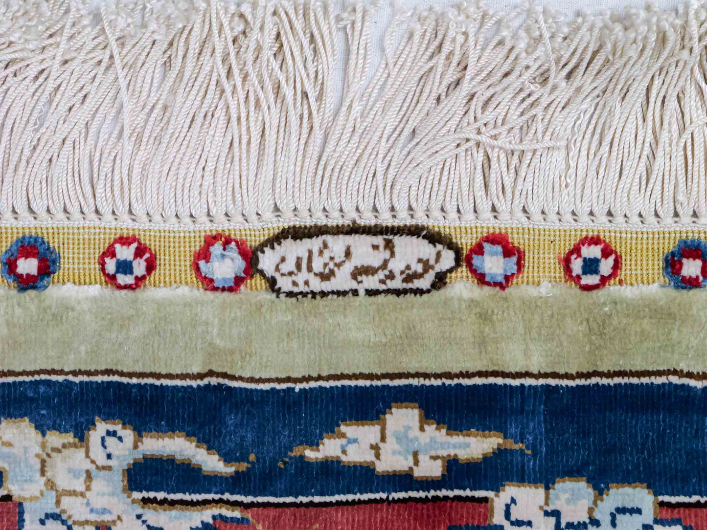 Der Flor und die Kette bestehen aus reiner Seide, was dem Teppich nicht nur einen unfassbaren Wert, eine unvergleichliche Haptik und atemberaubende Schönheit, sondern auch je nach Blickwinkel und Lichtverhältnis ein einzigartig schimmerndes Antlitz verleiht.
