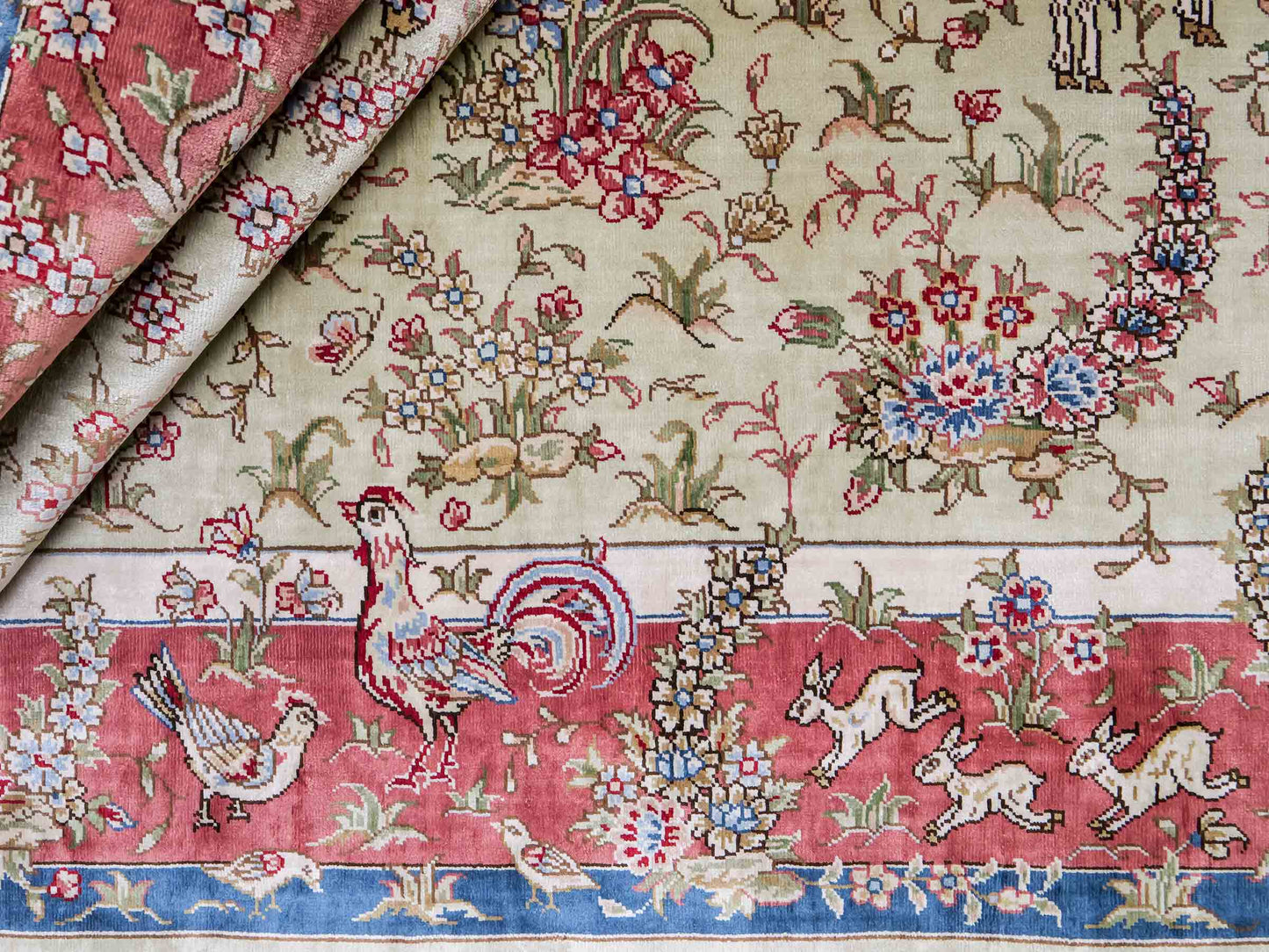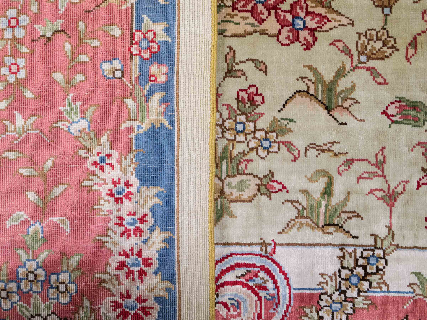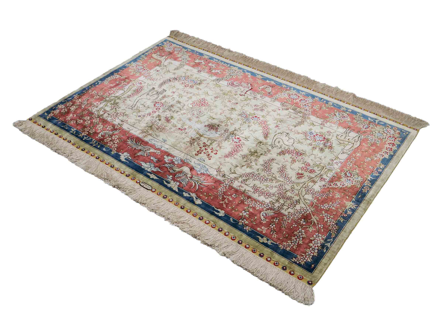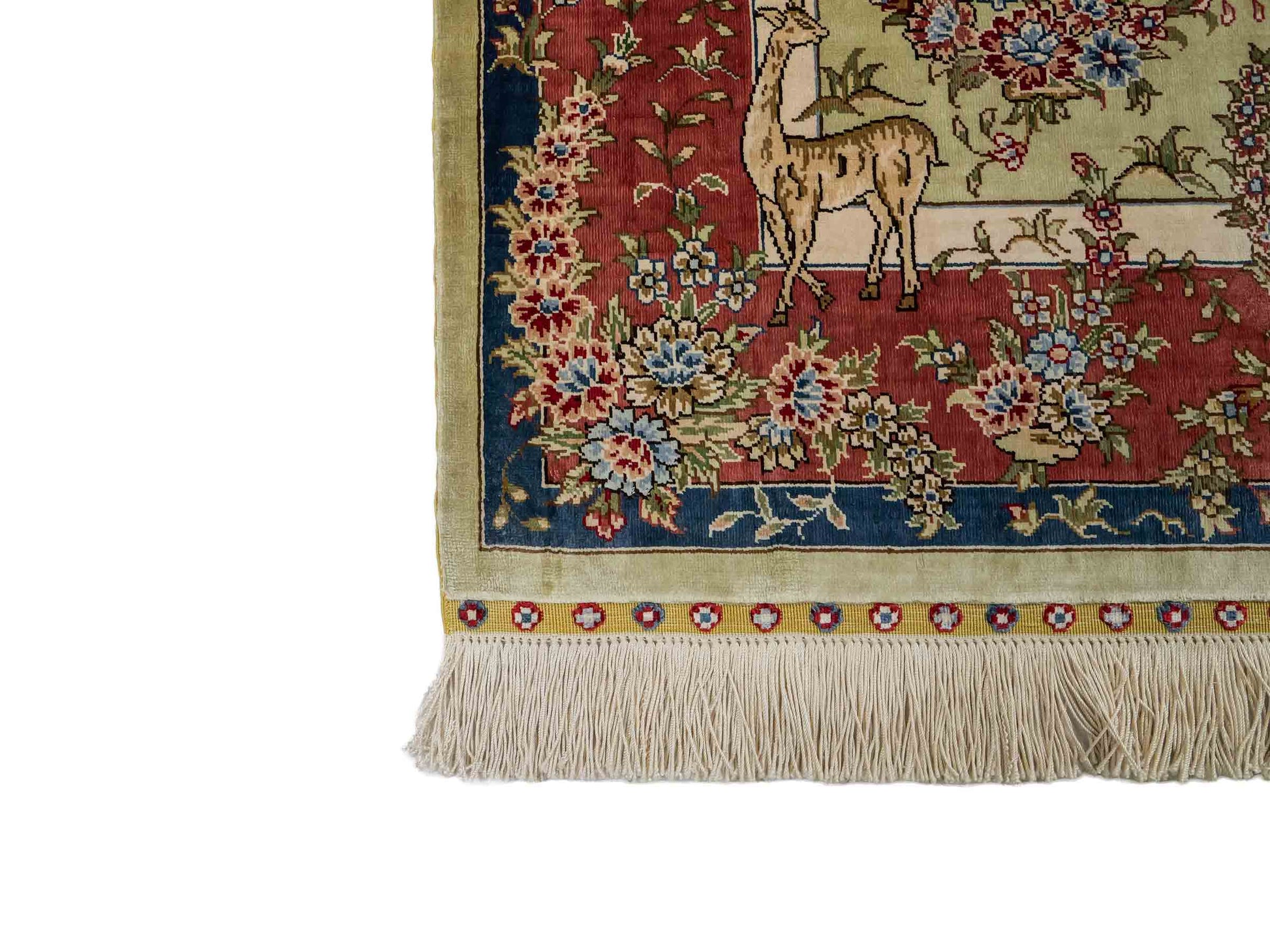 Der Flor und die Kette bestehen aus reiner Seide, was dem Teppich nicht nur einen unfassbaren Wert, eine unvergleichliche Haptik und atemberaubende Schönheit, sondern auch je nach Blickwinkel und Lichtverhältnis ein einzigartig schimmerndes Antlitz verleiht.