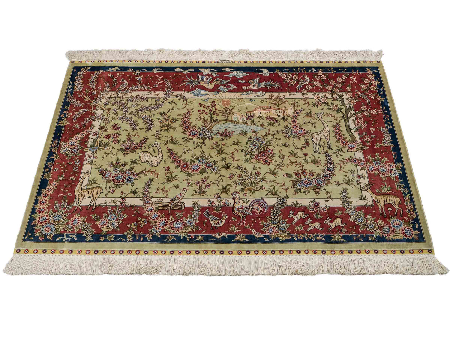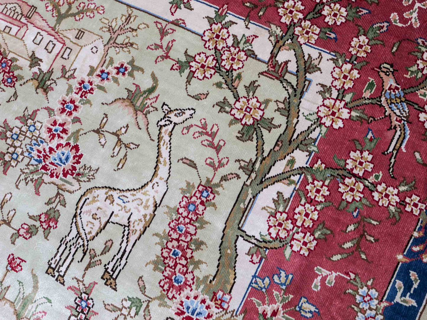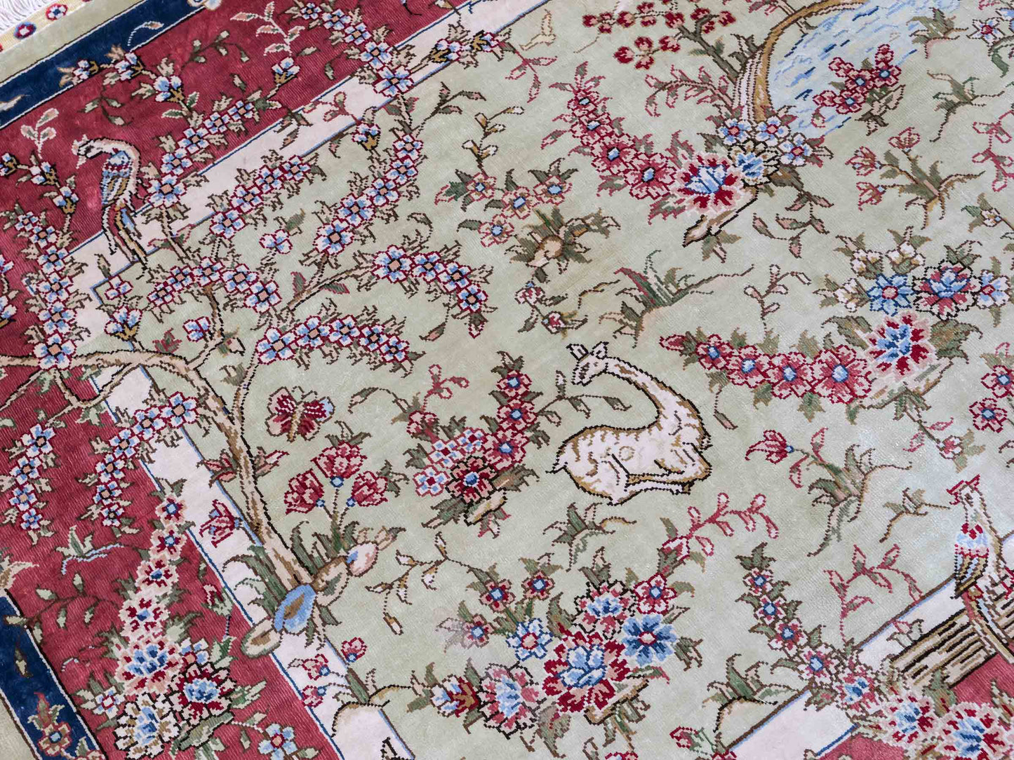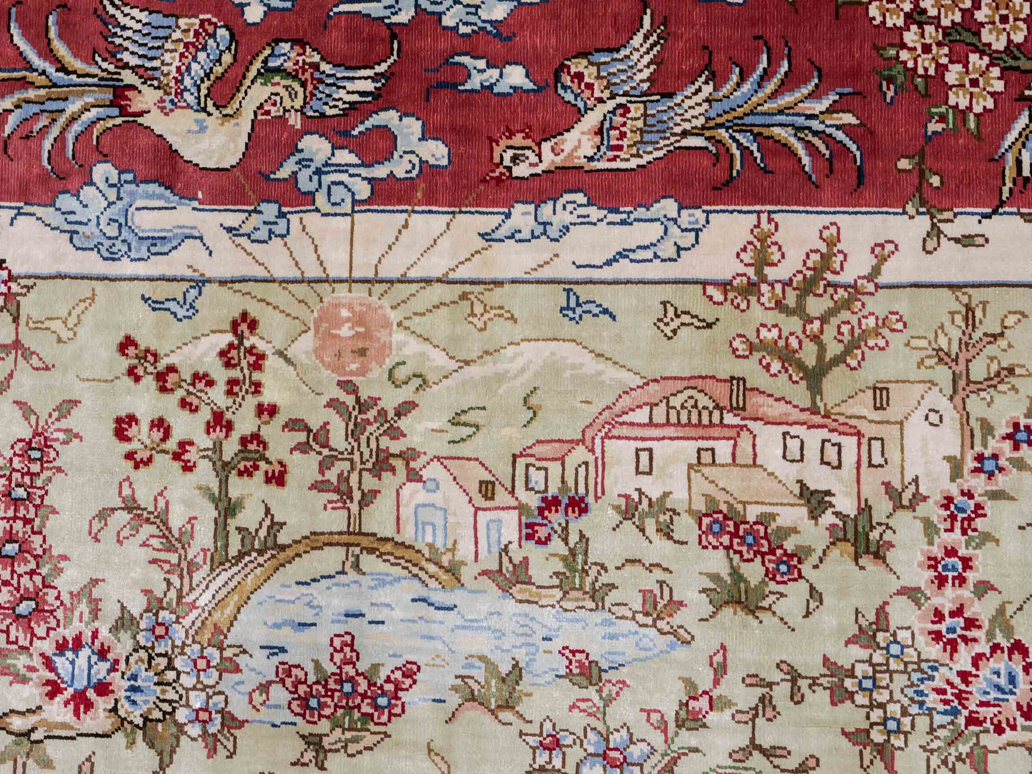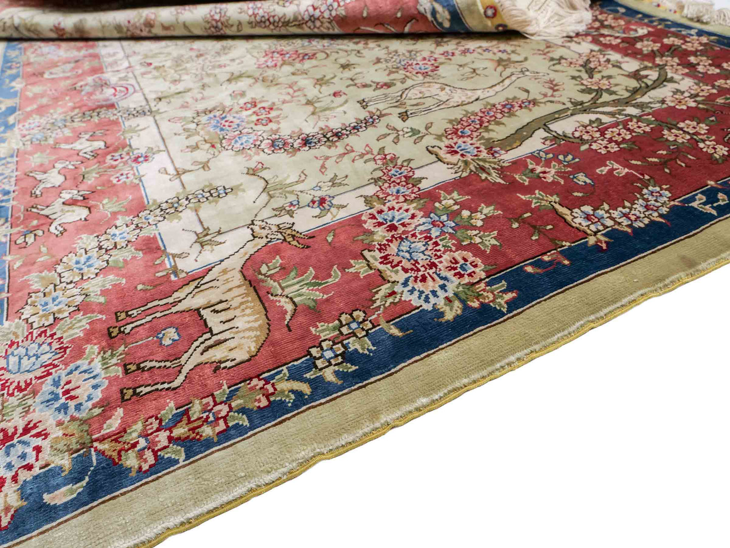 Der Flor und die Kette bestehen aus reiner Seide, was dem Teppich nicht nur einen unfassbaren Wert, eine unvergleichliche Haptik und atemberaubende Schönheit, sondern auch je nach Blickwinkel und Lichtverhältnis ein einzigartig schimmerndes Antlitz verleiht.