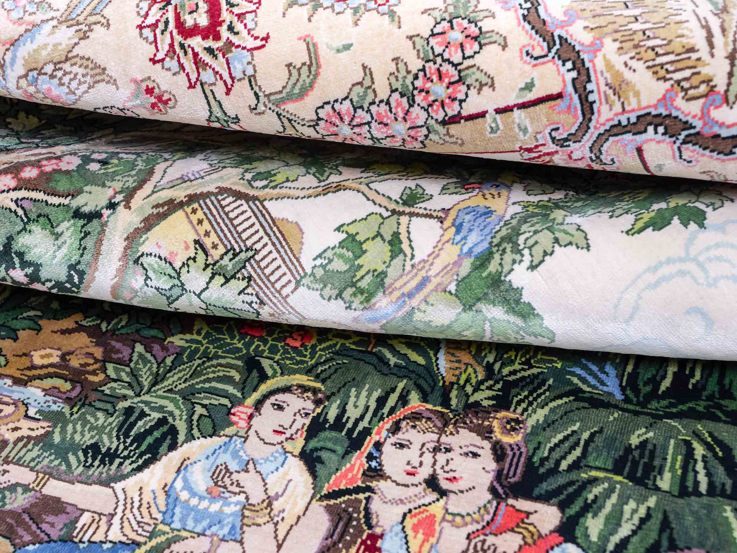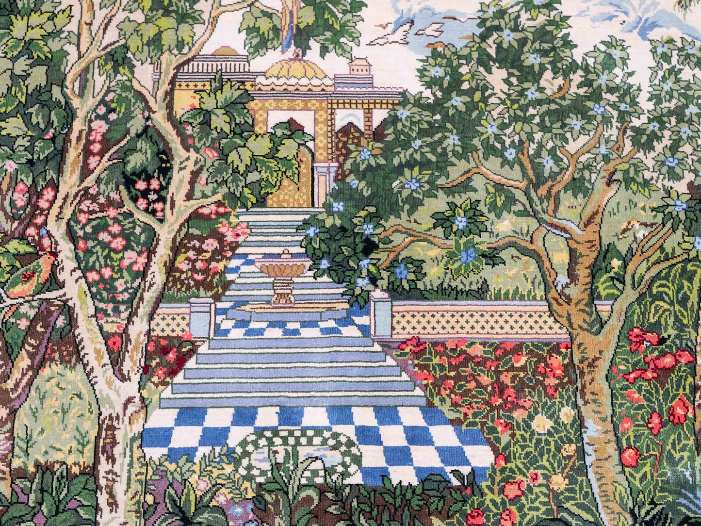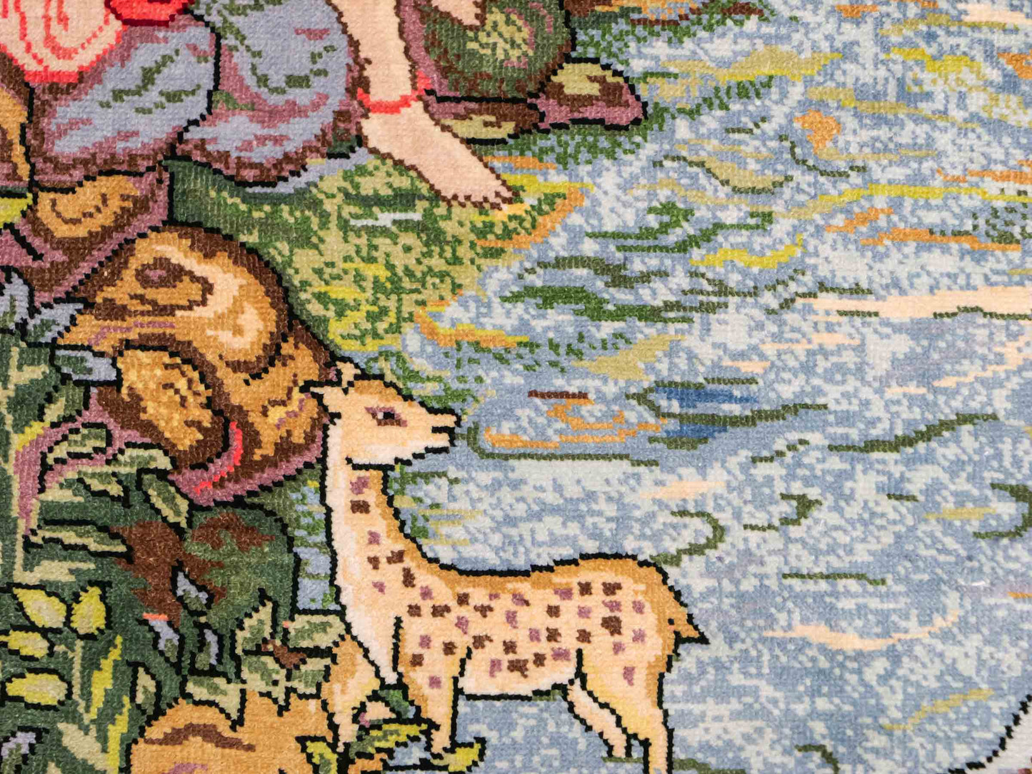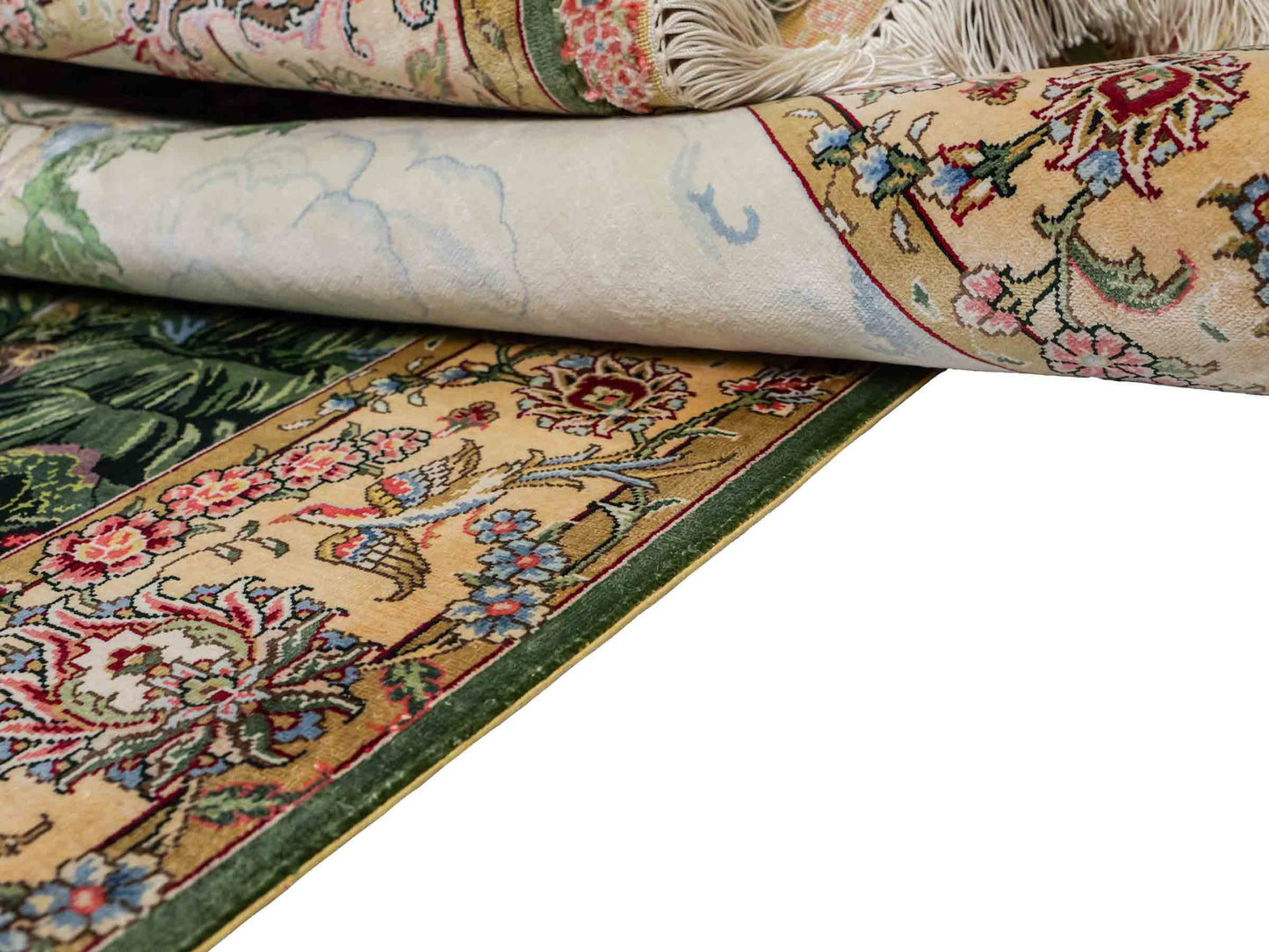Der Flor und die Kette bestehen aus reiner Seide, was dem Teppich nicht nur einen unfassbaren Wert, eine unvergleichliche Haptik und atemberaubende Schönheit, sondern auch je nach Blickwinkel und Lichtverhältnis ein einzigartig schimmerndes Antlitz verleiht.