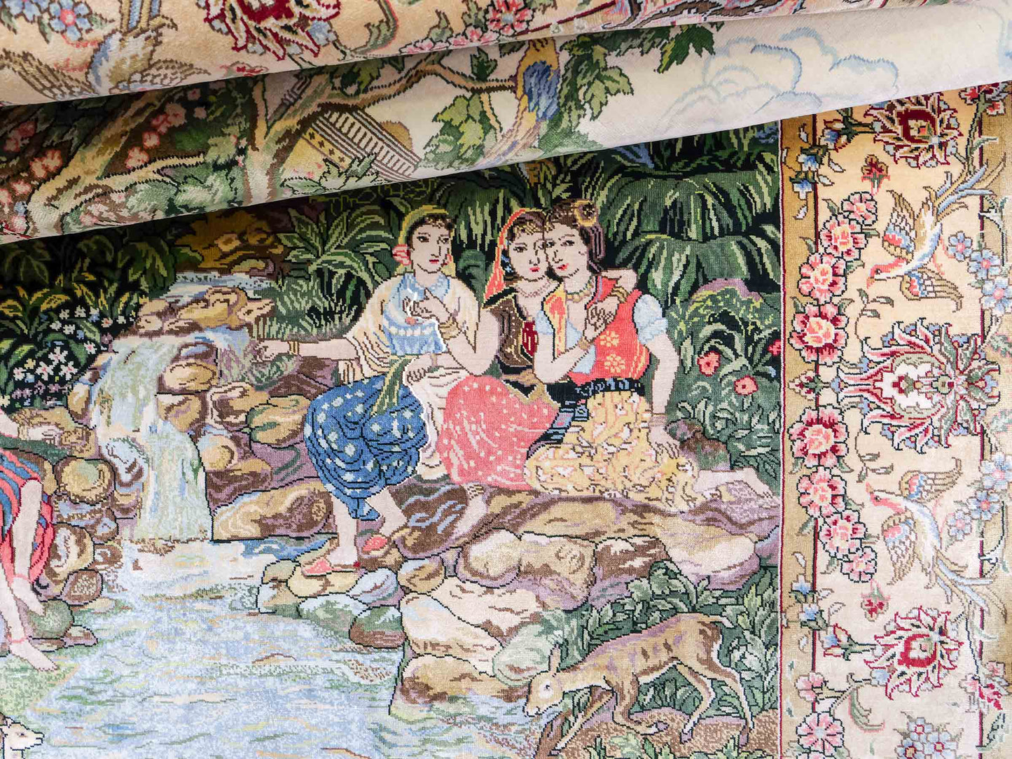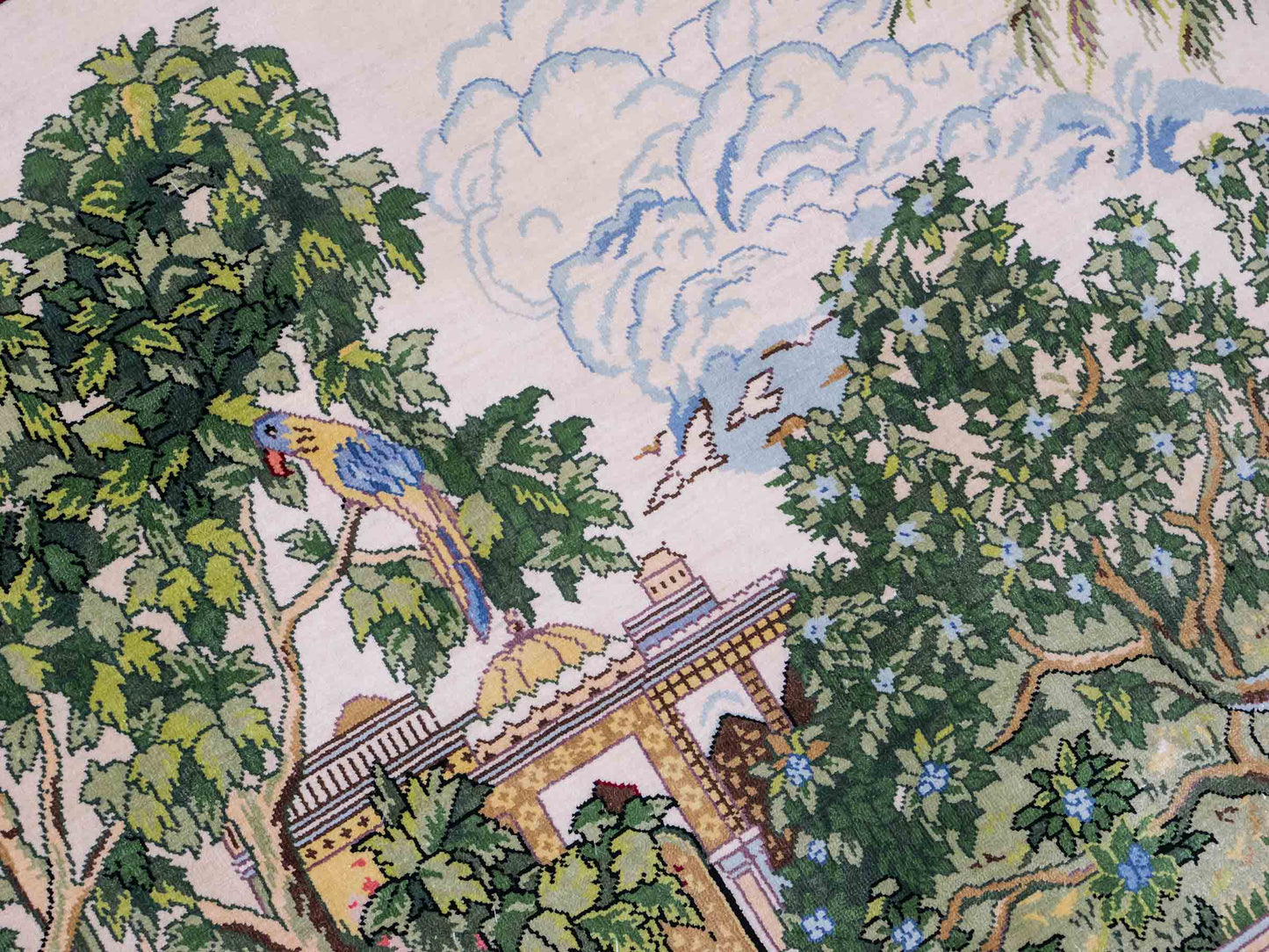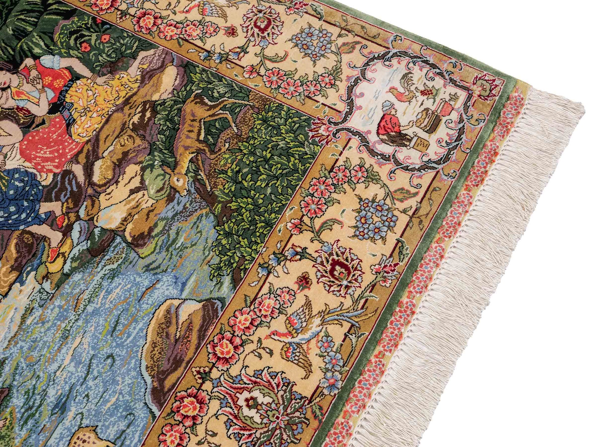 Der Flor und die Kette bestehen aus reiner Seide, was dem Teppich nicht nur einen unfassbaren Wert, eine unvergleichliche Haptik und atemberaubende Schönheit, sondern auch je nach Blickwinkel und Lichtverhältnis ein einzigartig schimmerndes Antlitz verleiht.