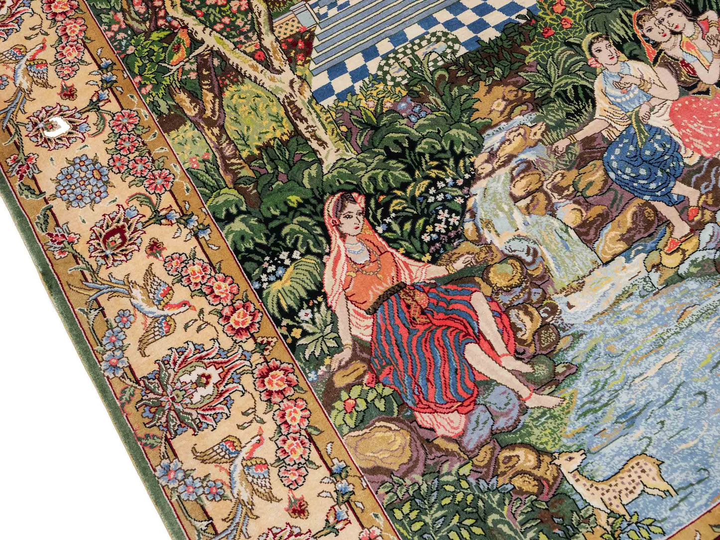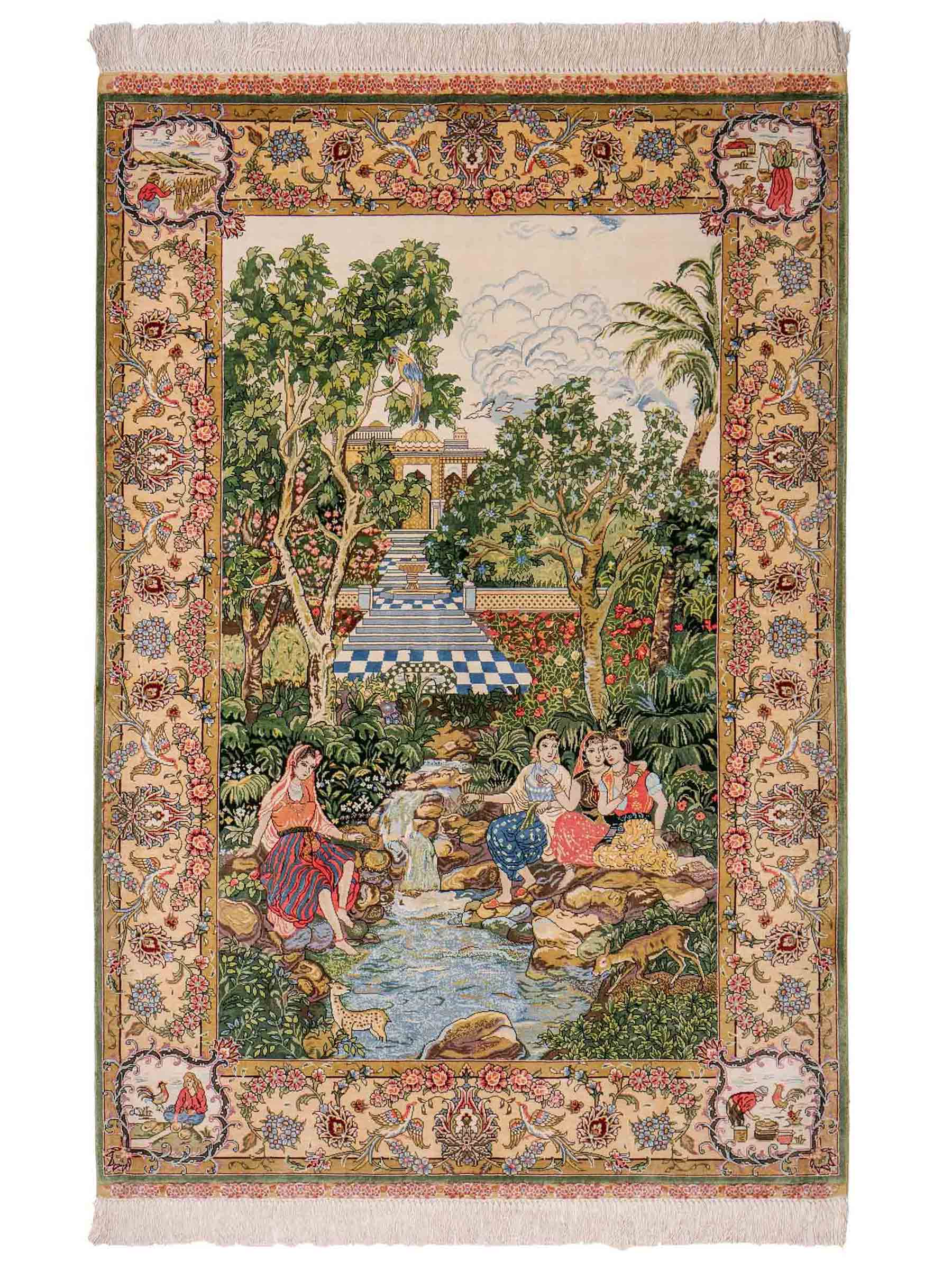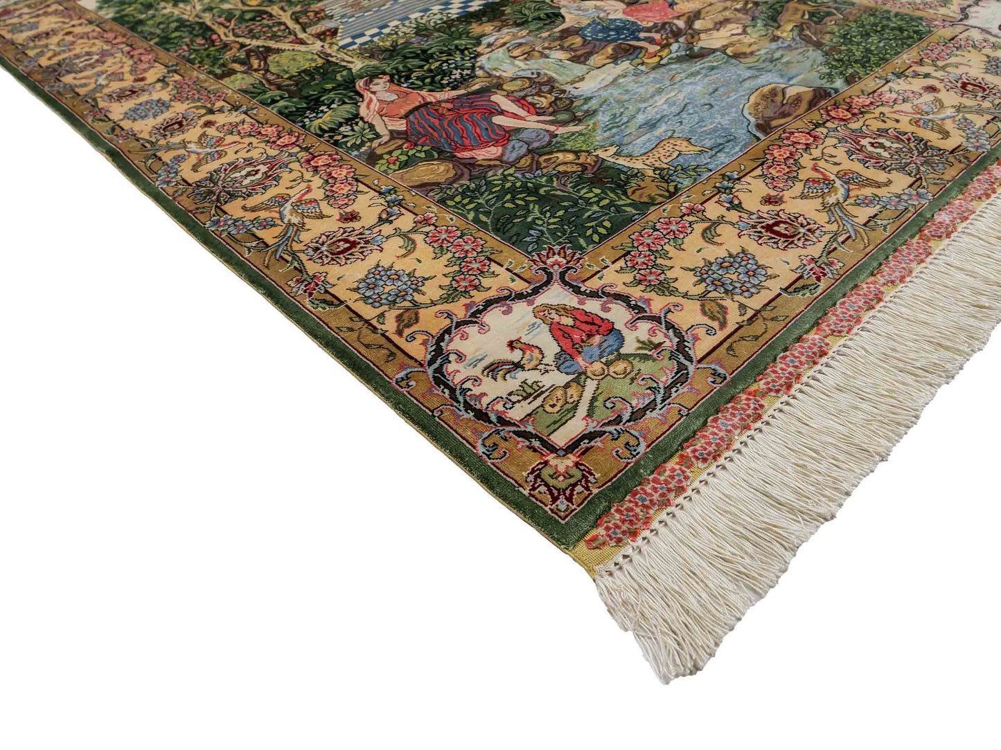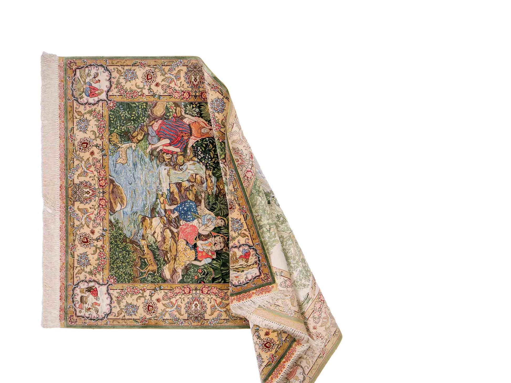 Der Flor und die Kette bestehen aus reiner Seide, was dem Teppich nicht nur einen unfassbaren Wert, eine unvergleichliche Haptik und atemberaubende Schönheit, sondern auch je nach Blickwinkel und Lichtverhältnis ein einzigartig schimmerndes Antlitz verleiht.