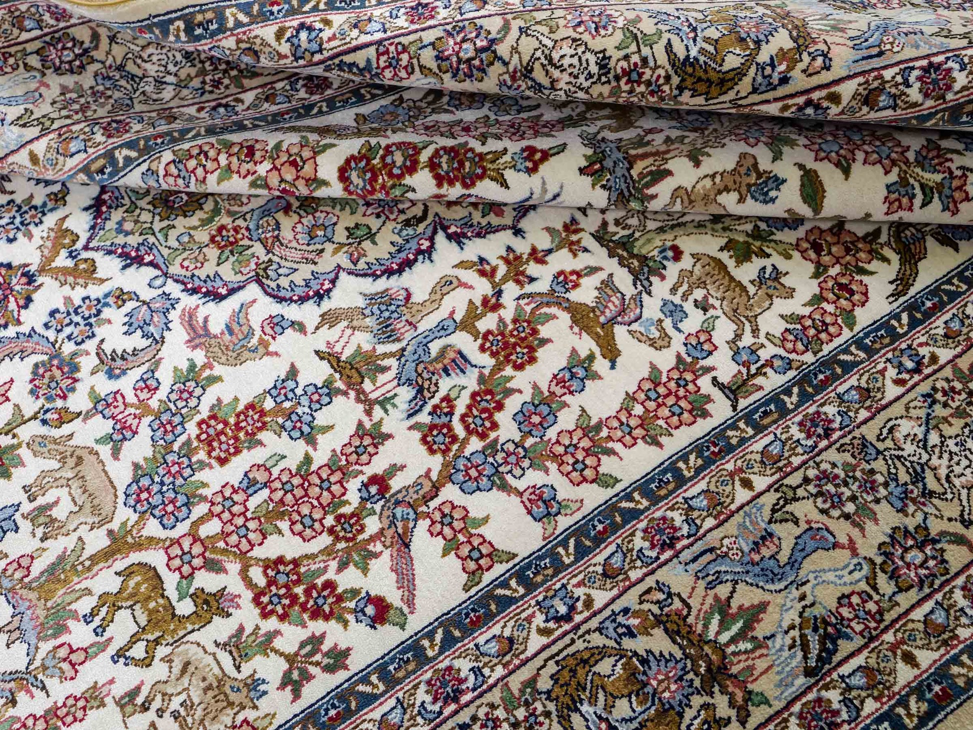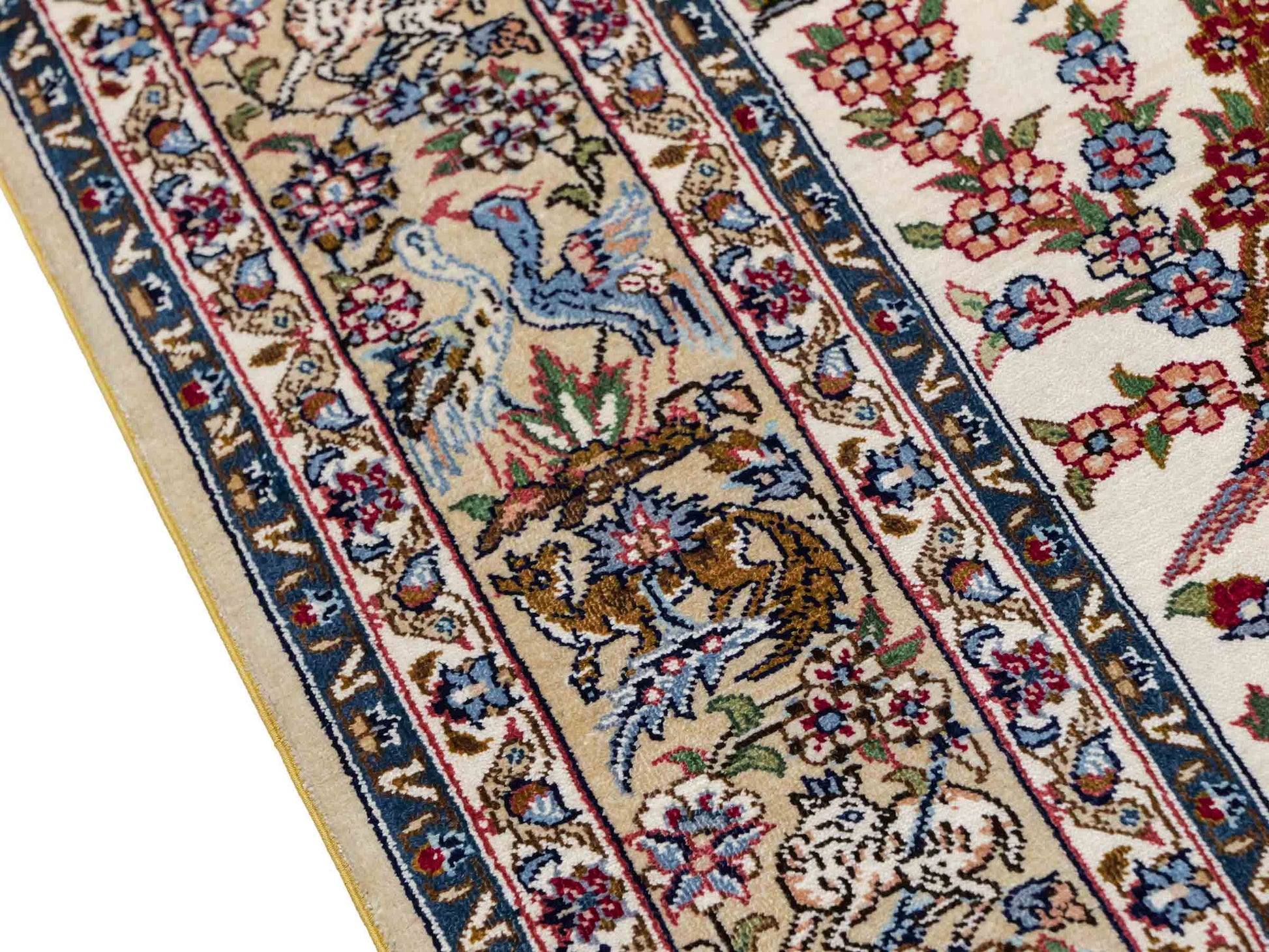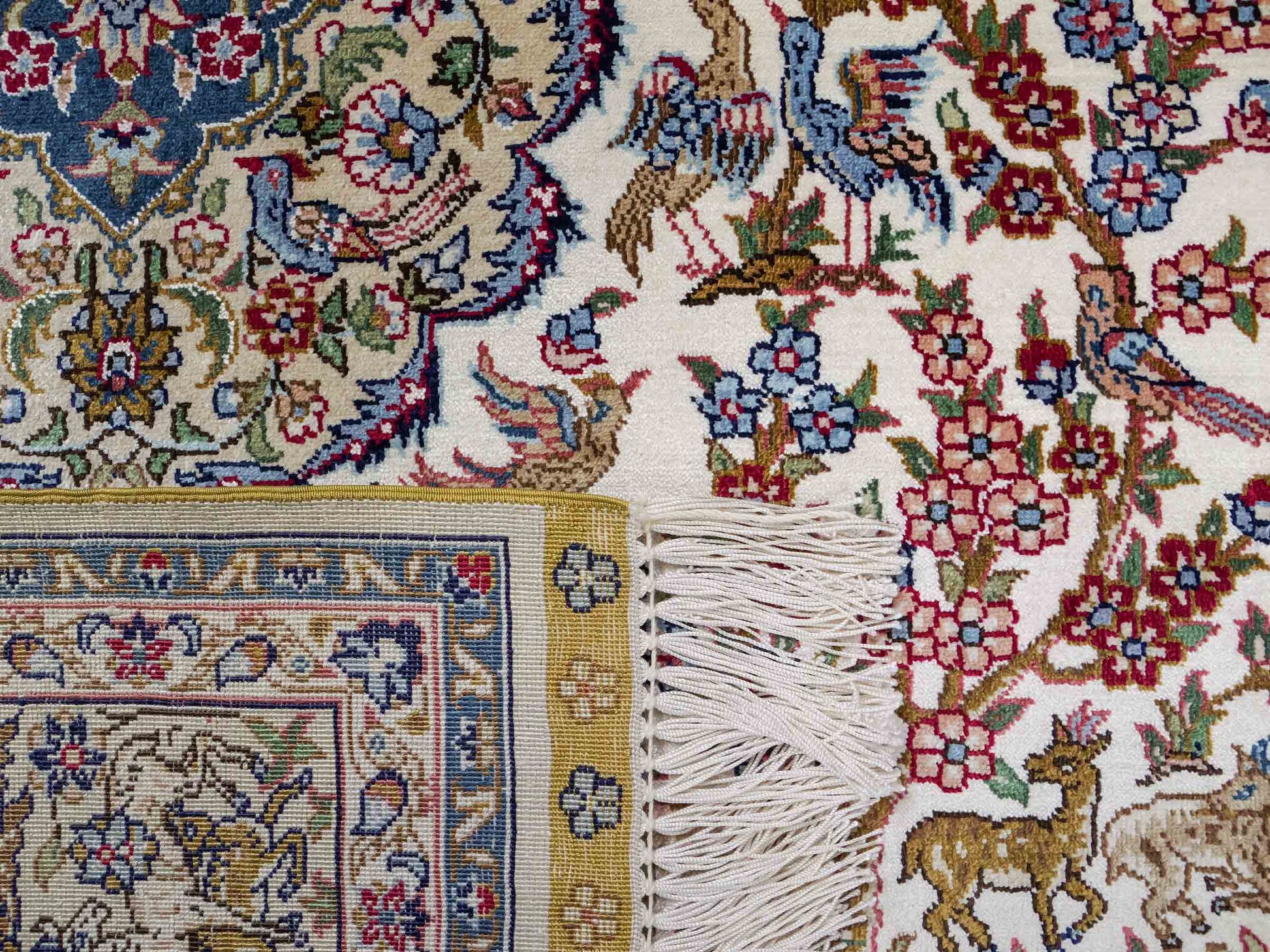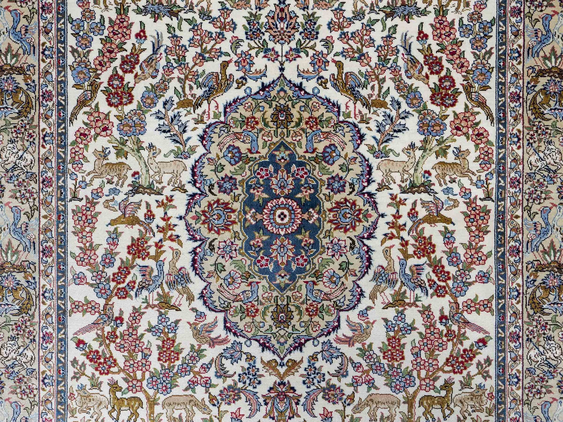 Der Flor und die Kette bestehen aus reiner Seide, was dem Teppich nicht nur einen unfassbaren Wert, eine unvergleichliche Haptik und atemberaubende Schönheit, sondern auch je nach Blickwinkel und Lichtverhältnis ein einzigartig schimmerndes Antlitz verleiht.