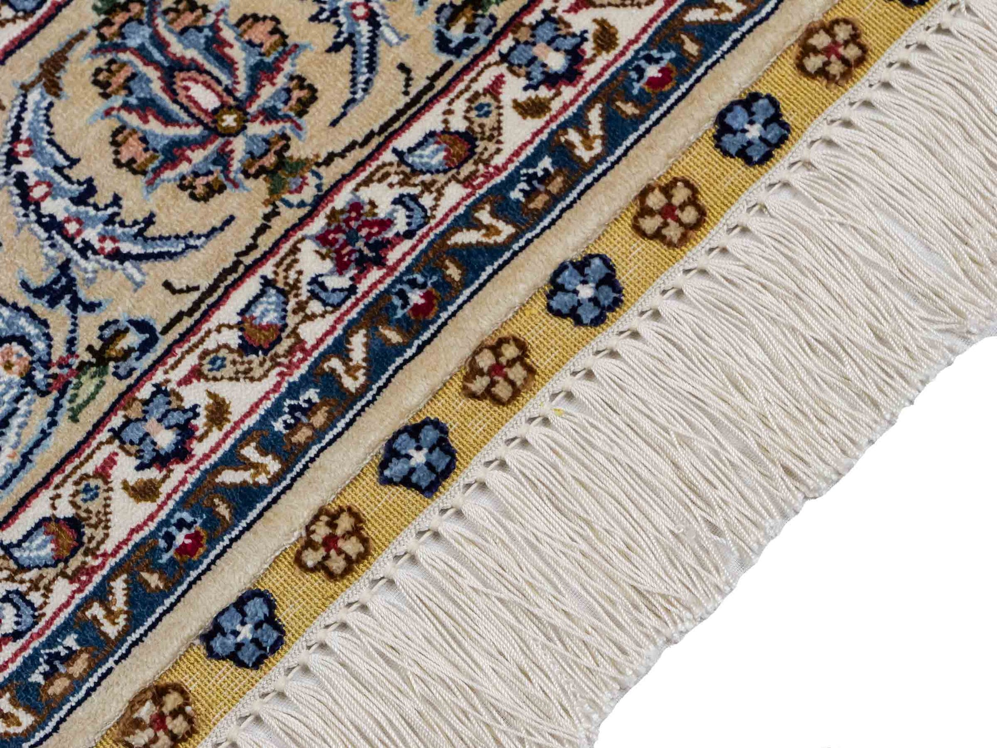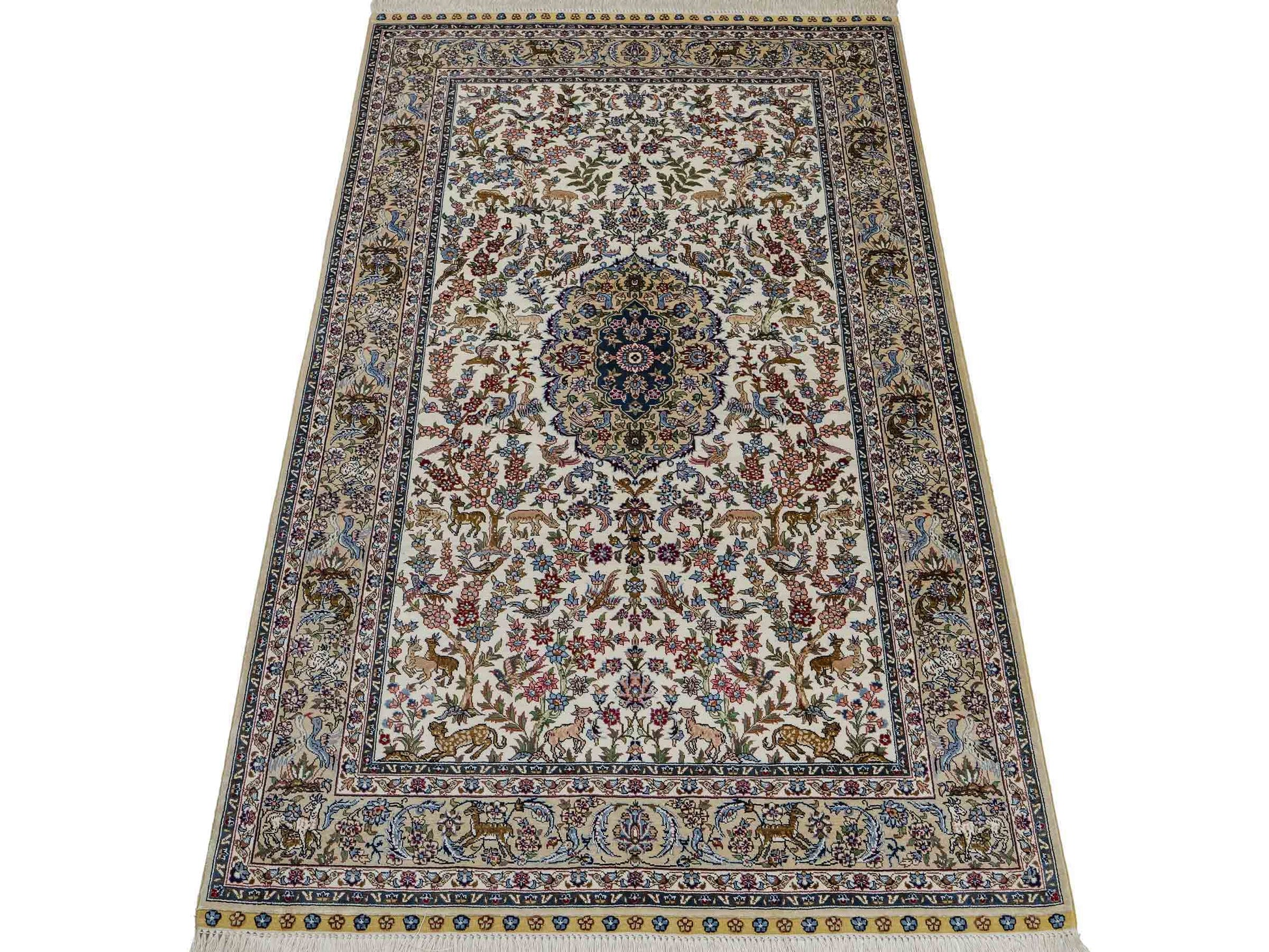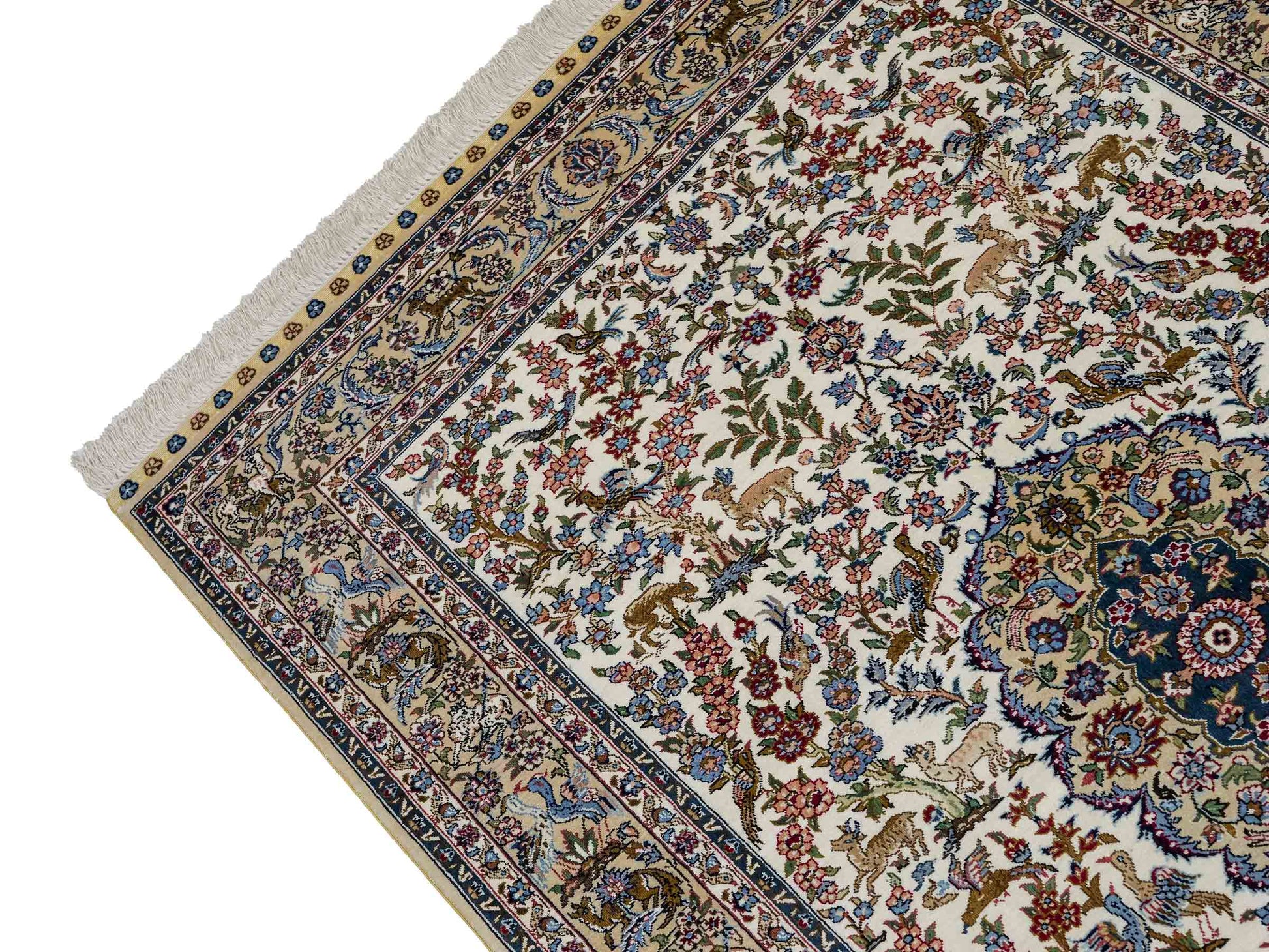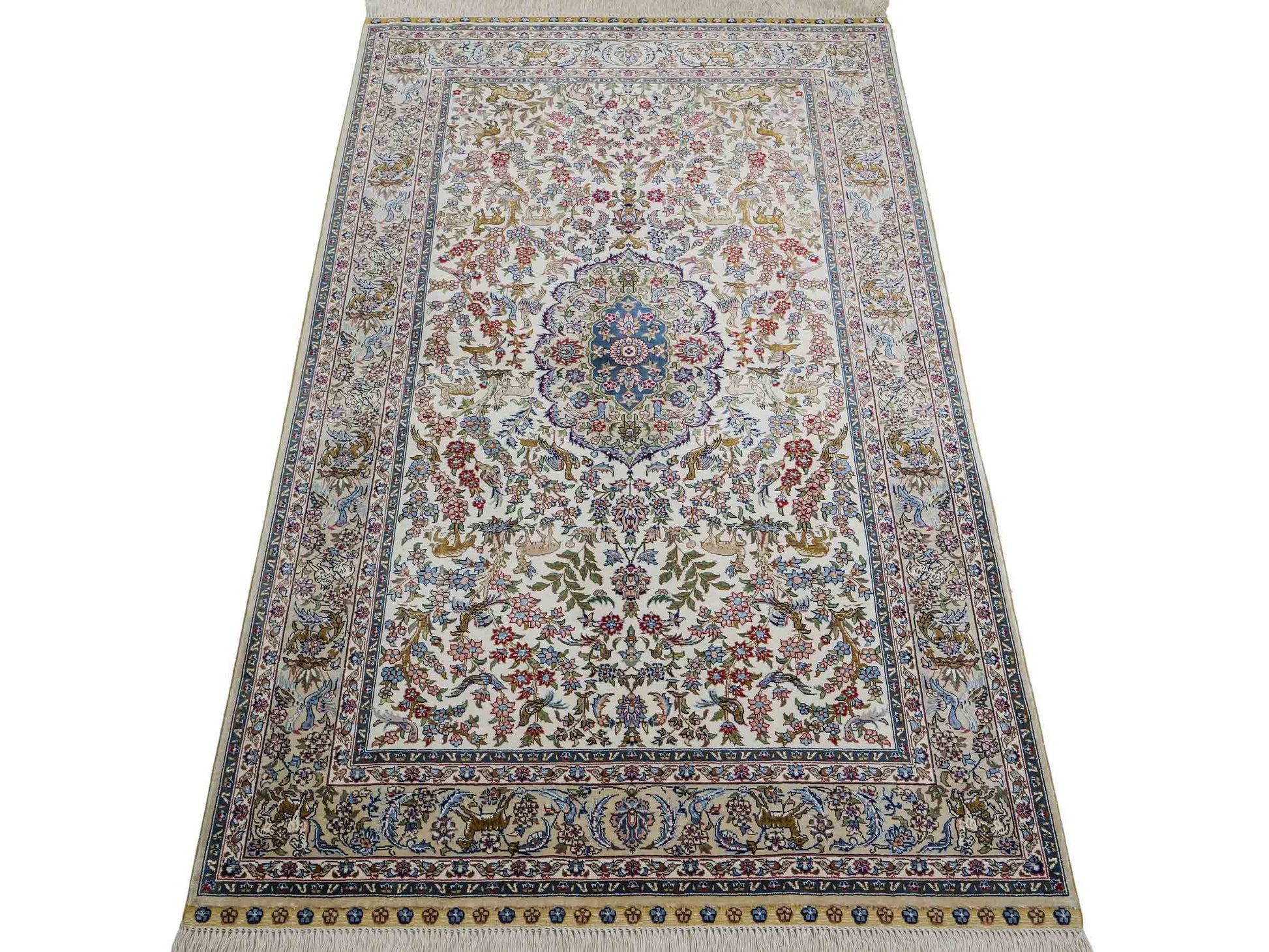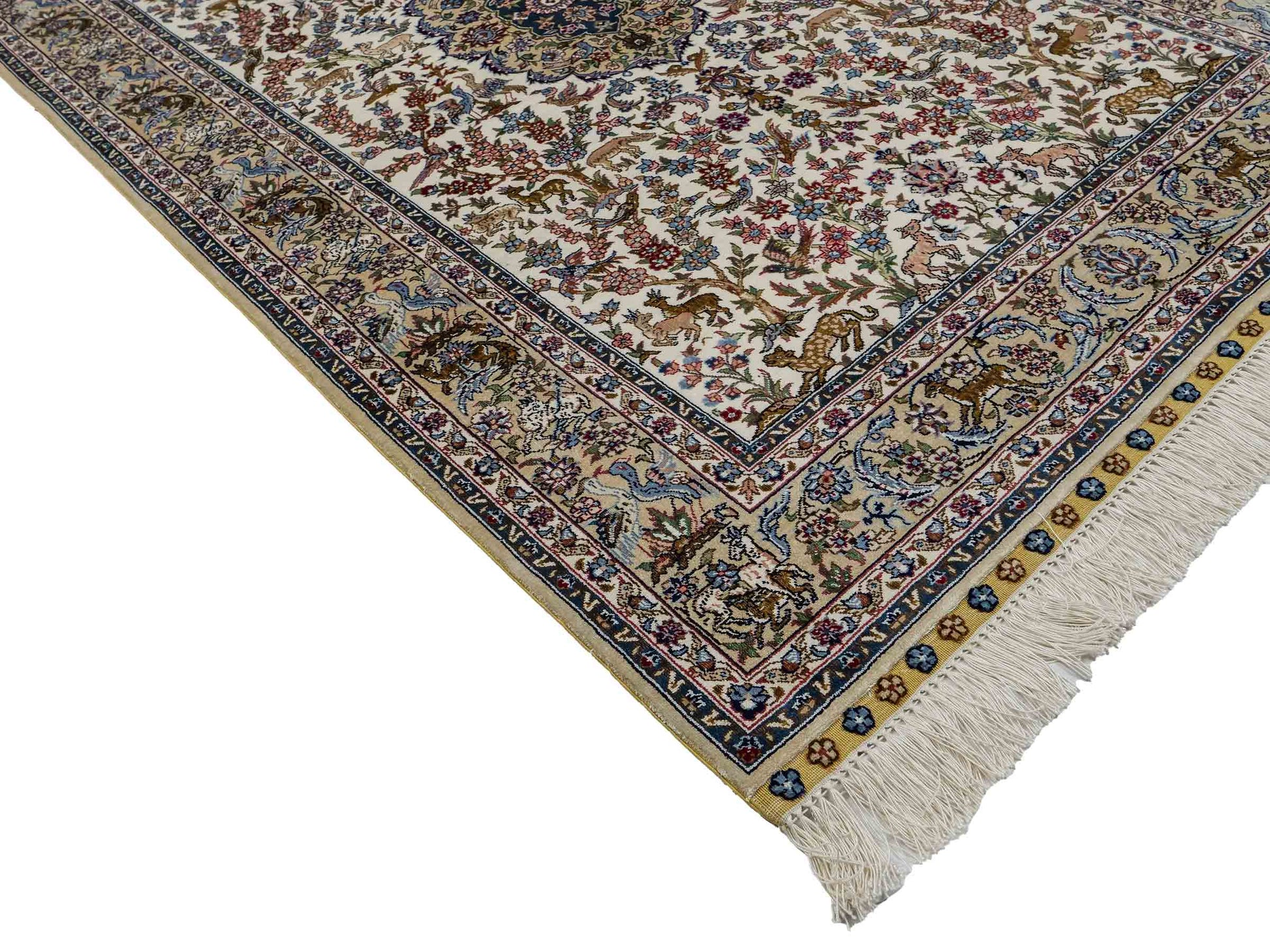 Der Flor und die Kette bestehen aus reiner Seide, was dem Teppich nicht nur einen unfassbaren Wert, eine unvergleichliche Haptik und atemberaubende Schönheit, sondern auch je nach Blickwinkel und Lichtverhältnis ein einzigartig schimmerndes Antlitz verleiht.