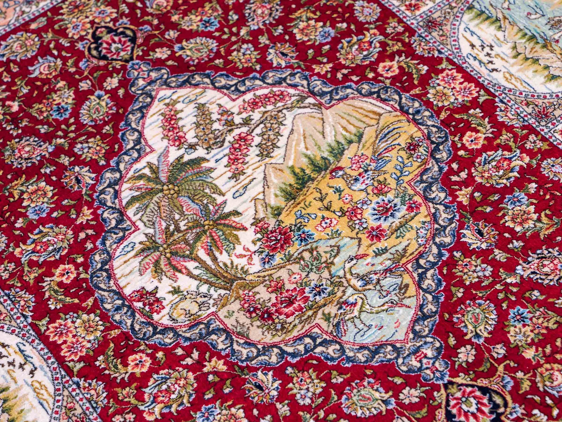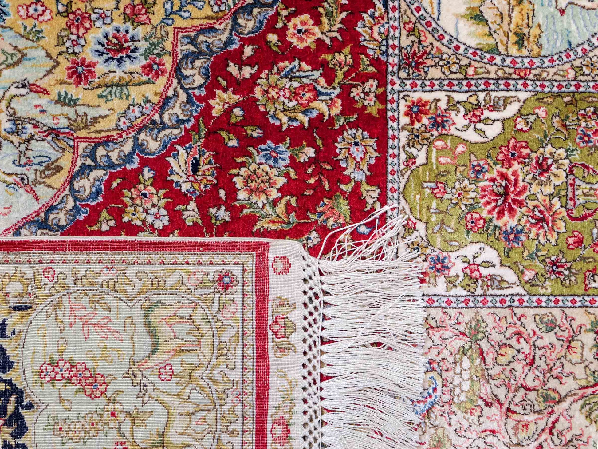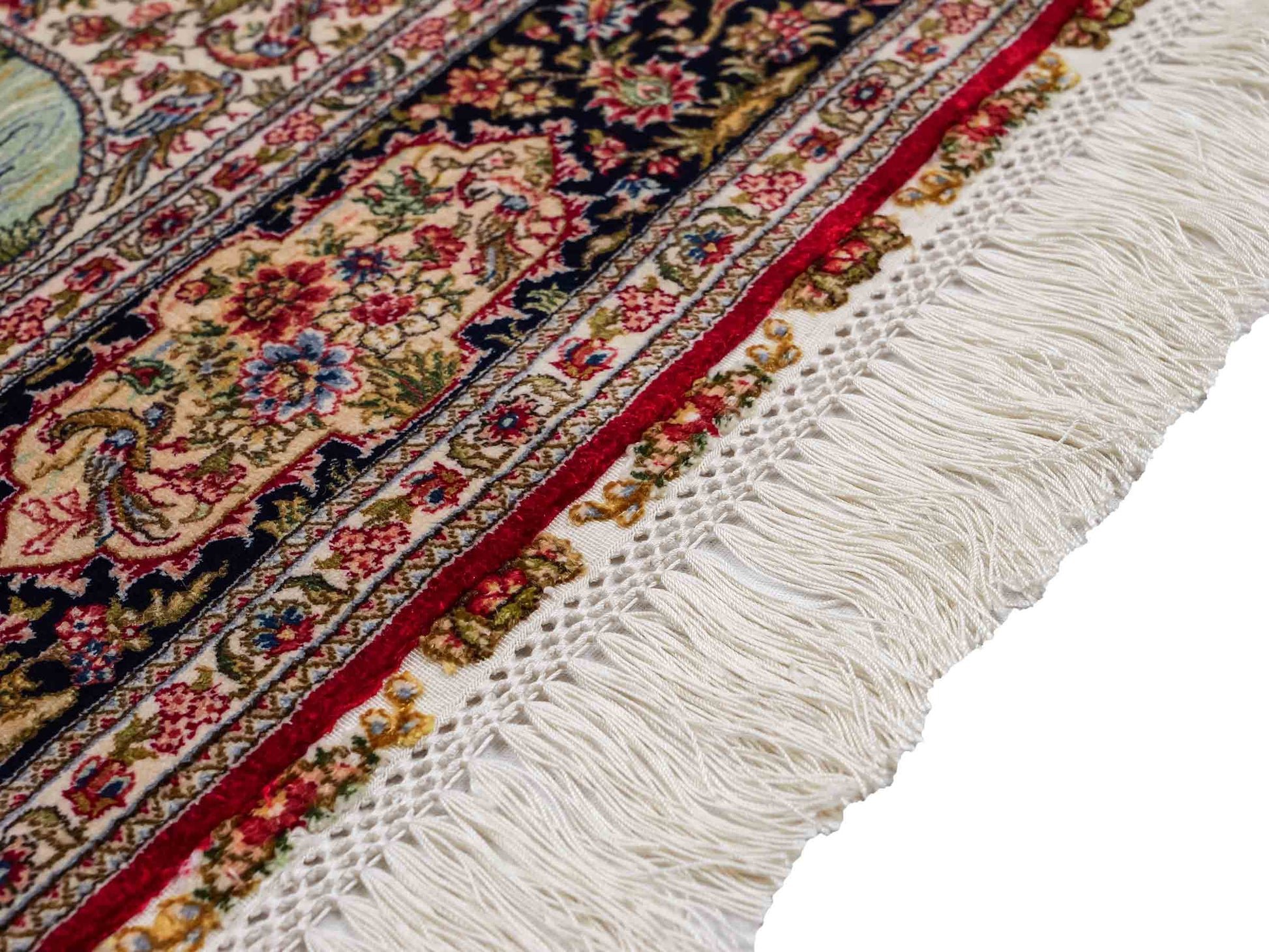 Der Flor und die Kette bestehen aus reiner Seide, was dem Teppich nicht nur einen unfassbaren Wert, eine unvergleichliche Haptik und atemberaubende Schönheit, sondern auch je nach Blickwinkel und Lichtverhältnis ein einzigartig schimmerndes Antlitz verleiht.
