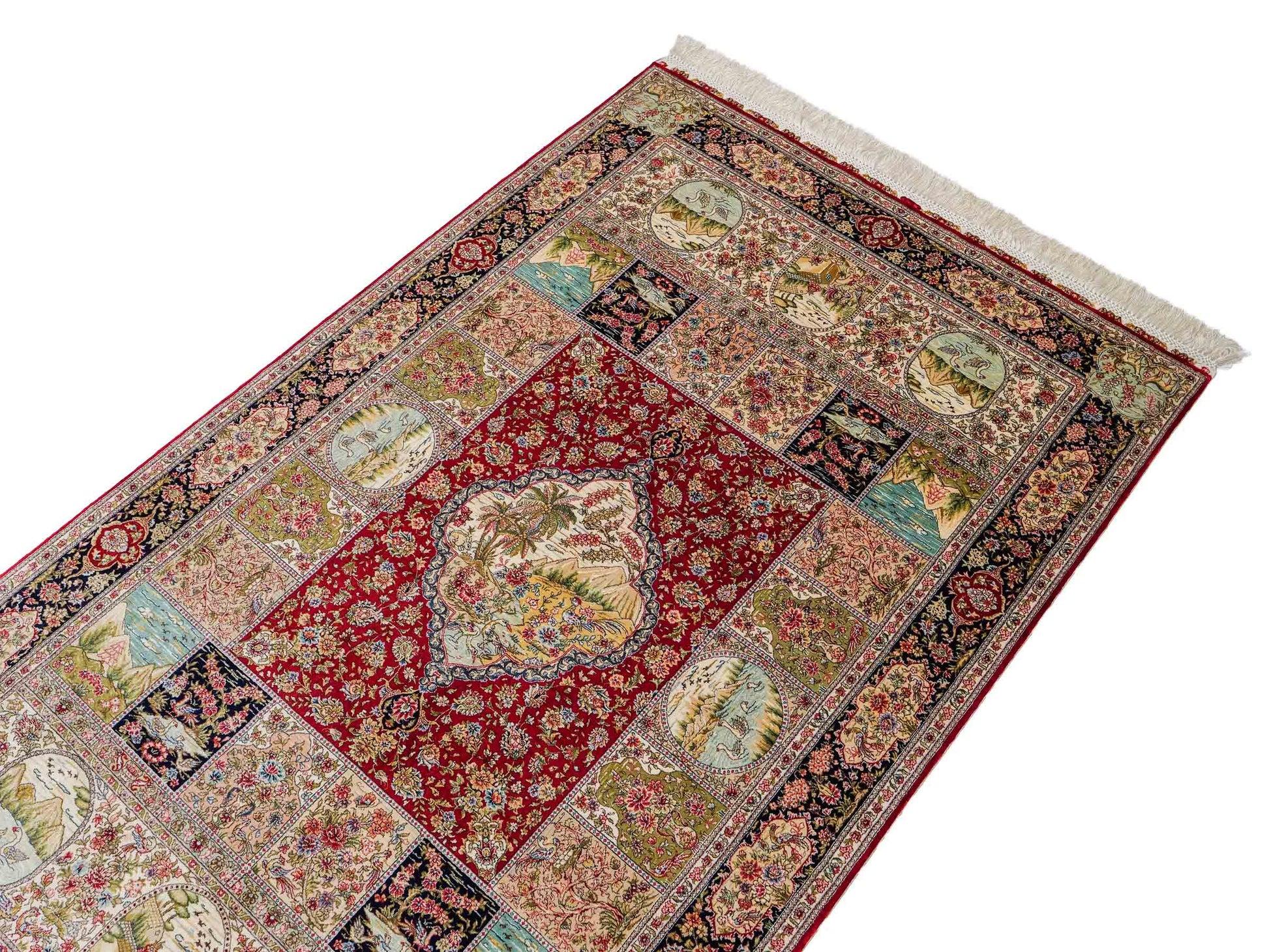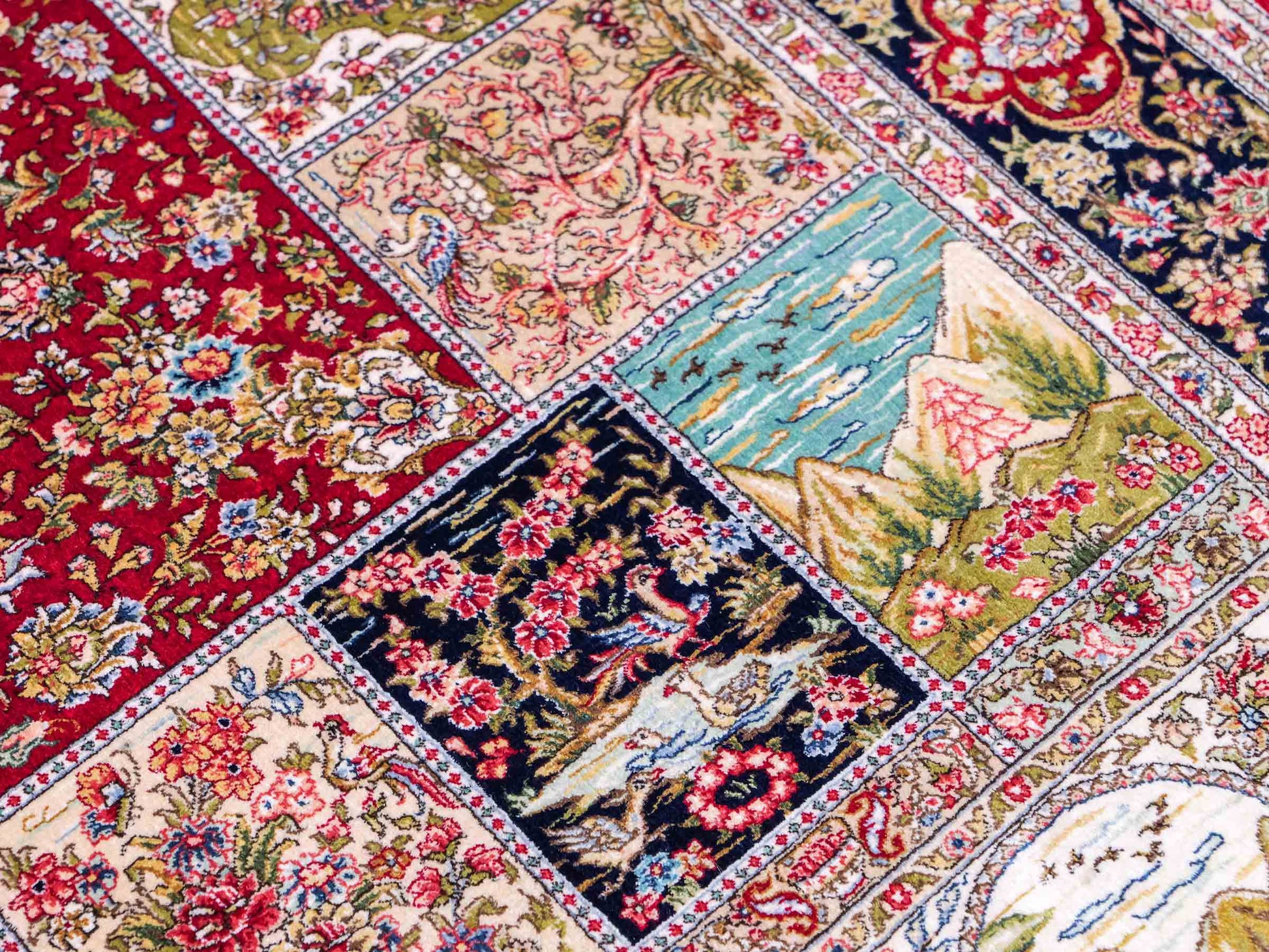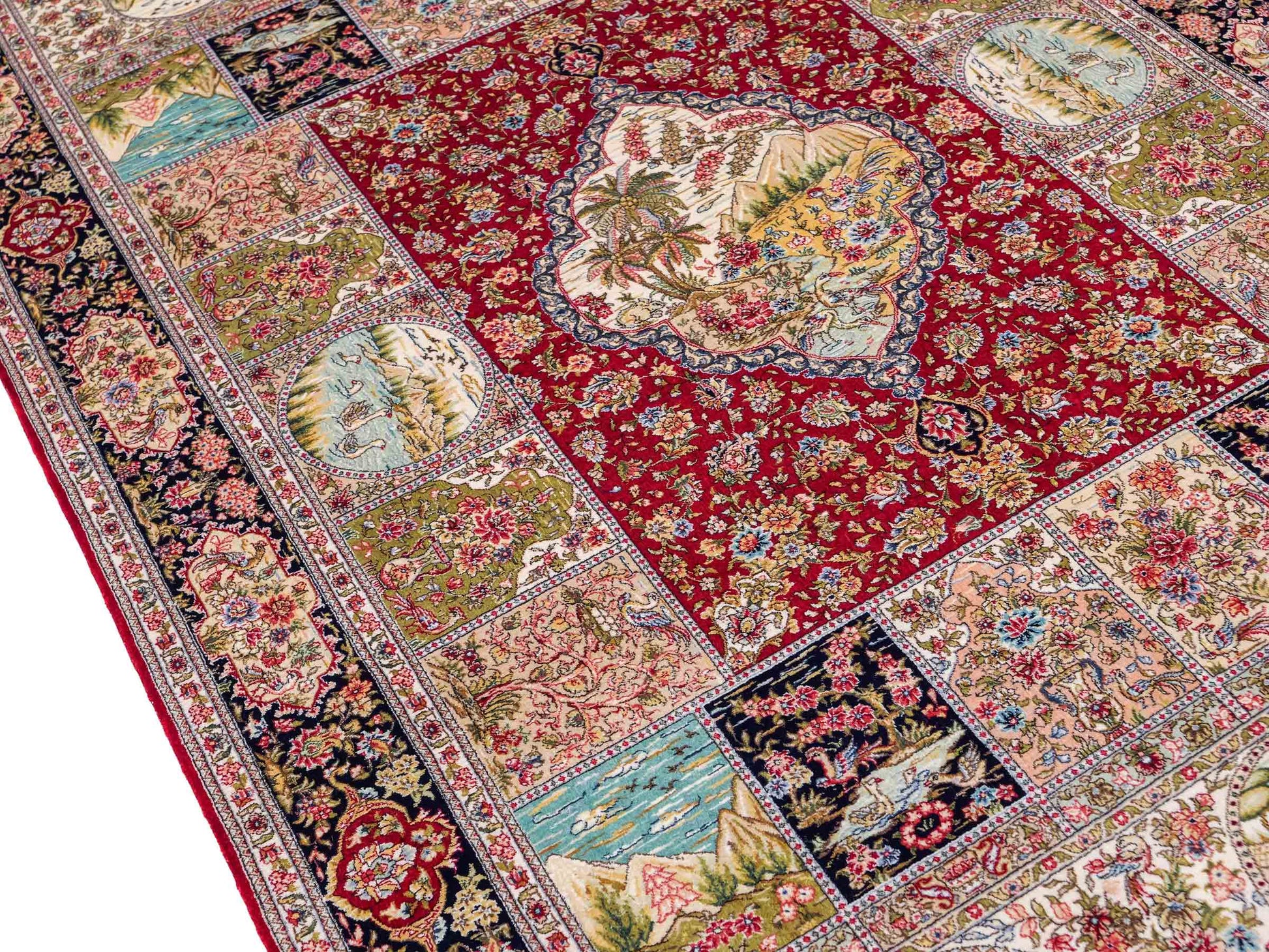 Der Flor und die Kette bestehen aus reiner Seide, was dem Teppich nicht nur einen unfassbaren Wert, eine unvergleichliche Haptik und atemberaubende Schönheit, sondern auch je nach Blickwinkel und Lichtverhältnis ein einzigartig schimmerndes Antlitz verleiht.