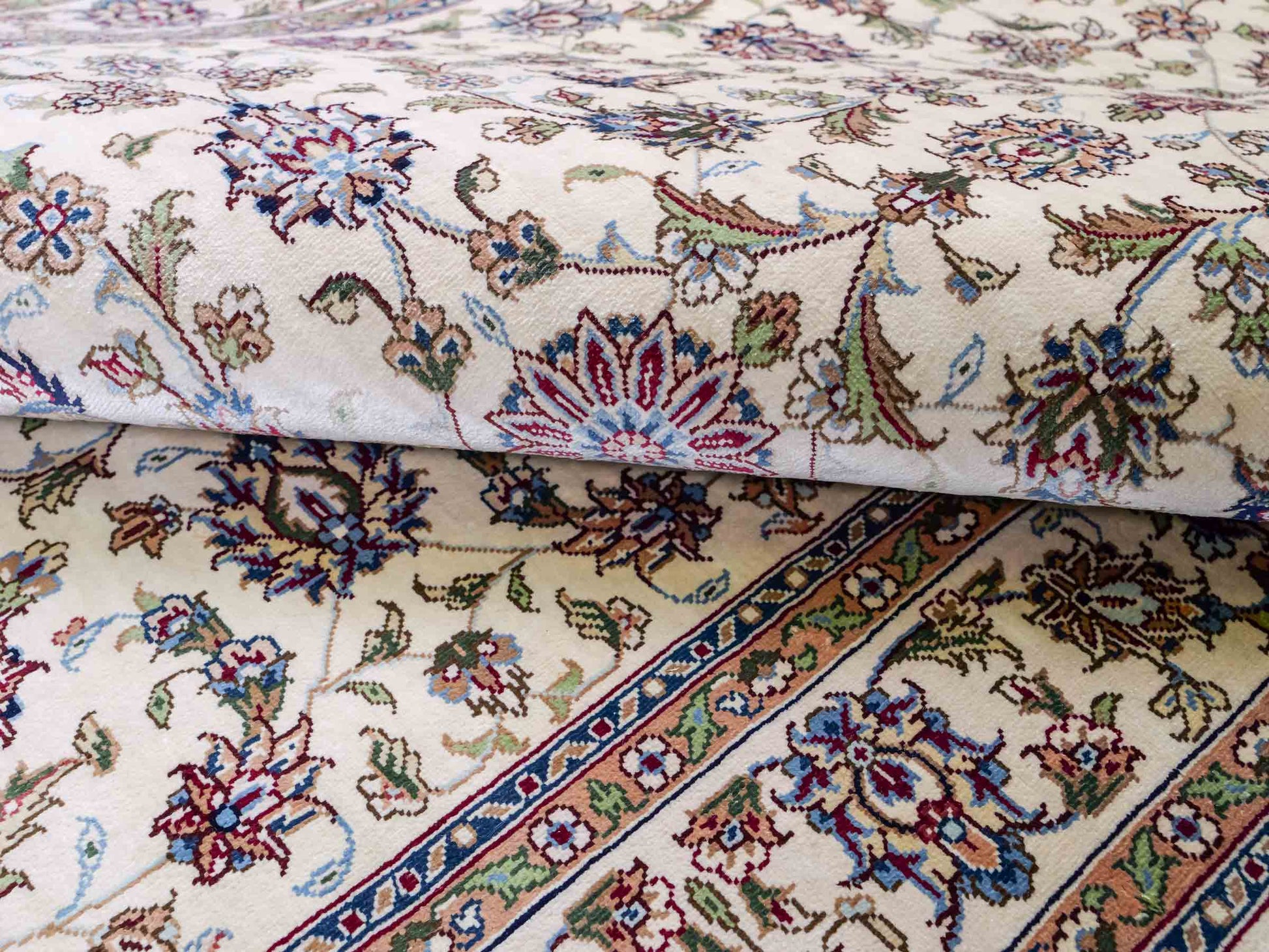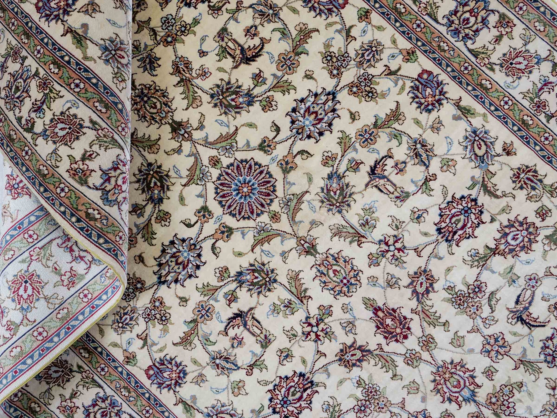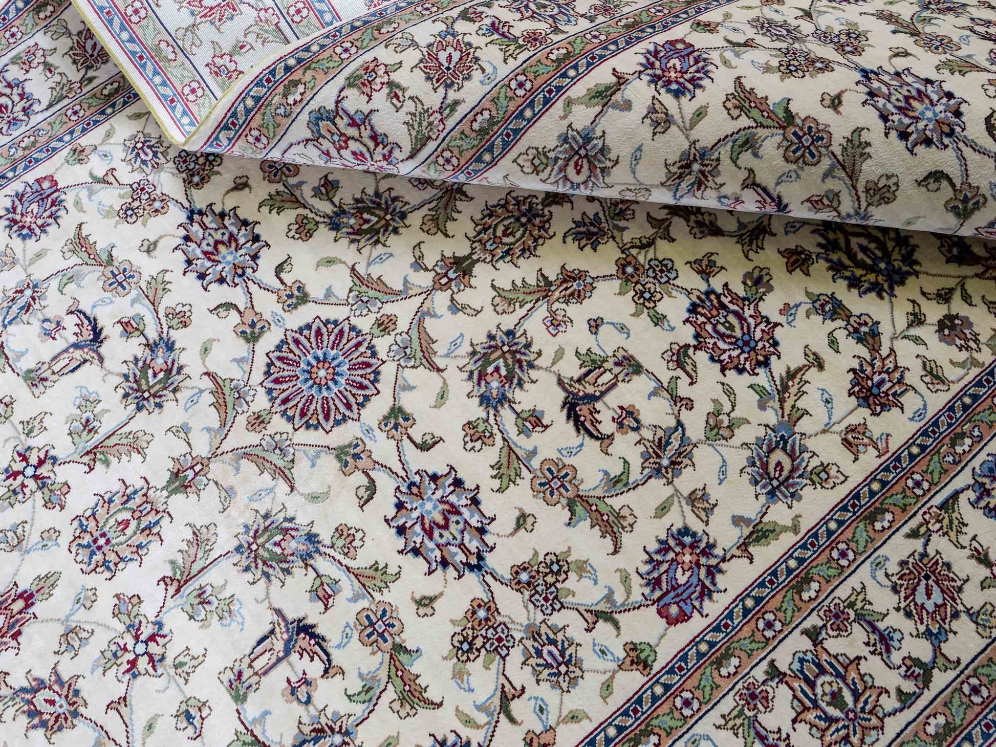 Der Flor und die Kette bestehen aus reiner Seide, was dem Teppich nicht nur einen unfassbaren Wert, eine unvergleichliche Haptik und atemberaubende Schönheit, sondern auch je nach Blickwinkel und Lichtverhältnis ein einzigartig schimmerndes Antlitz verleiht.