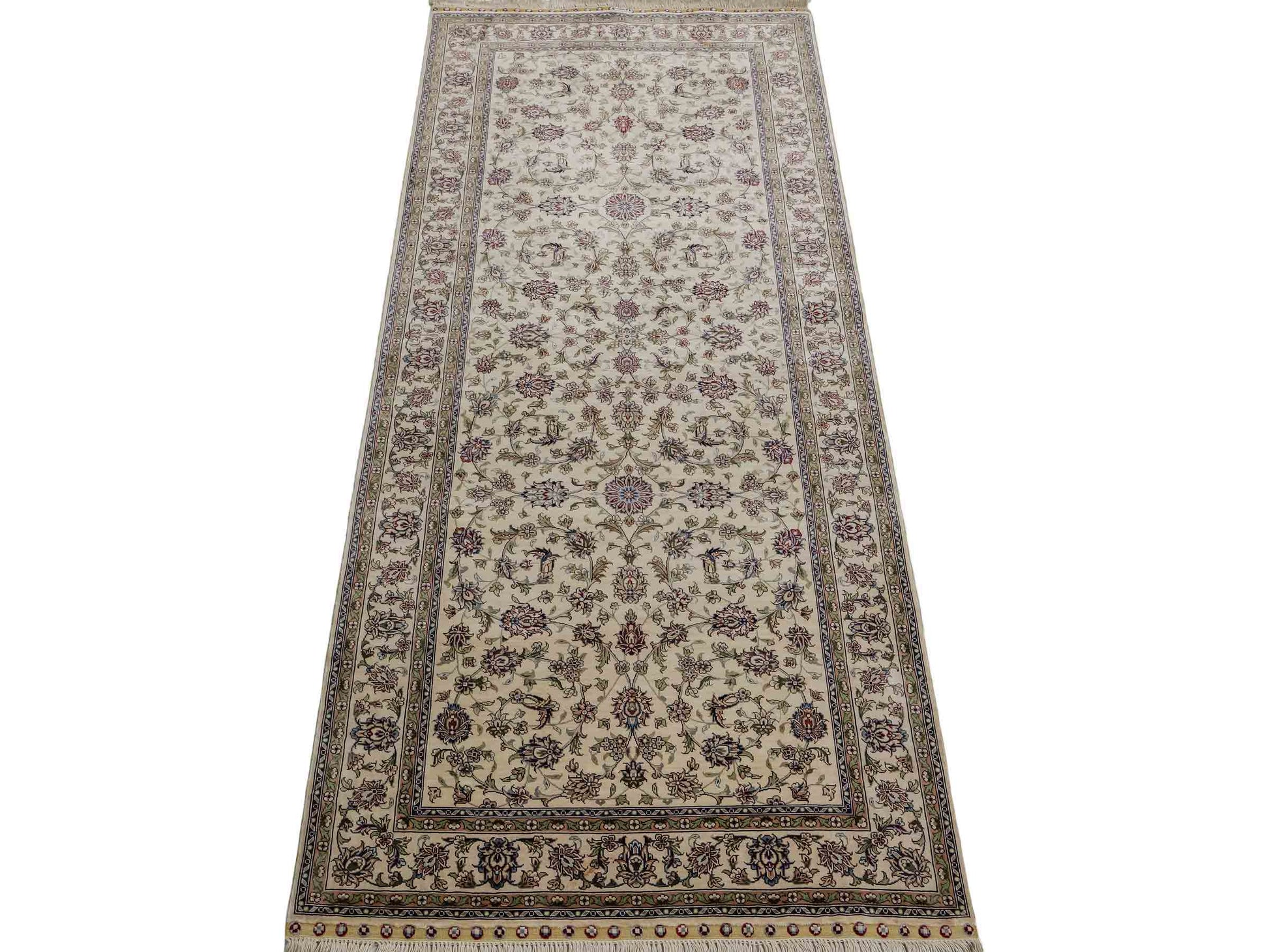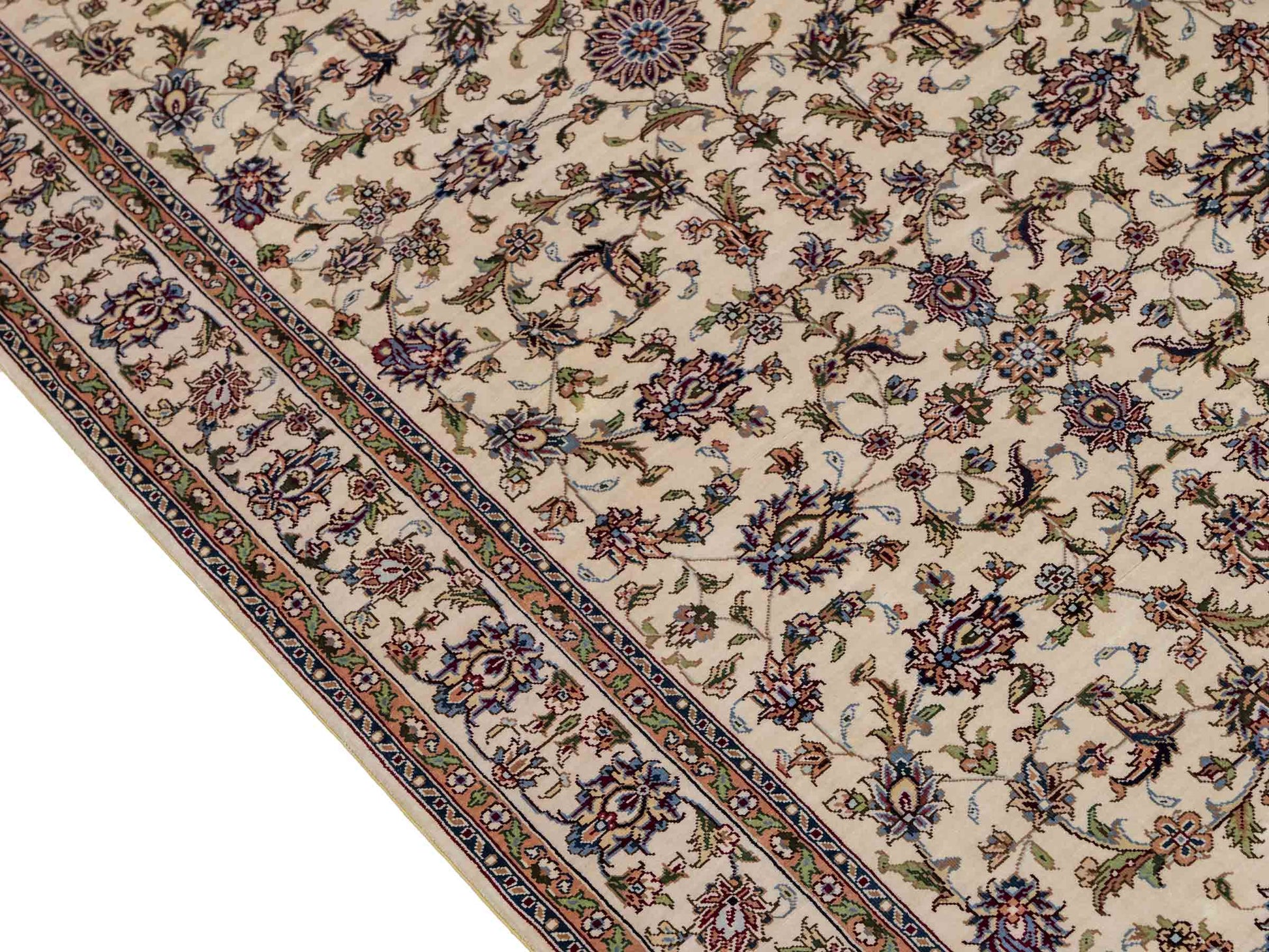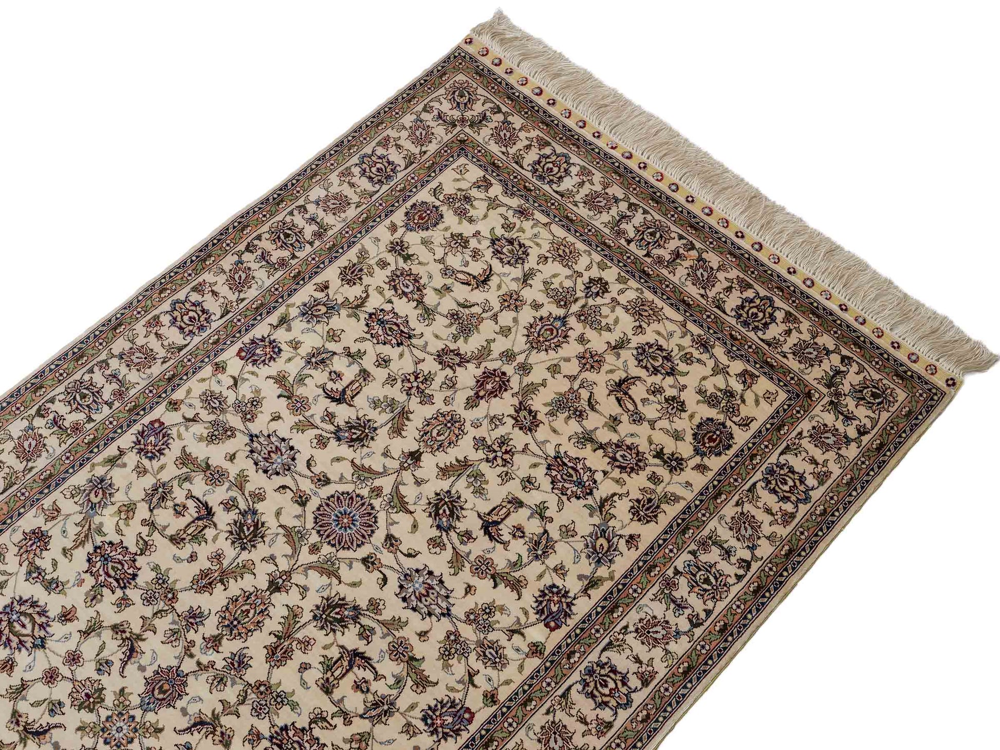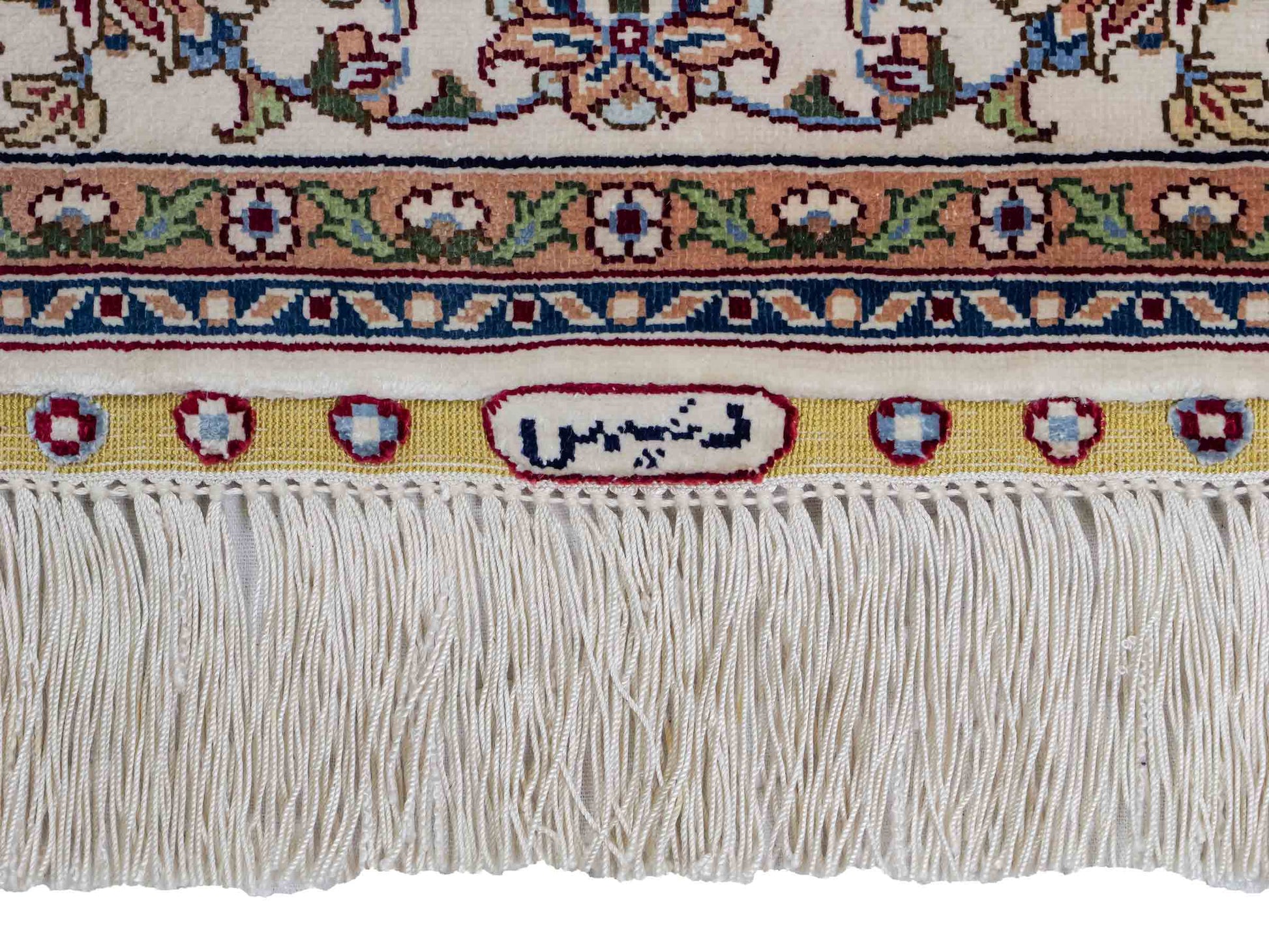 Der Flor und die Kette bestehen aus reiner Seide, was dem Teppich nicht nur einen unfassbaren Wert, eine unvergleichliche Haptik und atemberaubende Schönheit, sondern auch je nach Blickwinkel und Lichtverhältnis ein einzigartig schimmerndes Antlitz verleiht.
