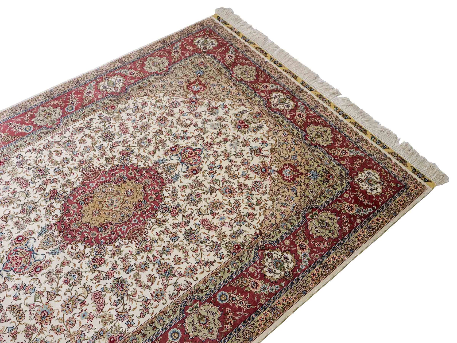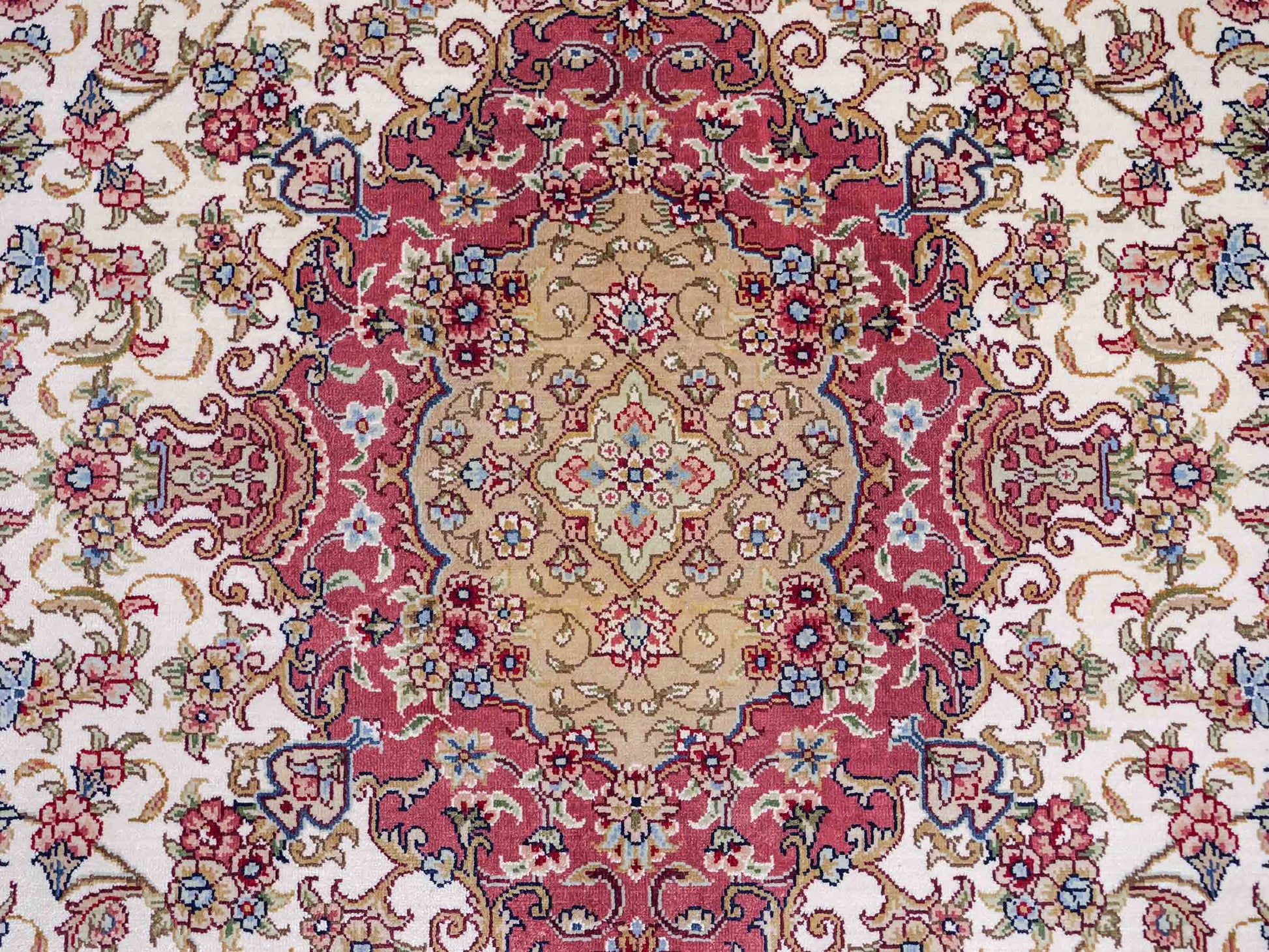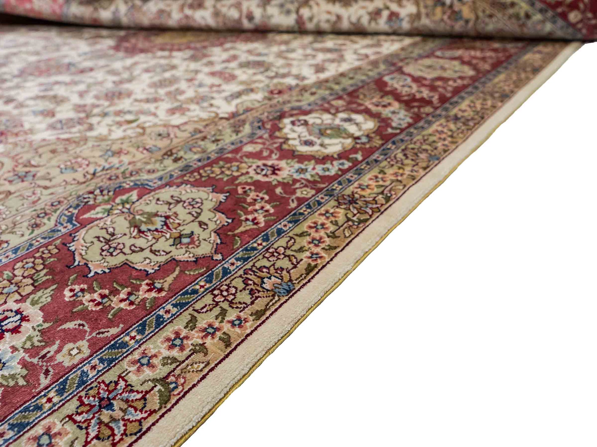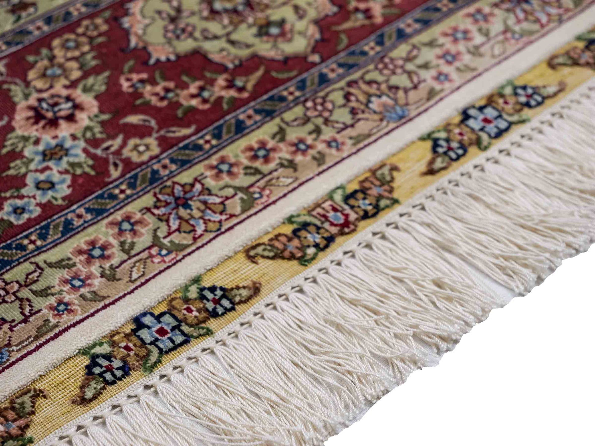 Der Flor und die Kette bestehen aus reiner Seide, was dem Teppich nicht nur einen unfassbaren Wert, eine unvergleichliche Haptik und atemberaubende Schönheit, sondern auch je nach Blickwinkel und Lichtverhältnis ein einzigartig schimmerndes Antlitz verleiht.