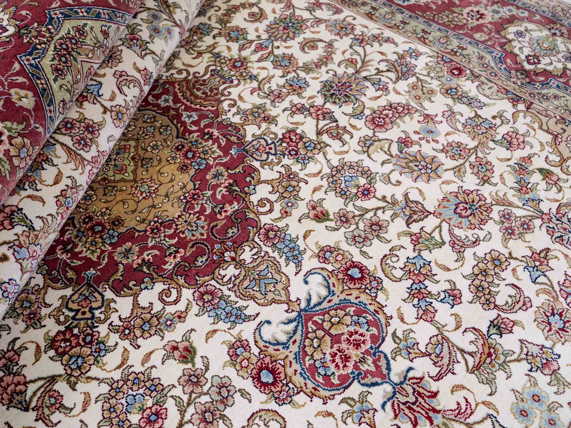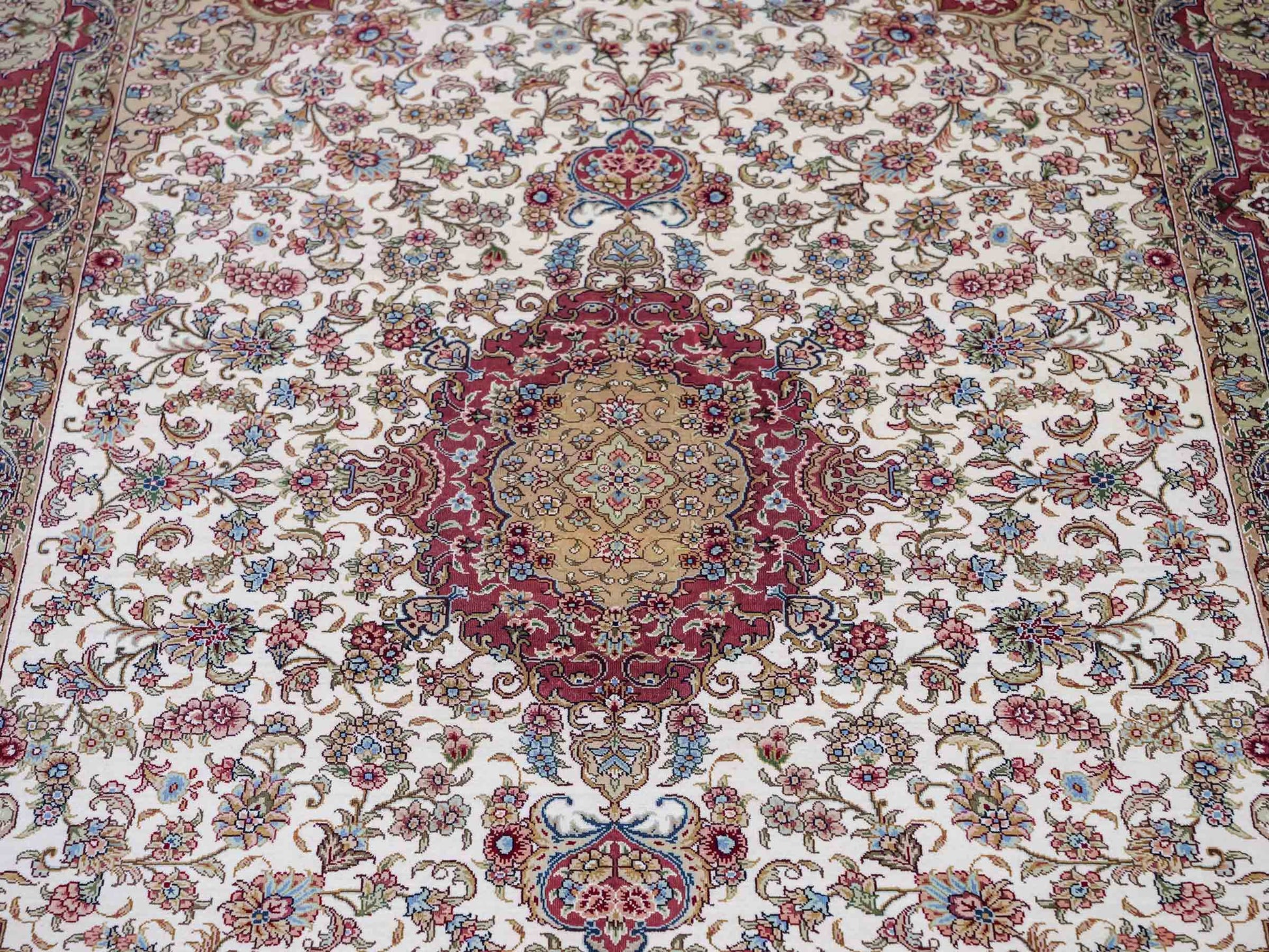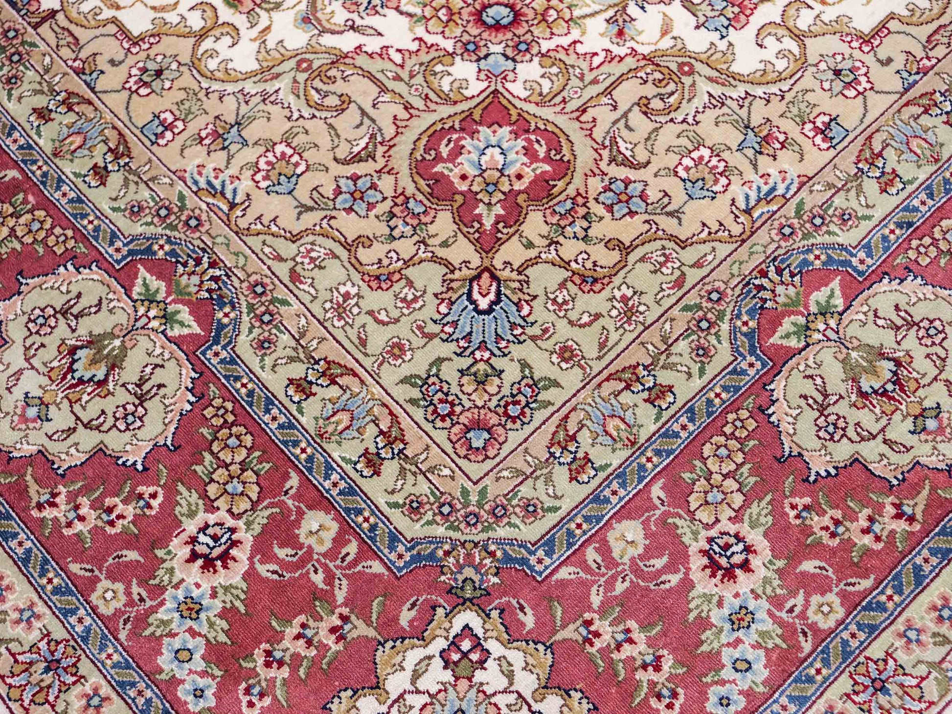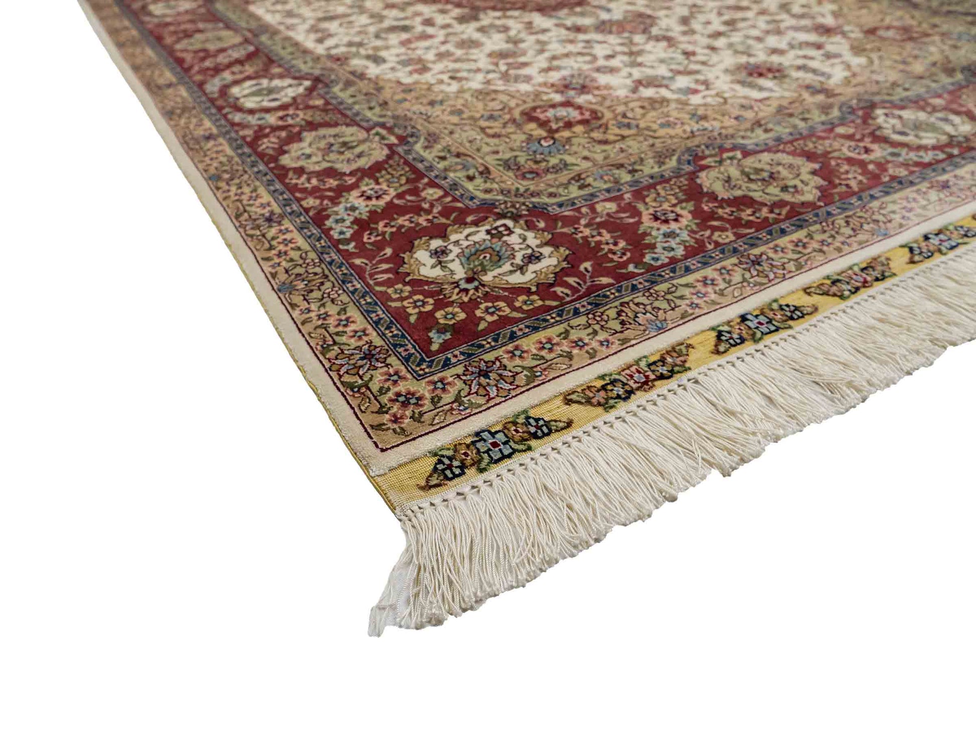 Der Flor und die Kette bestehen aus reiner Seide, was dem Teppich nicht nur einen unfassbaren Wert, eine unvergleichliche Haptik und atemberaubende Schönheit, sondern auch je nach Blickwinkel und Lichtverhältnis ein einzigartig schimmerndes Antlitz verleiht.