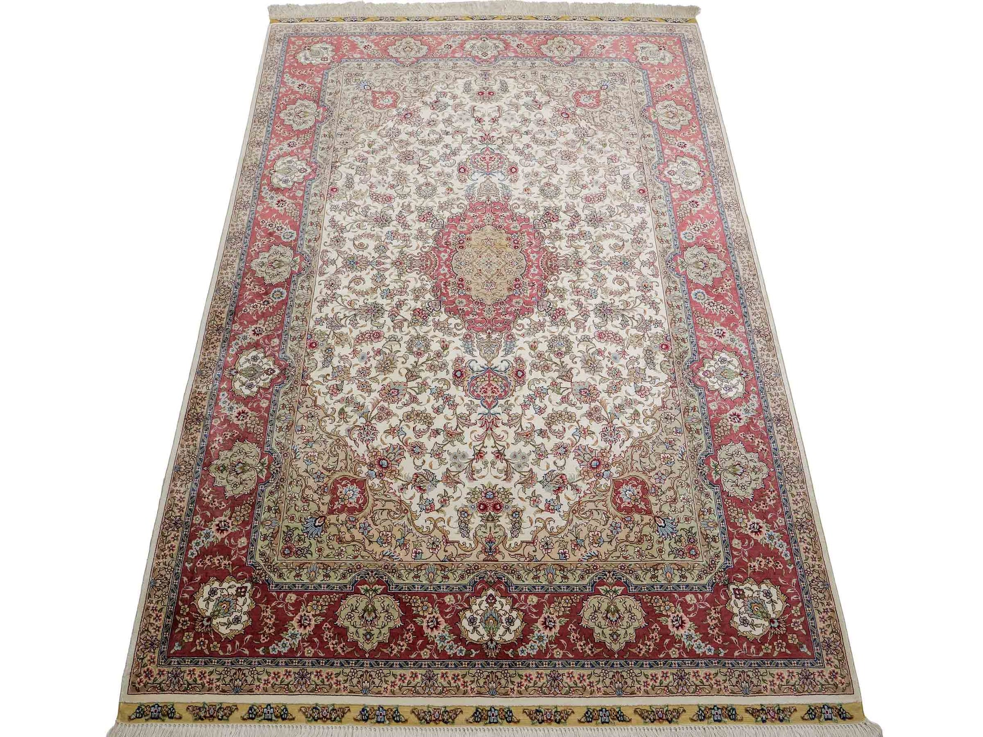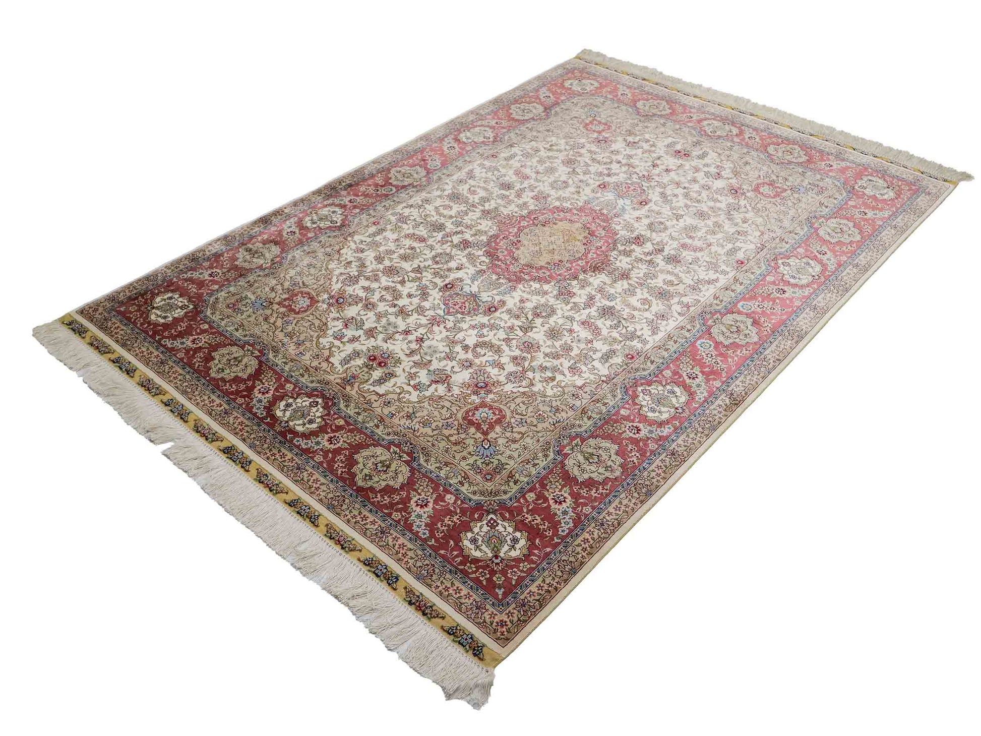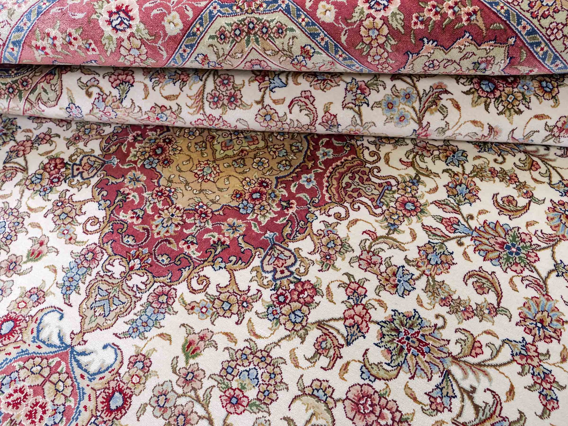 Bekannt durch die Seidenstraße blickt das Ursprungsland dieses aus chinesischer Meisterhand stammenden Unikats zurück auf eine überaus traditionsreiche Knüpfkultur. Neben seiner herausragenden Qualität und bemerkenswerten Anzahl an Knoten zeichnet sich dieses Exemplar durch sein zeitloses Ghom Design und seine Detailverliebtheit aus.