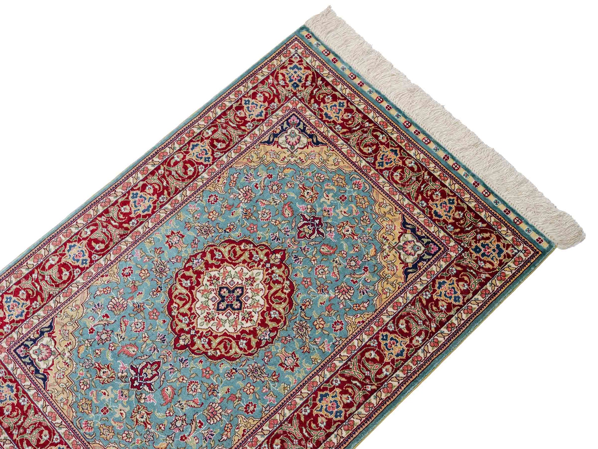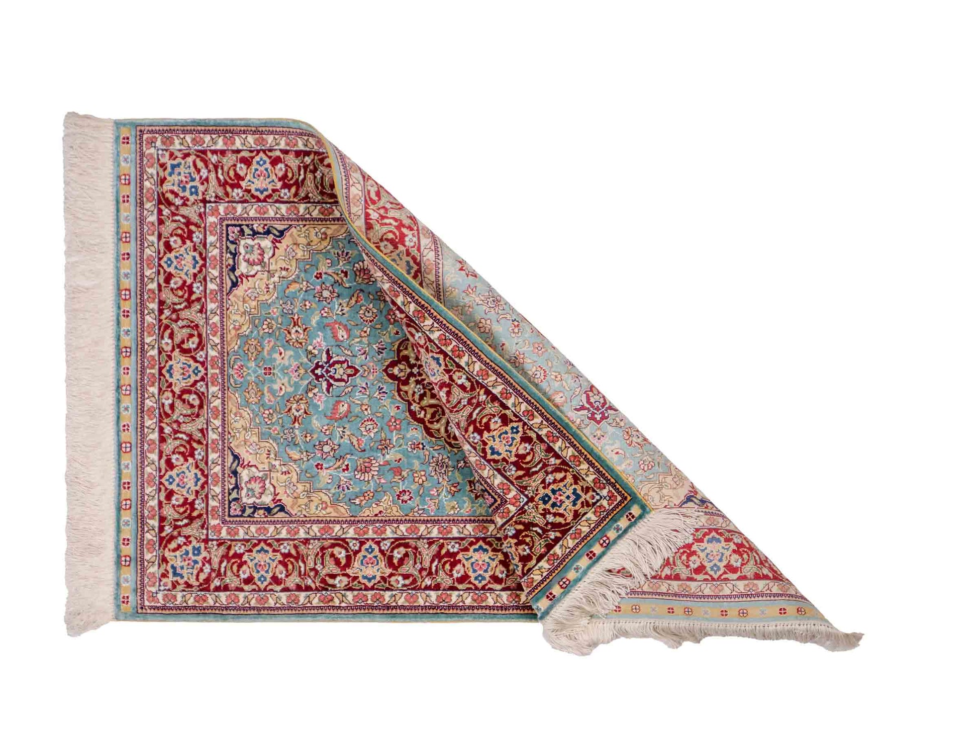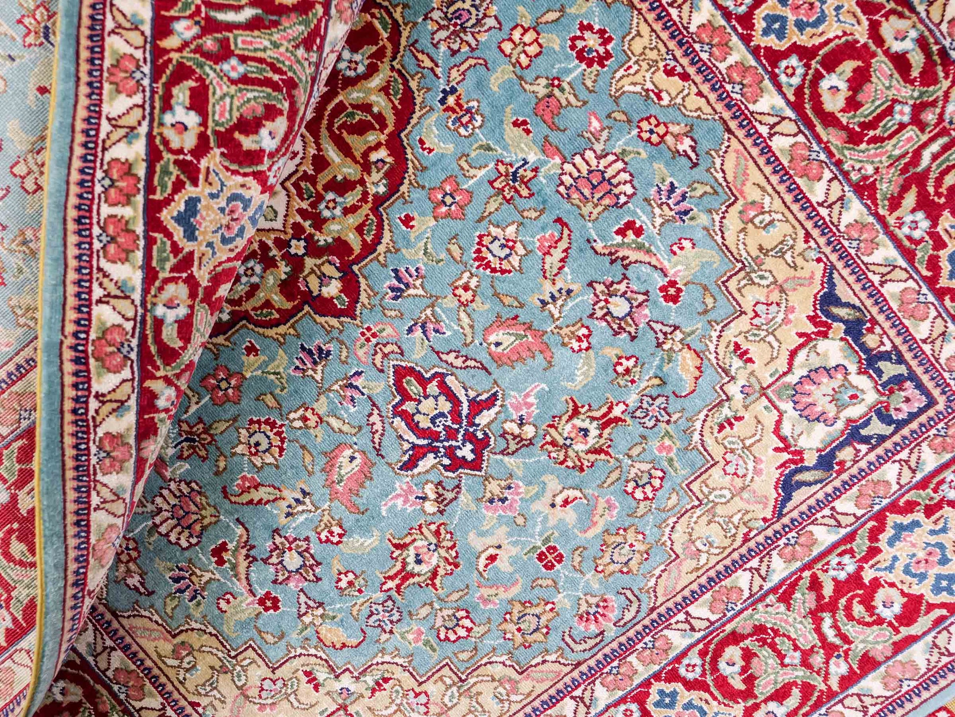 Der Flor und die Kette bestehen aus reiner Seide, was dem Teppich nicht nur einen unfassbaren Wert, eine unvergleichliche Haptik und atemberaubende Schönheit, sondern auch je nach Blickwinkel und Lichtverhältnis ein einzigartig schimmerndes Antlitz verleiht.