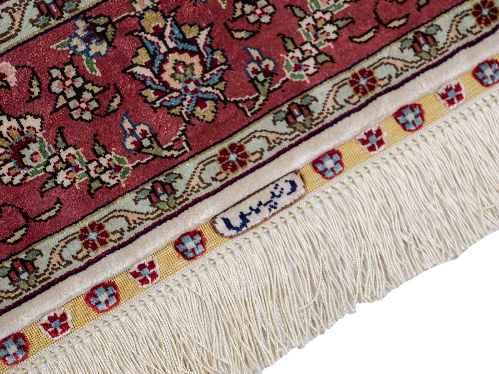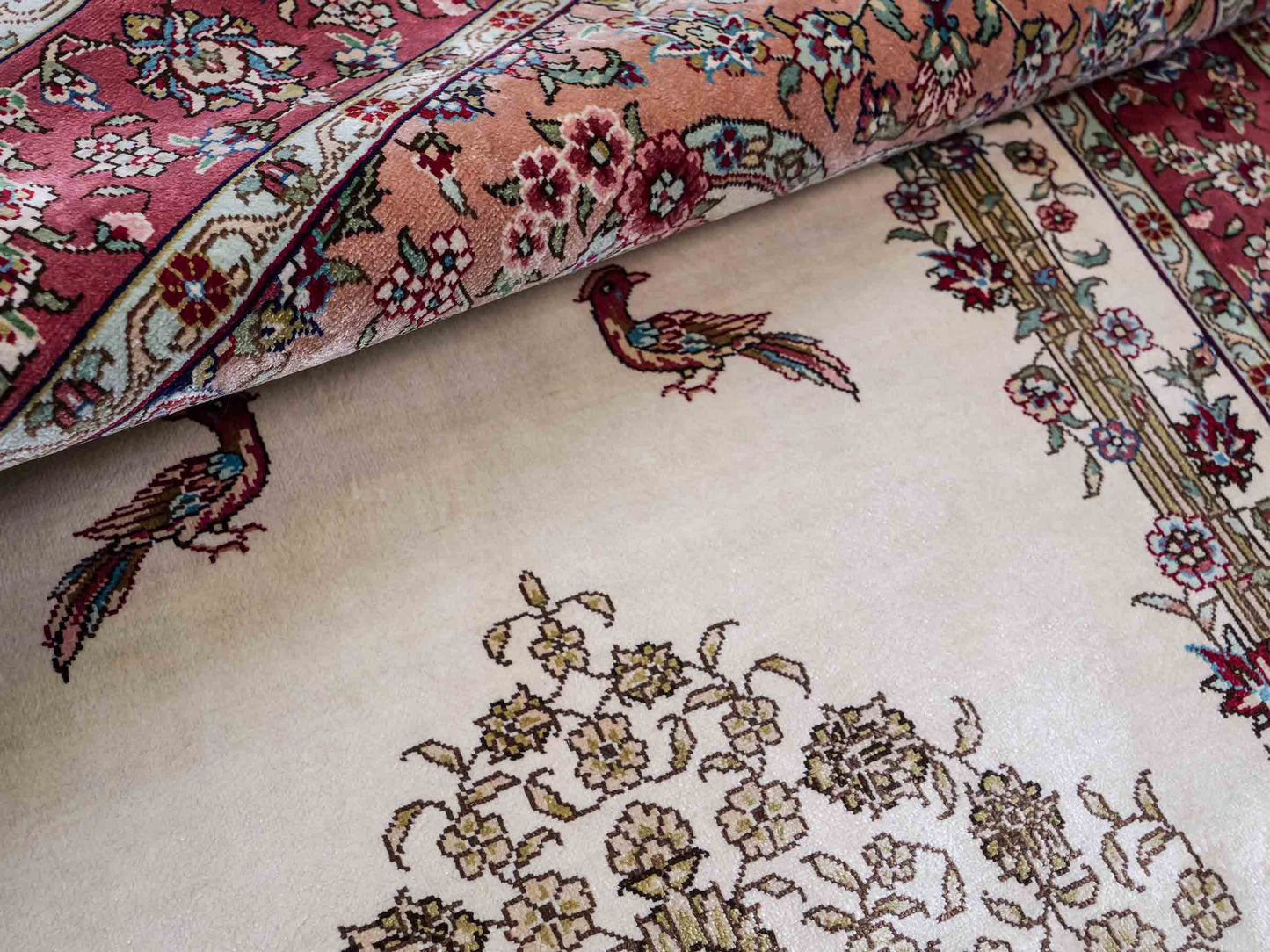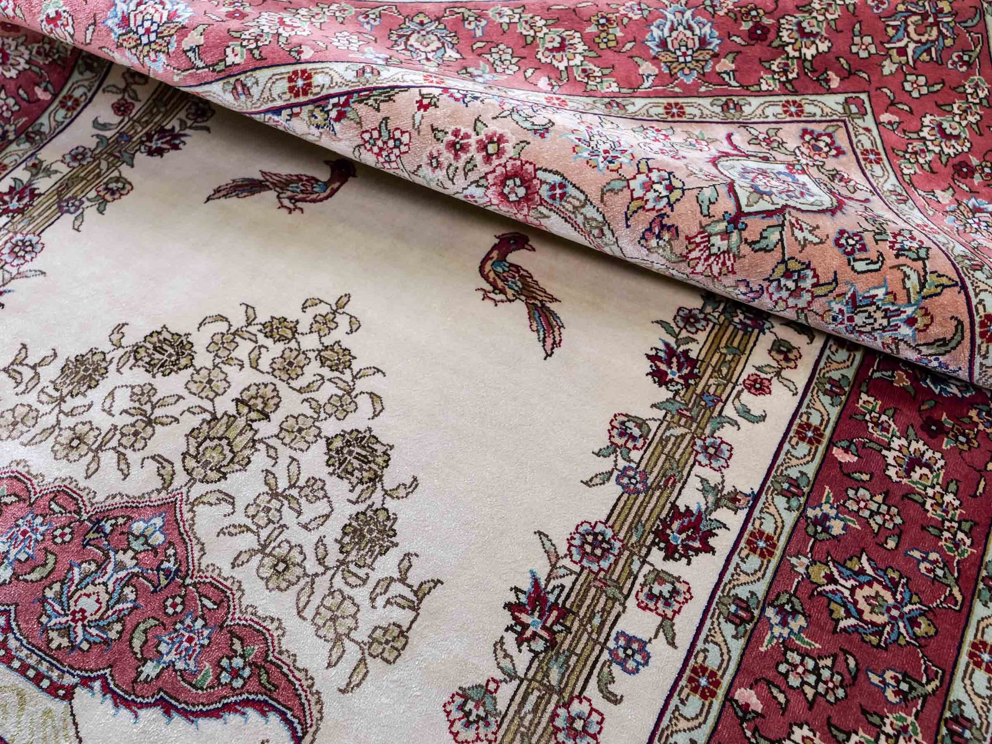 Der Flor und die Kette bestehen aus reiner Seide, was dem Teppich nicht nur einen unfassbaren Wert, eine unvergleichliche Haptik und atemberaubende Schönheit, sondern auch je nach Blickwinkel und Lichtverhältnis ein einzigartig schimmerndes Antlitz verleiht.