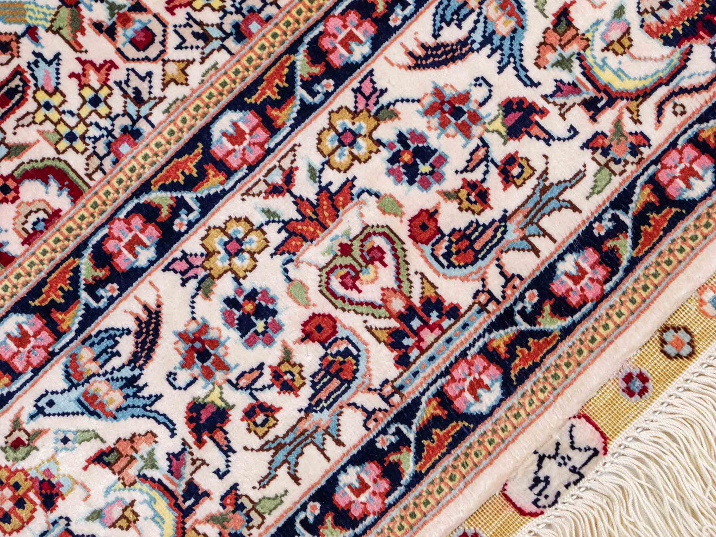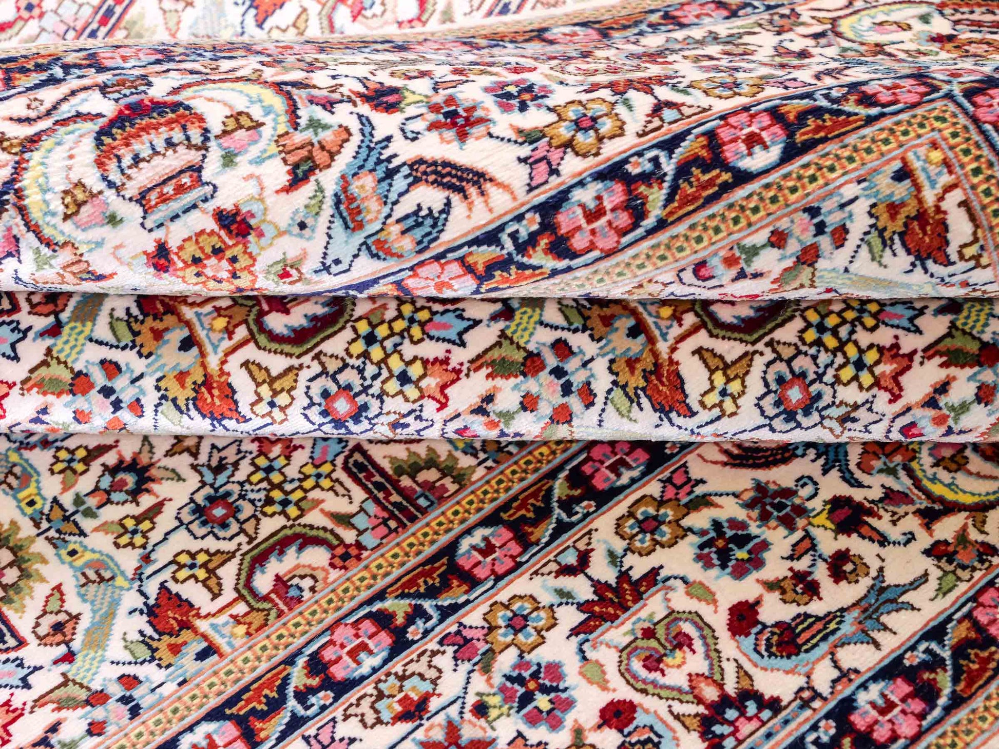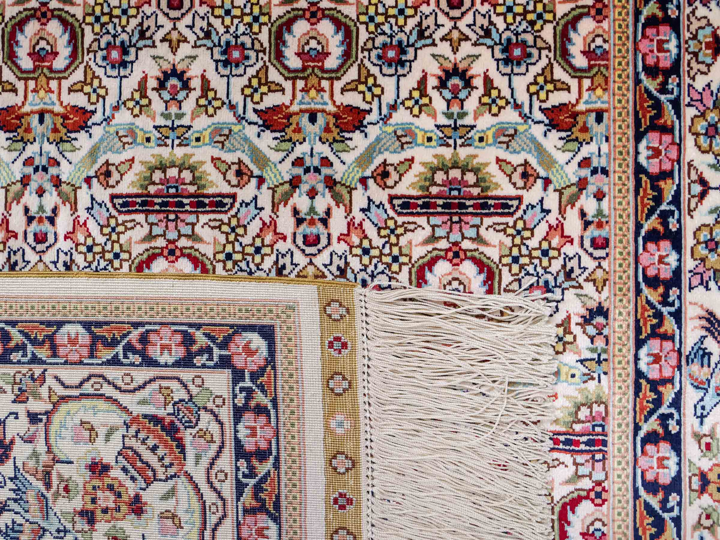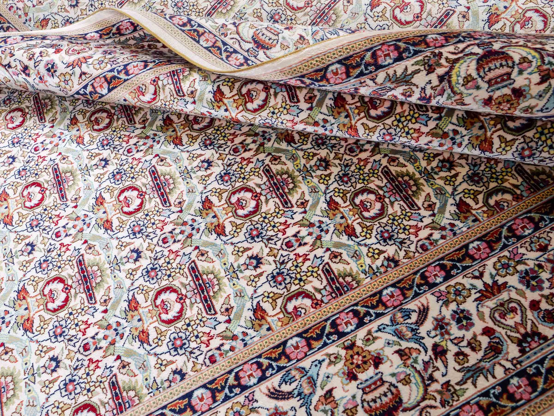 Der Flor und die Kette bestehen aus reiner Seide, was dem Teppich nicht nur einen unfassbaren Wert, eine unvergleichliche Haptik und atemberaubende Schönheit, sondern auch je nach Blickwinkel und Lichtverhältnis ein einzigartig schimmerndes Antlitz verleiht.