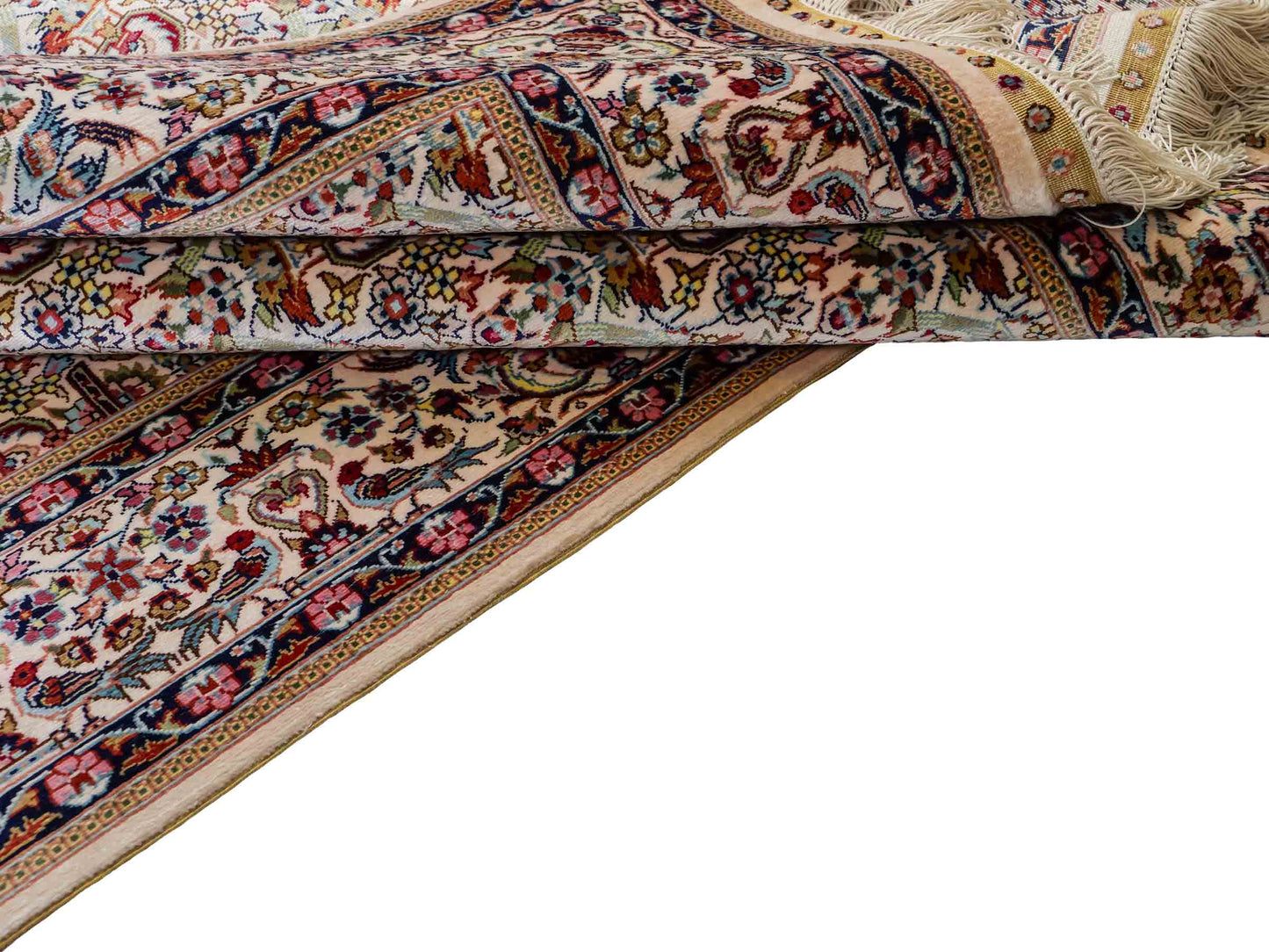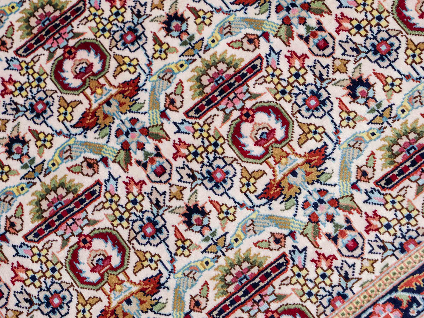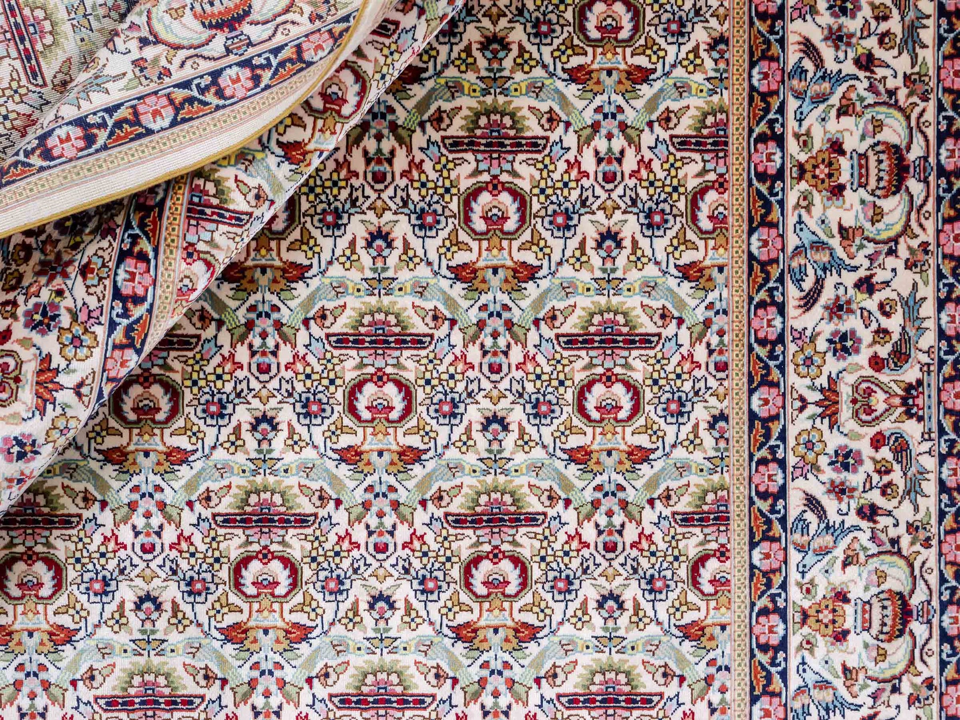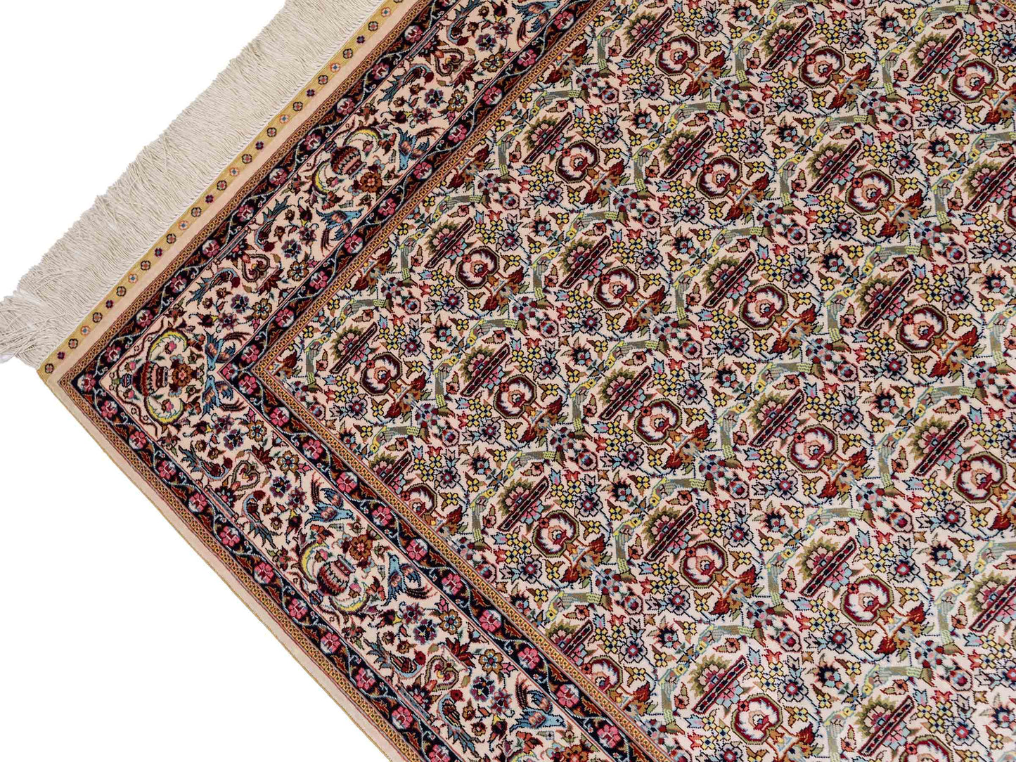 Der Flor und die Kette bestehen aus reiner Seide, was dem Teppich nicht nur einen unfassbaren Wert, eine unvergleichliche Haptik und atemberaubende Schönheit, sondern auch je nach Blickwinkel und Lichtverhältnis ein einzigartig schimmerndes Antlitz verleiht.