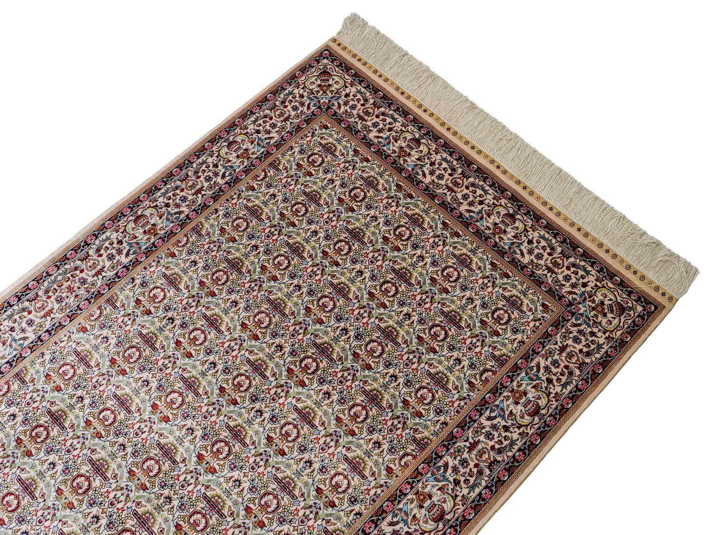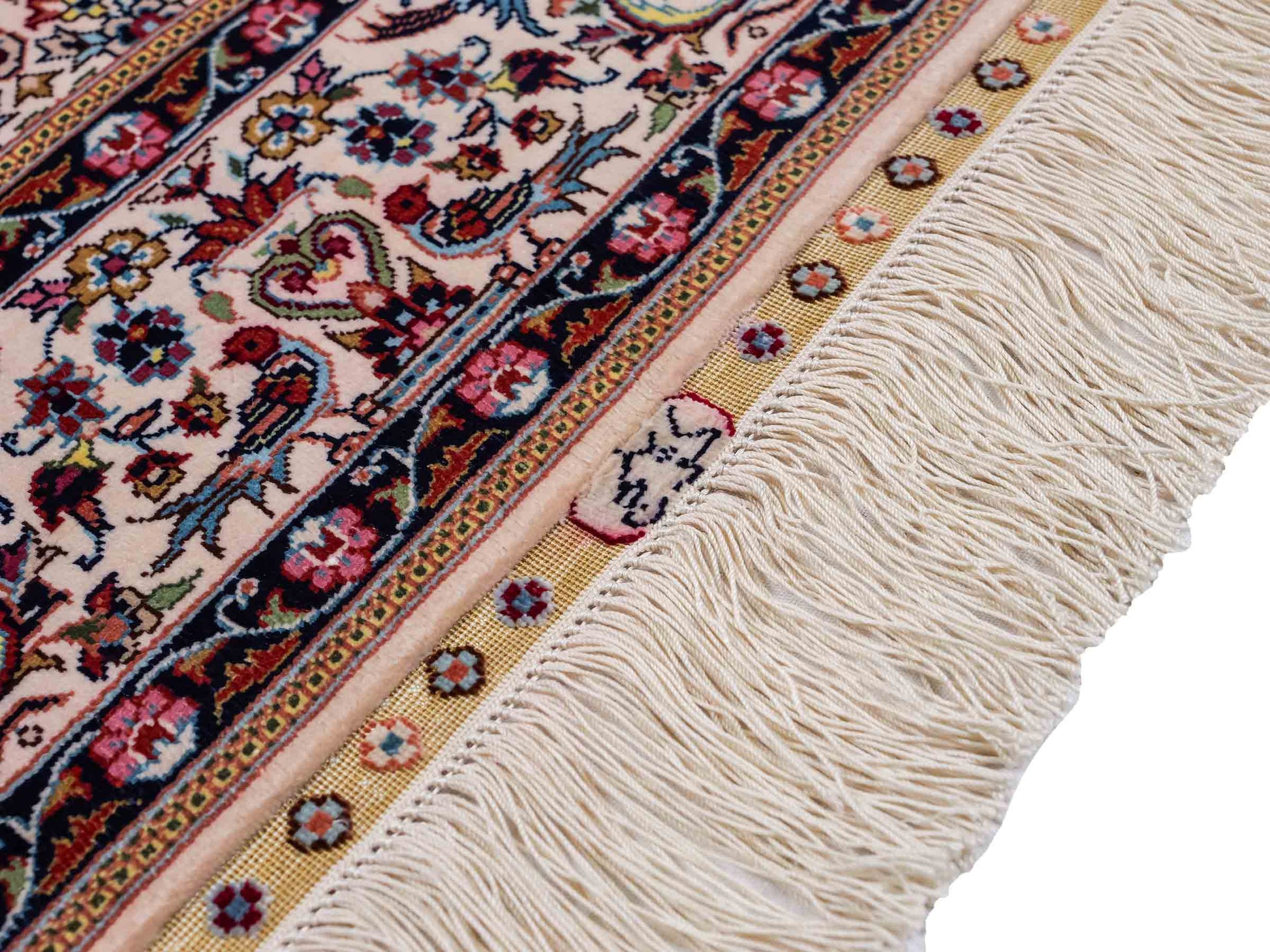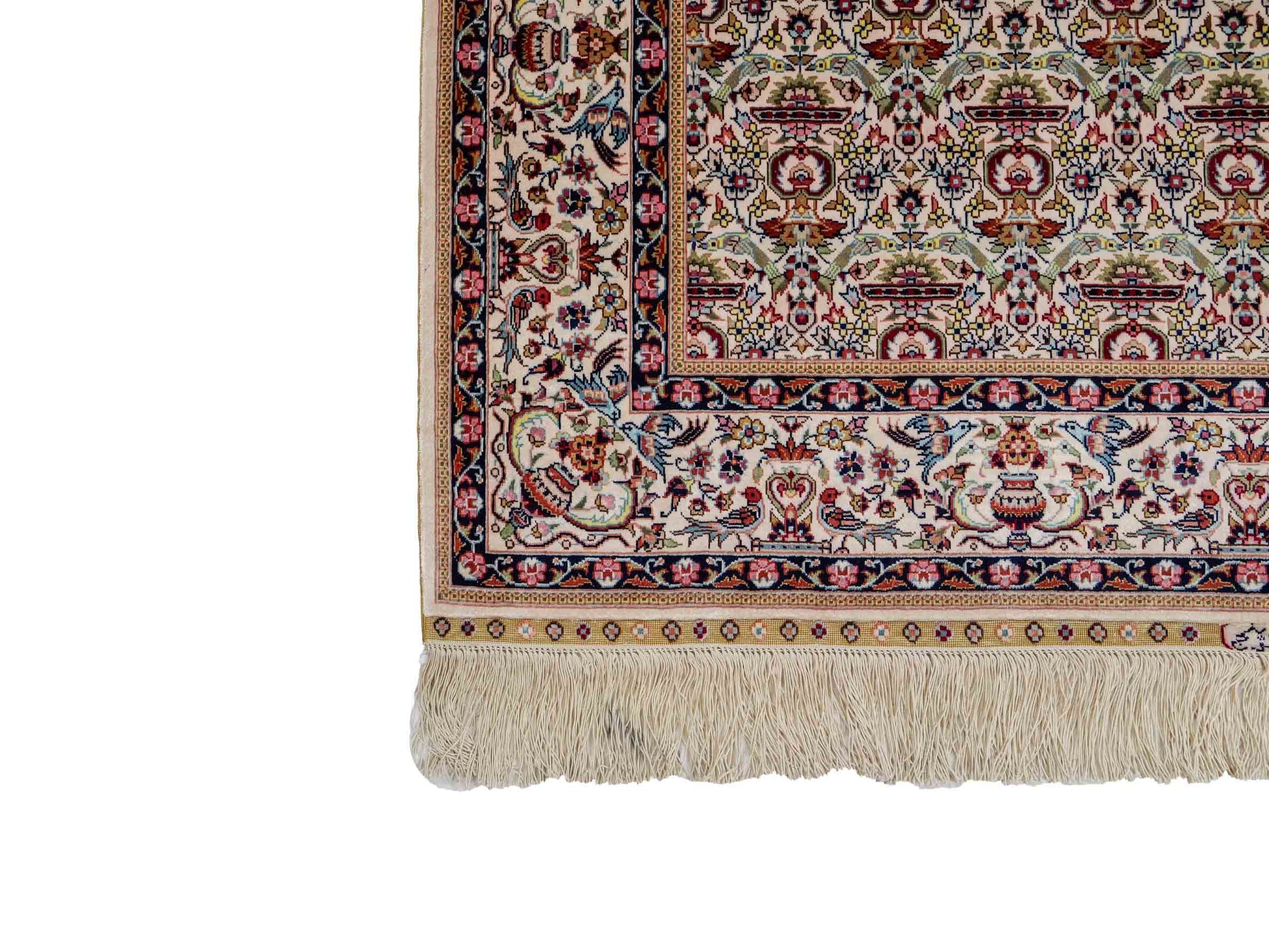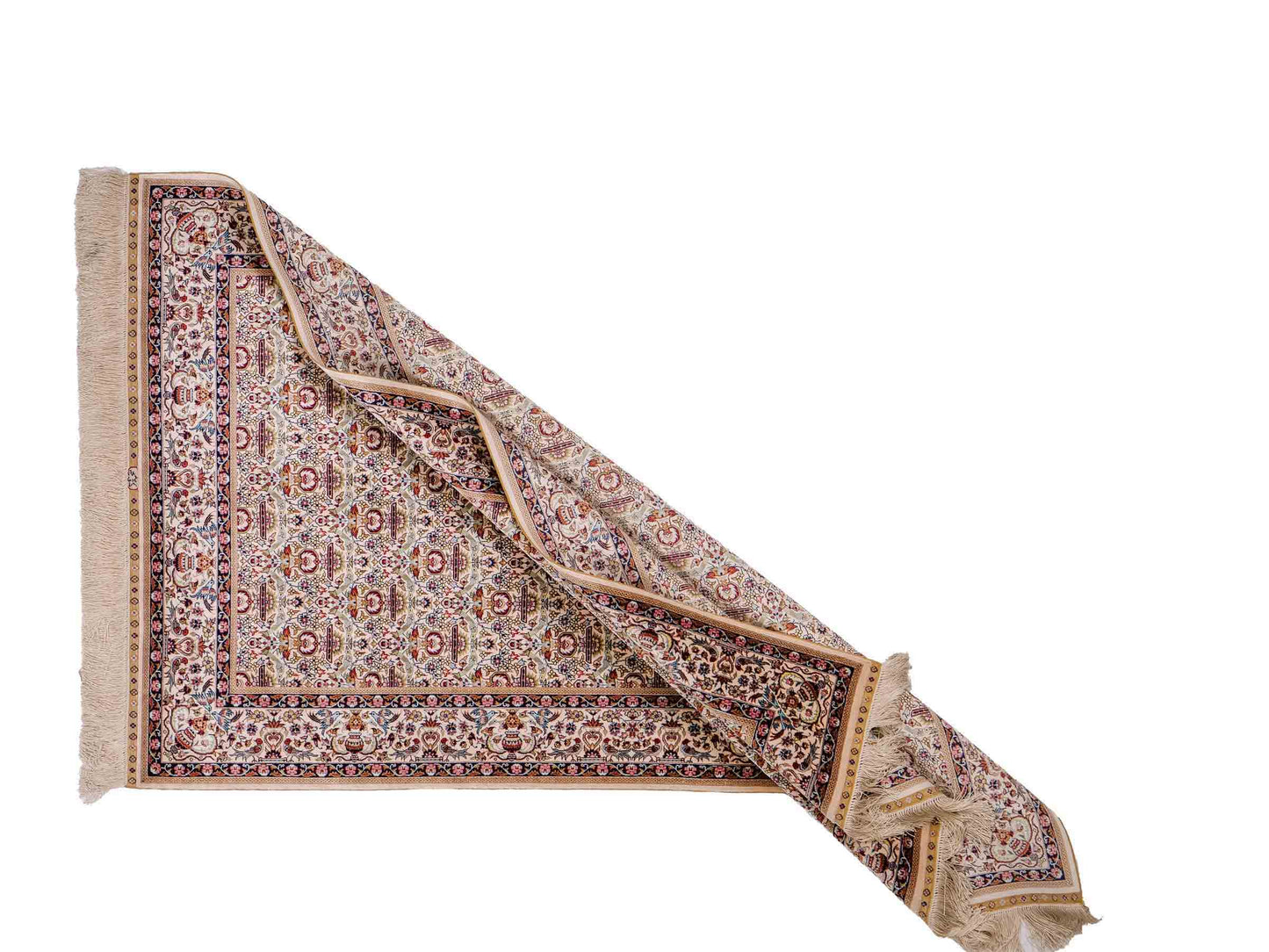 Der Flor und die Kette bestehen aus reiner Seide, was dem Teppich nicht nur einen unfassbaren Wert, eine unvergleichliche Haptik und atemberaubende Schönheit, sondern auch je nach Blickwinkel und Lichtverhältnis ein einzigartig schimmerndes Antlitz verleiht.