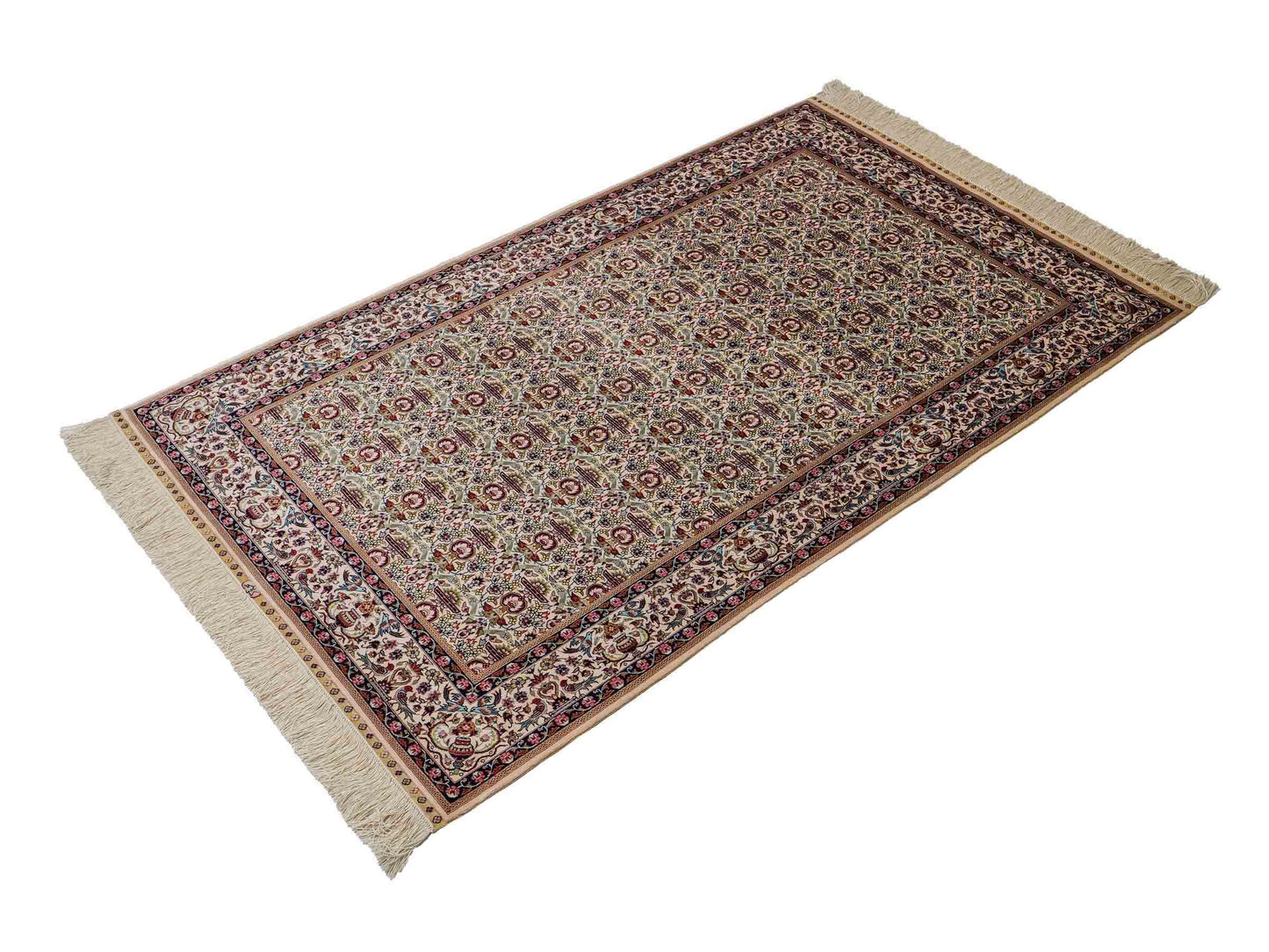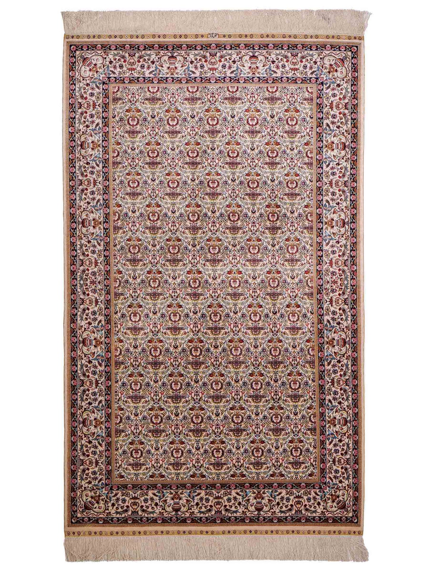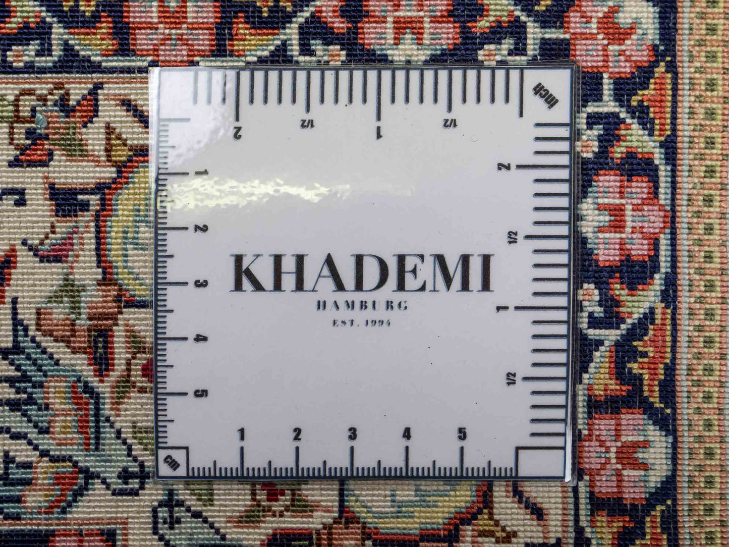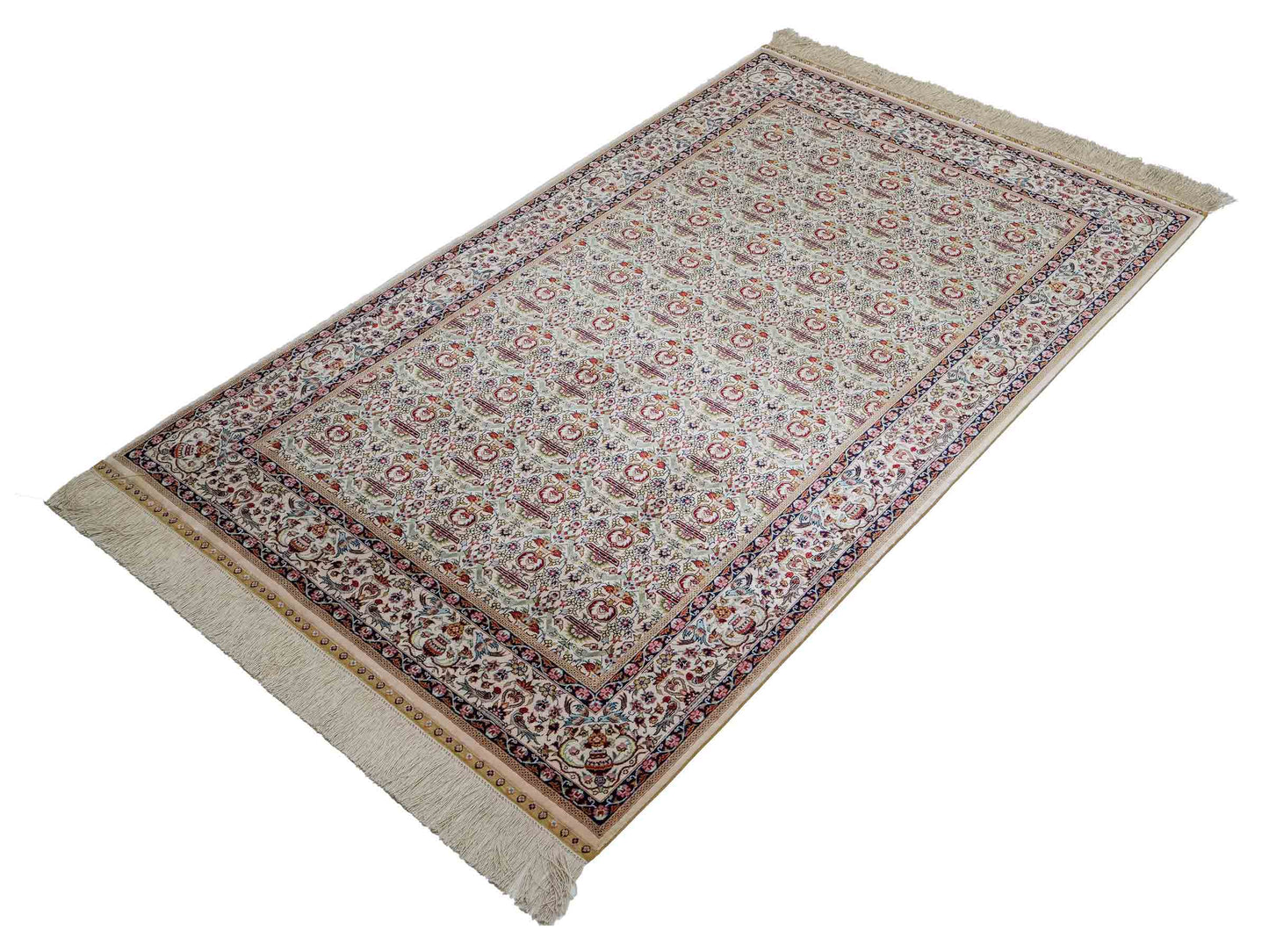 Der Flor und die Kette bestehen aus reiner Seide, was dem Teppich nicht nur einen unfassbaren Wert, eine unvergleichliche Haptik und atemberaubende Schönheit, sondern auch je nach Blickwinkel und Lichtverhältnis ein einzigartig schimmerndes Antlitz verleiht.