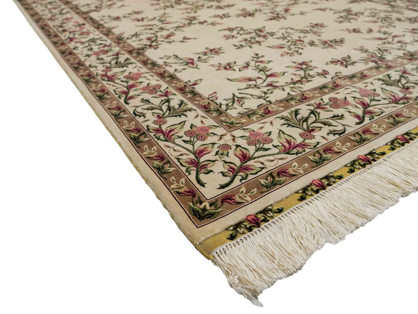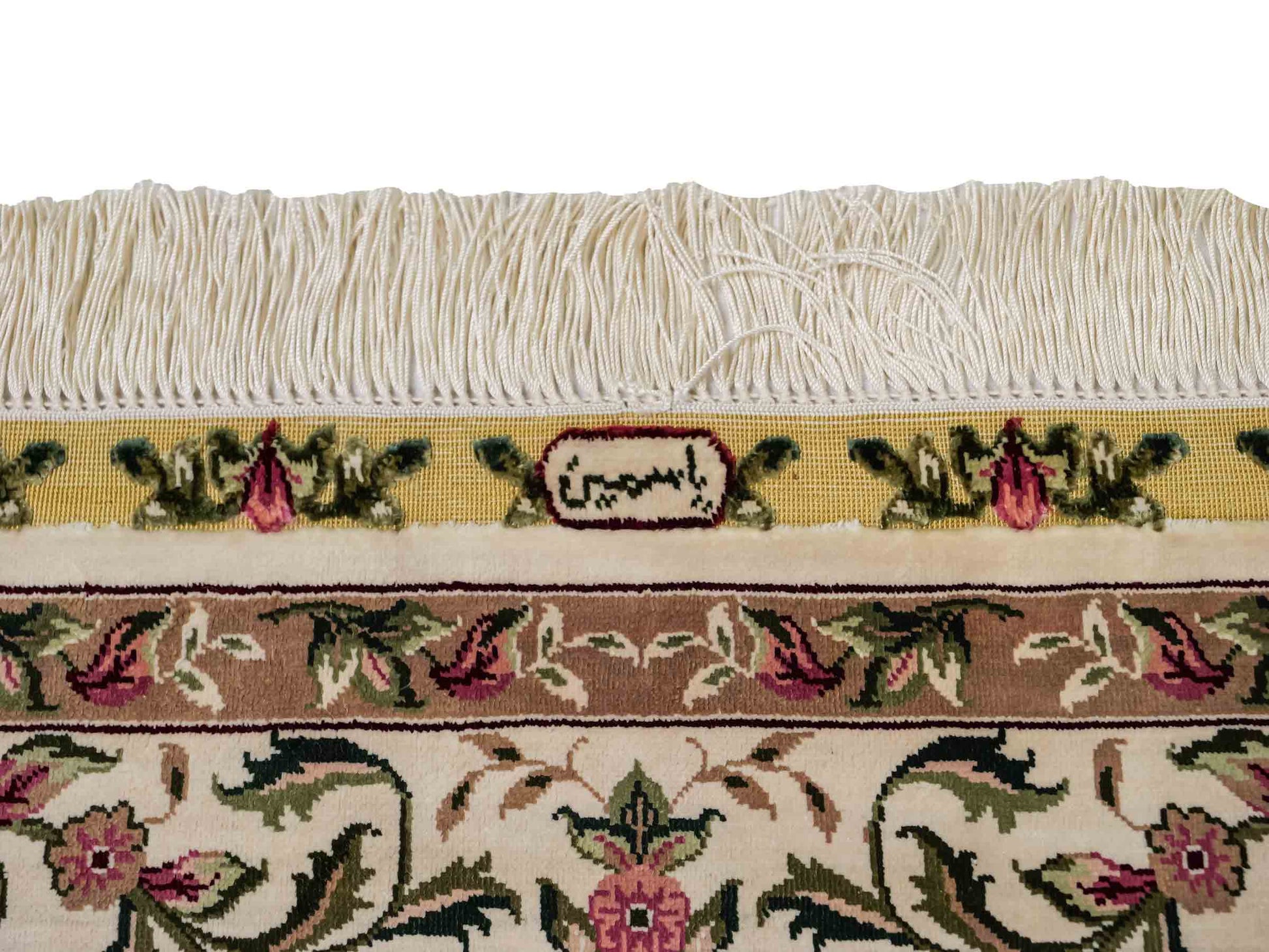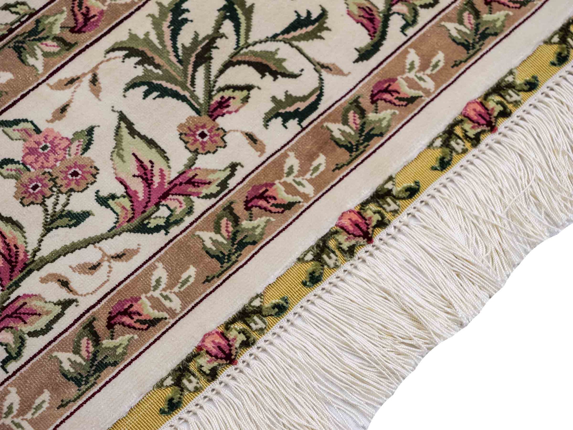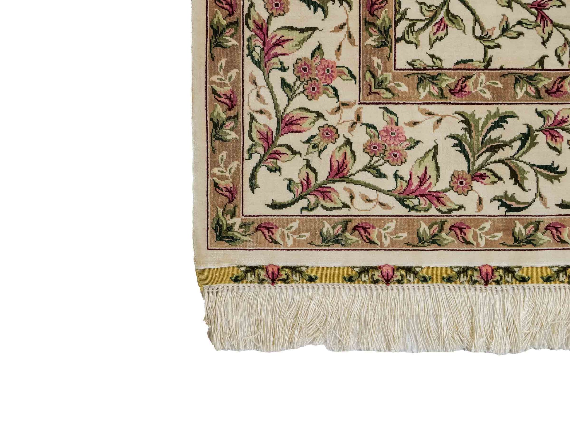Der Flor und die Kette bestehen aus reiner Seide, was dem Teppich nicht nur einen unfassbaren Wert, eine unvergleichliche Haptik und atemberaubende Schönheit, sondern auch je nach Blickwinkel und Lichtverhältnis ein einzigartig schimmerndes Antlitz verleiht.