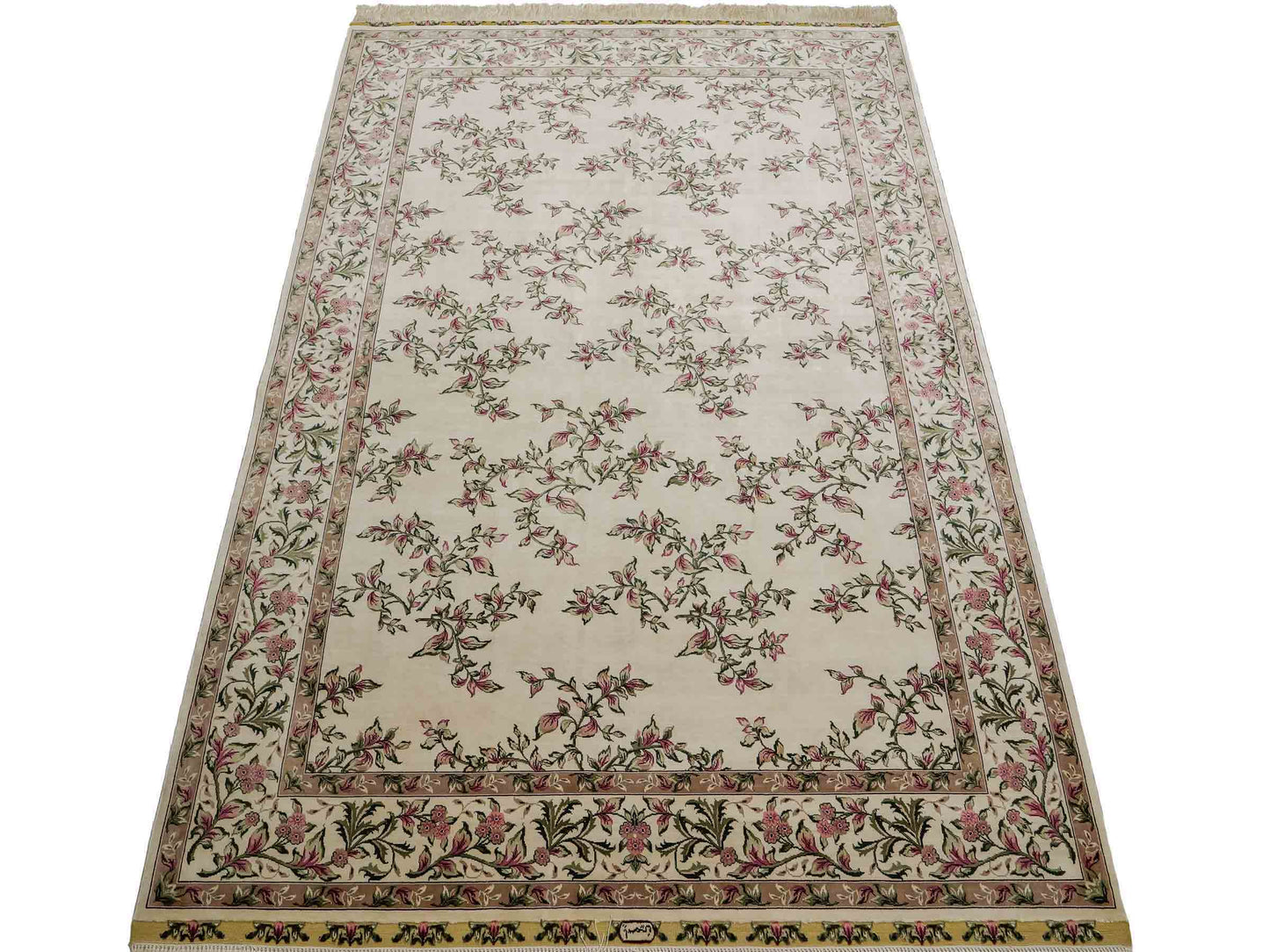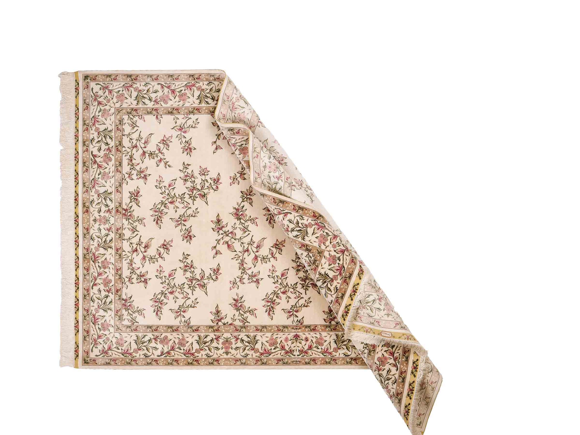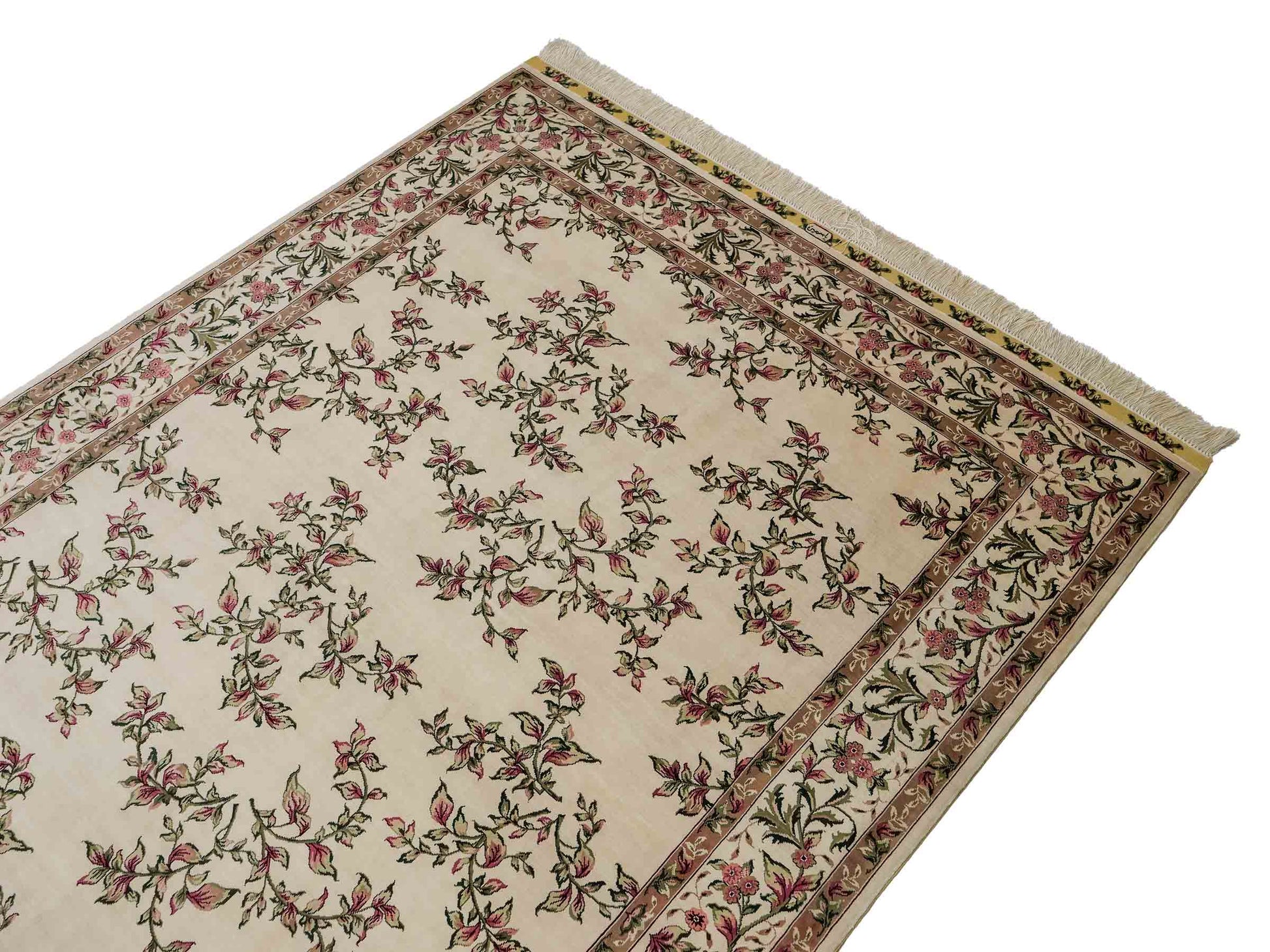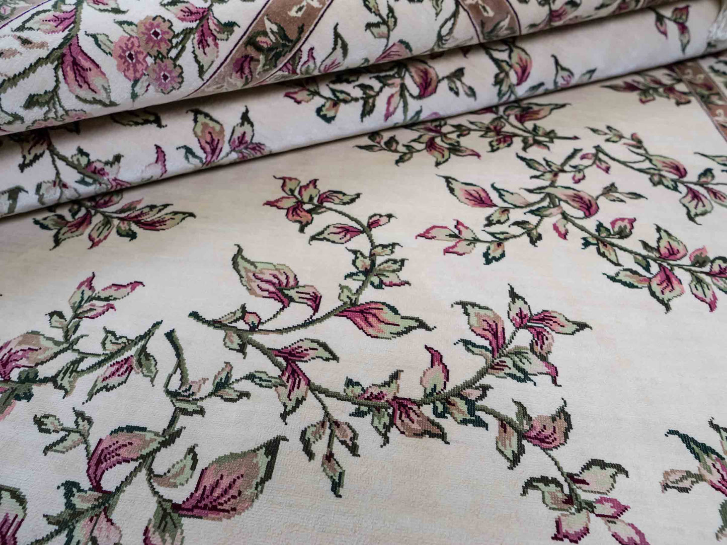 Der Flor und die Kette bestehen aus reiner Seide, was dem Teppich nicht nur einen unfassbaren Wert, eine unvergleichliche Haptik und atemberaubende Schönheit, sondern auch je nach Blickwinkel und Lichtverhältnis ein einzigartig schimmerndes Antlitz verleiht.