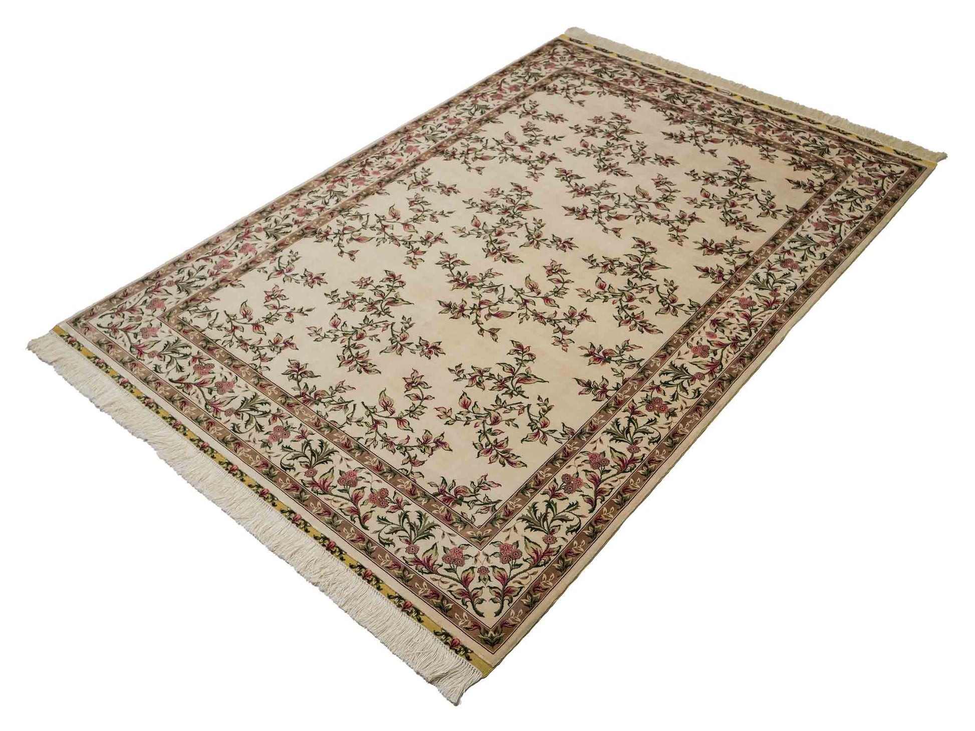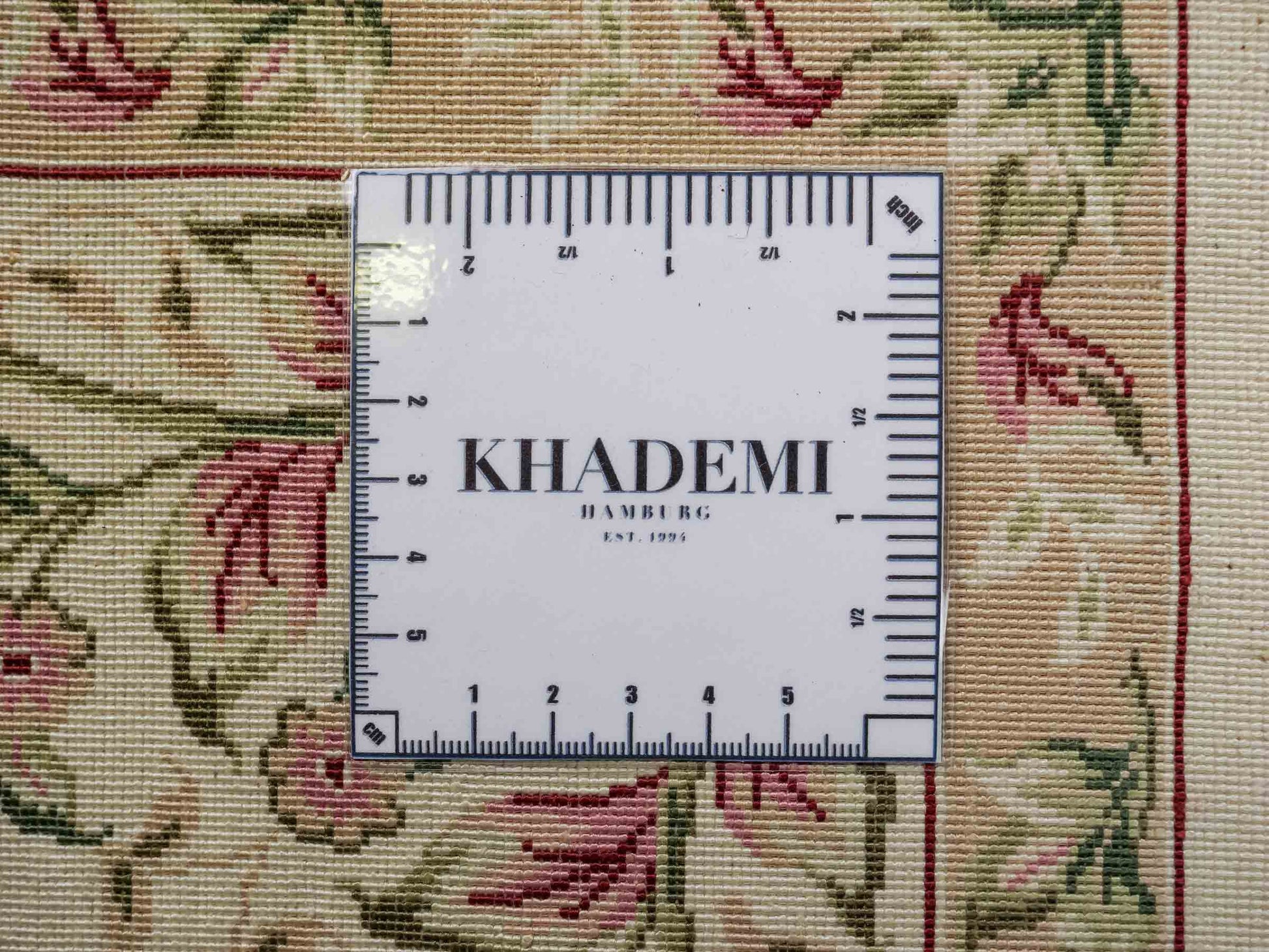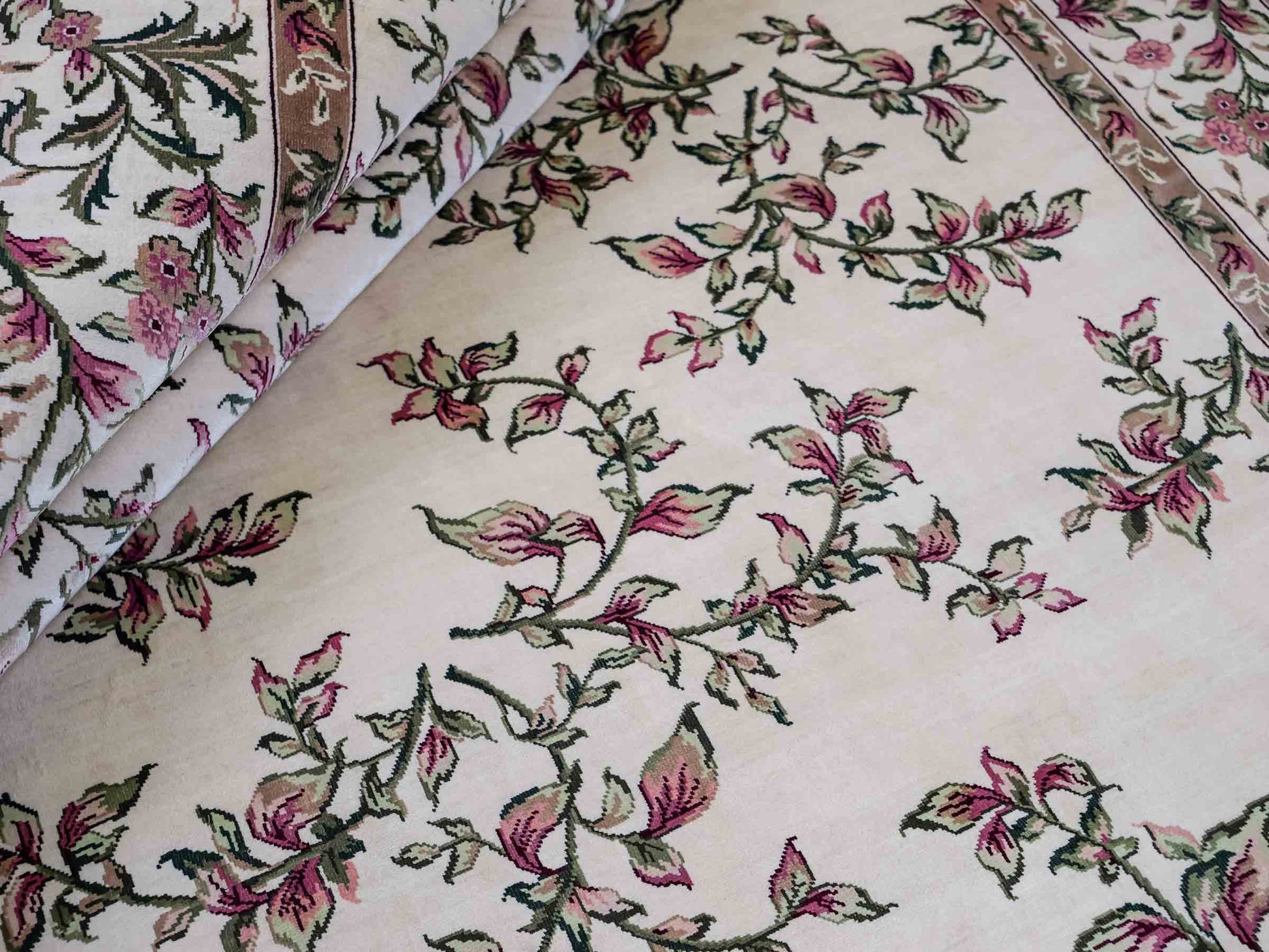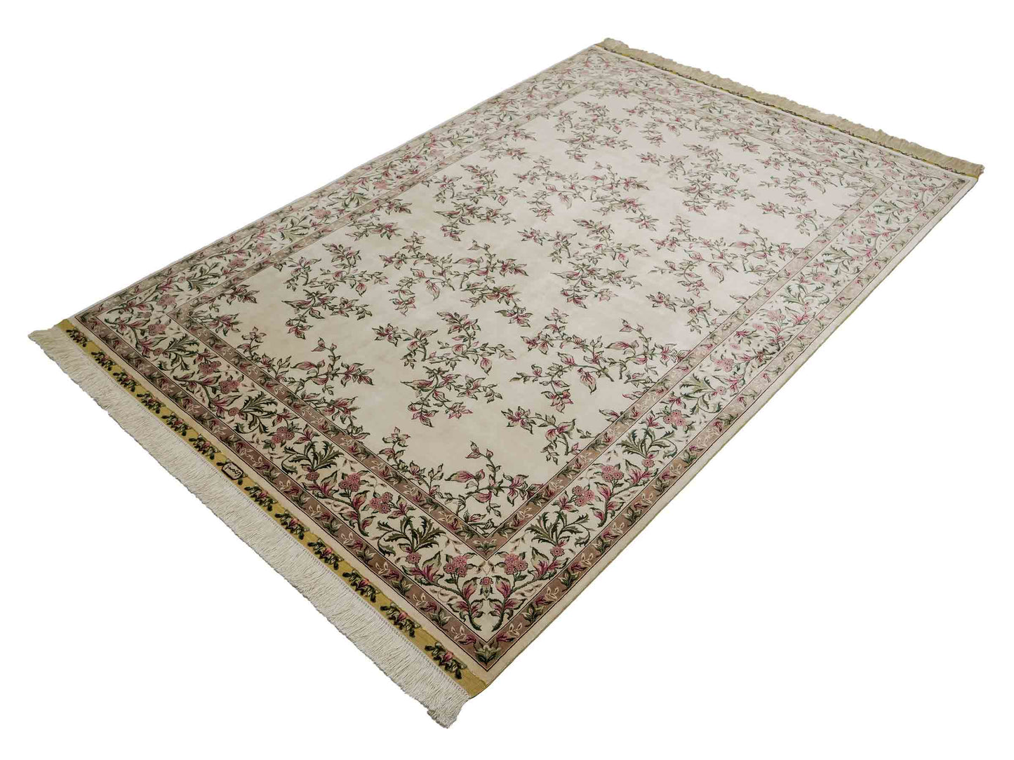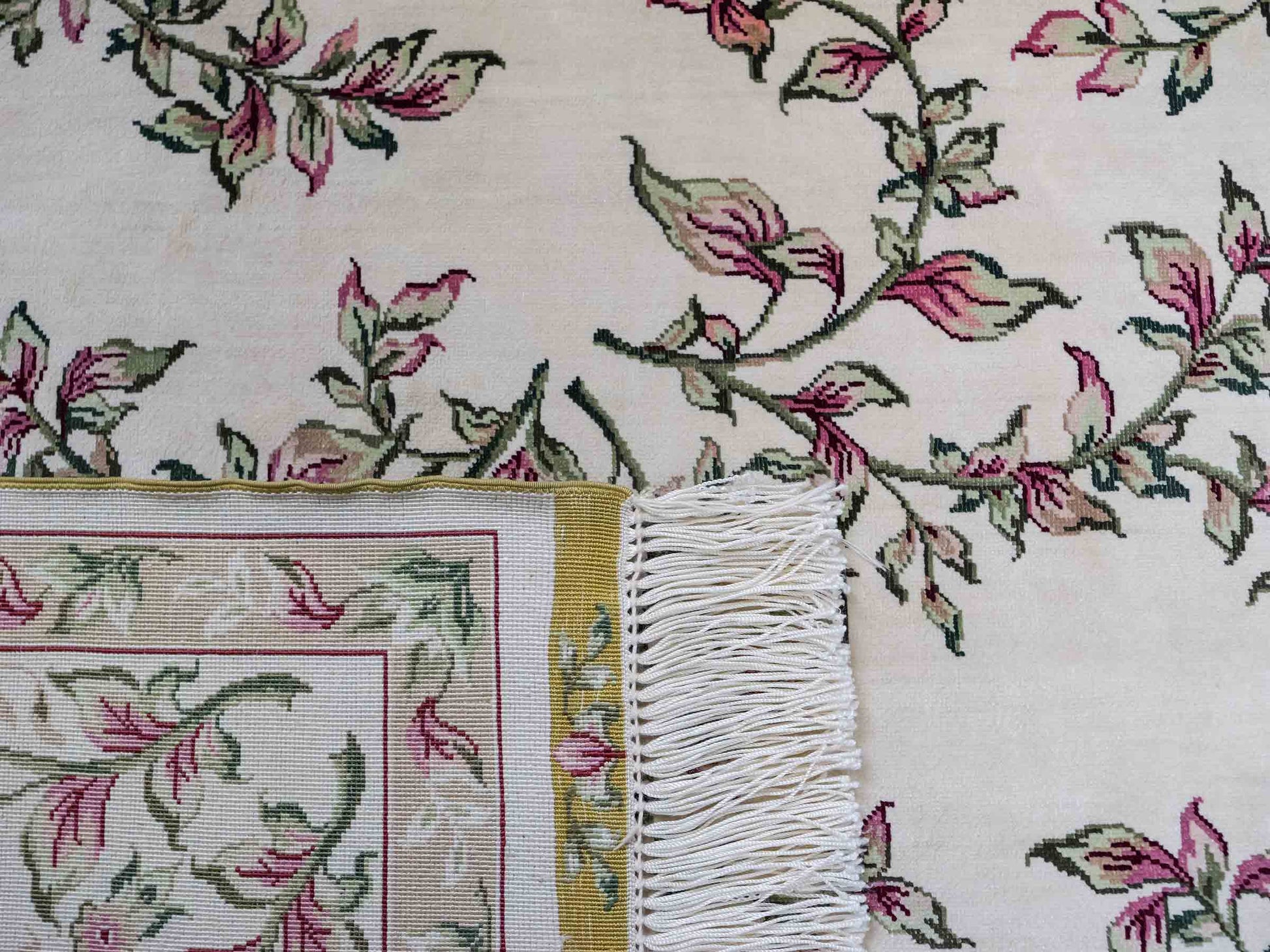 Der Flor und die Kette bestehen aus reiner Seide, was dem Teppich nicht nur einen unfassbaren Wert, eine unvergleichliche Haptik und atemberaubende Schönheit, sondern auch je nach Blickwinkel und Lichtverhältnis ein einzigartig schimmerndes Antlitz verleiht.