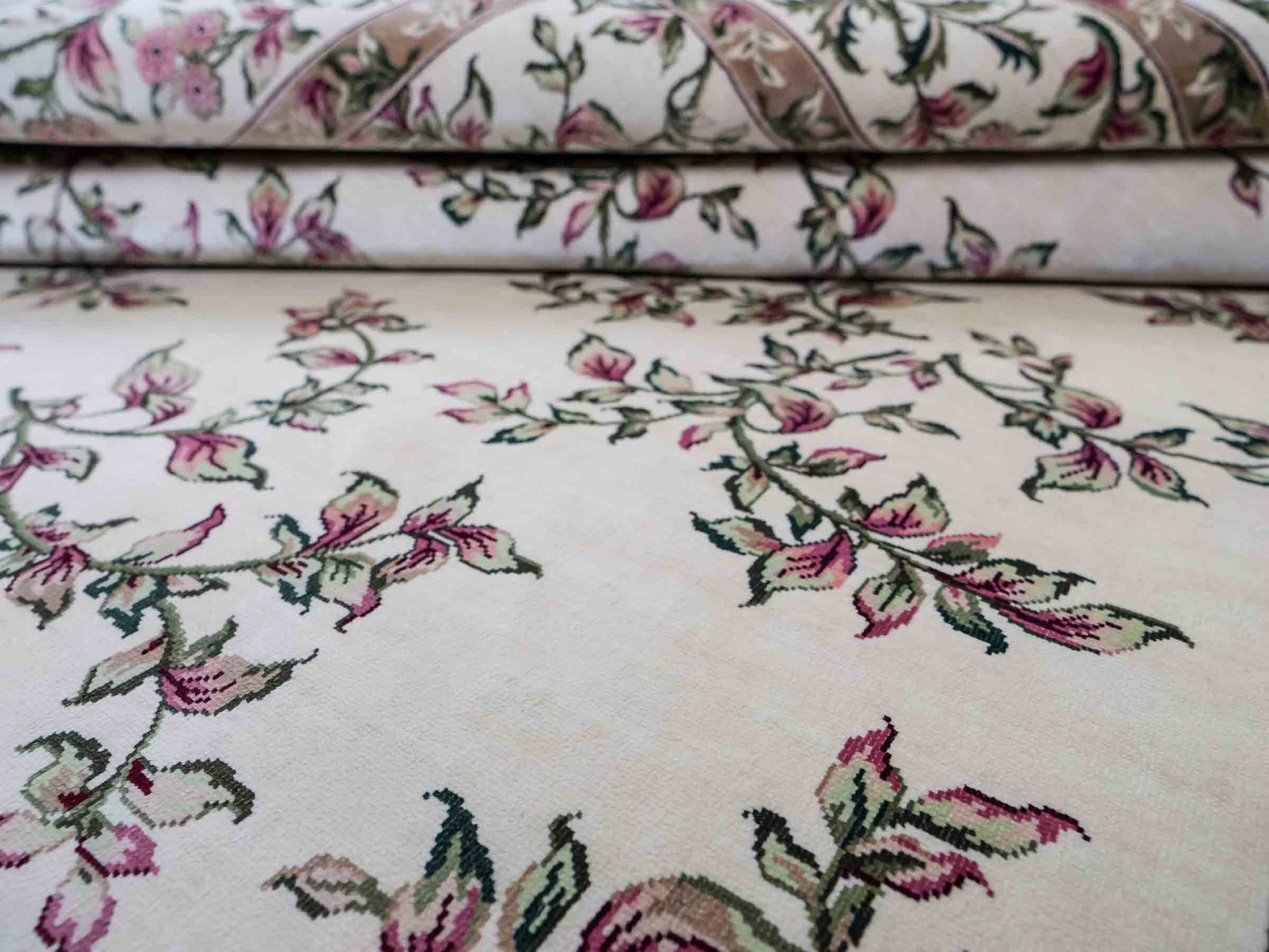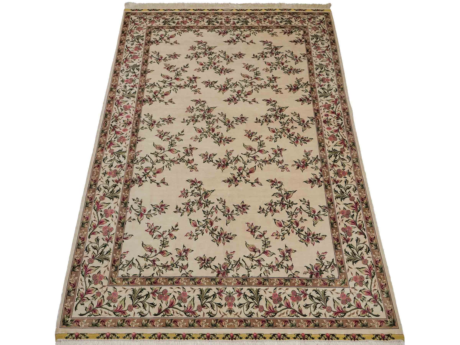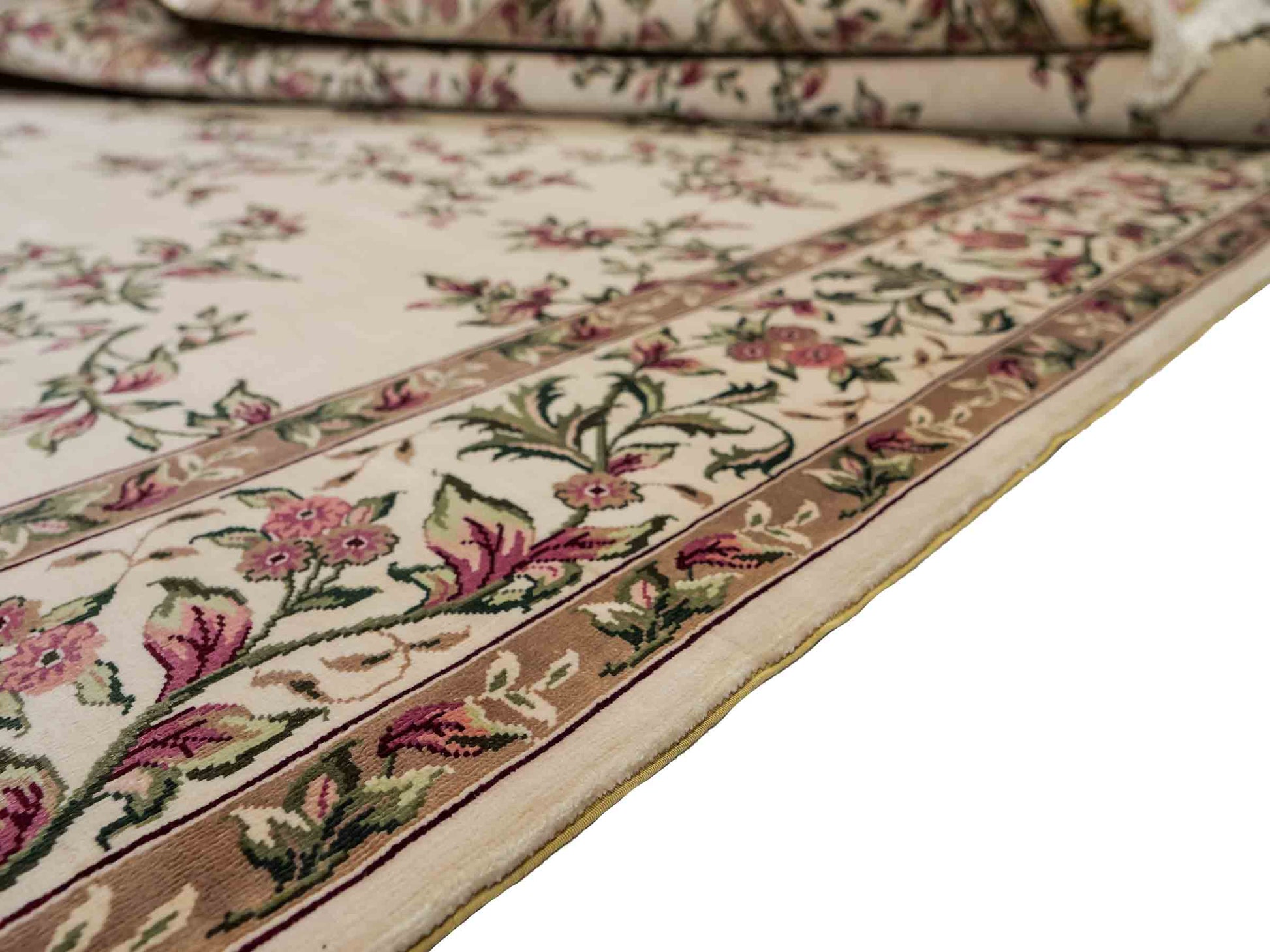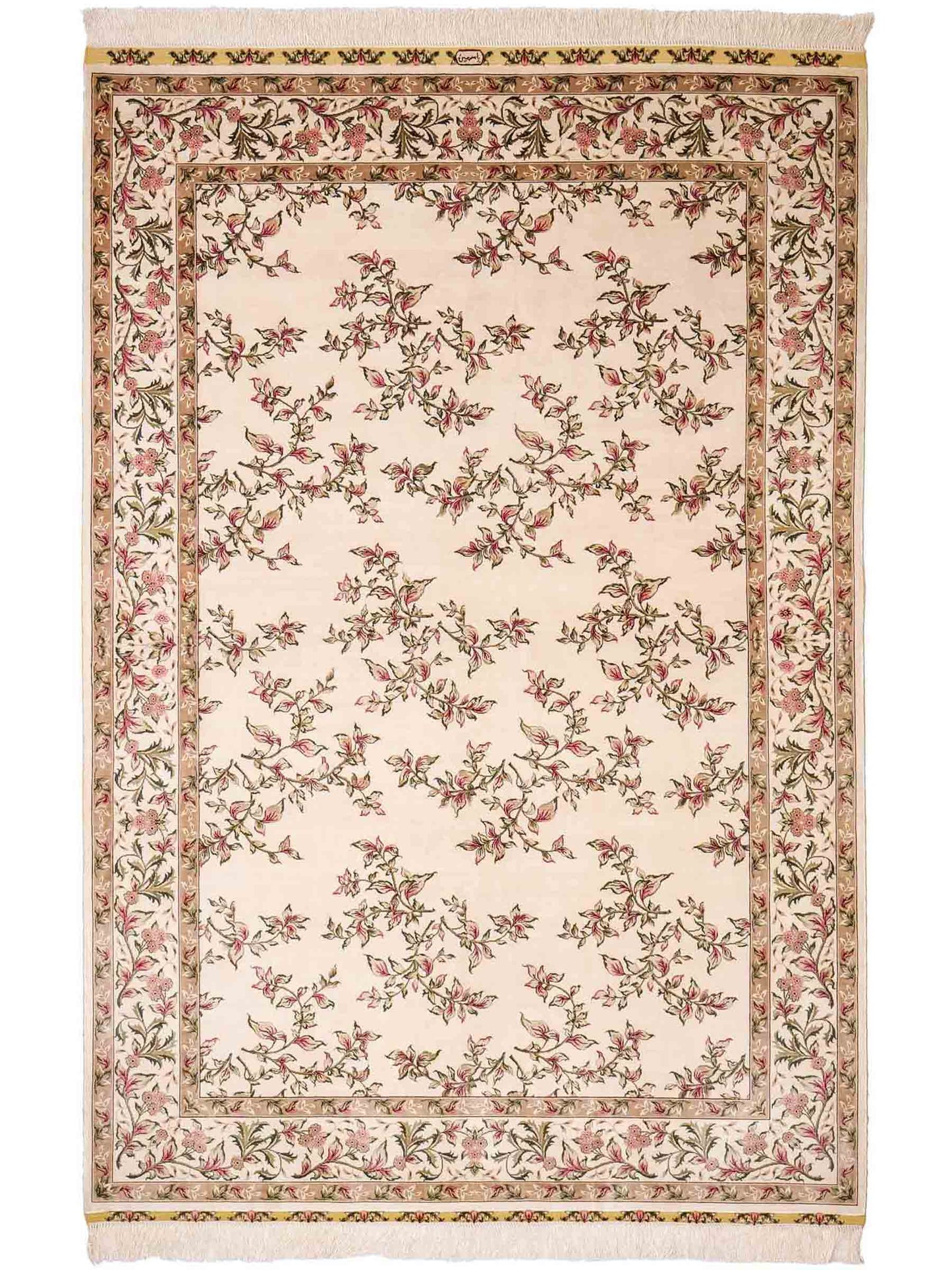 Der Flor und die Kette bestehen aus reiner Seide, was dem Teppich nicht nur einen unfassbaren Wert, eine unvergleichliche Haptik und atemberaubende Schönheit, sondern auch je nach Blickwinkel und Lichtverhältnis ein einzigartig schimmerndes Antlitz verleiht.