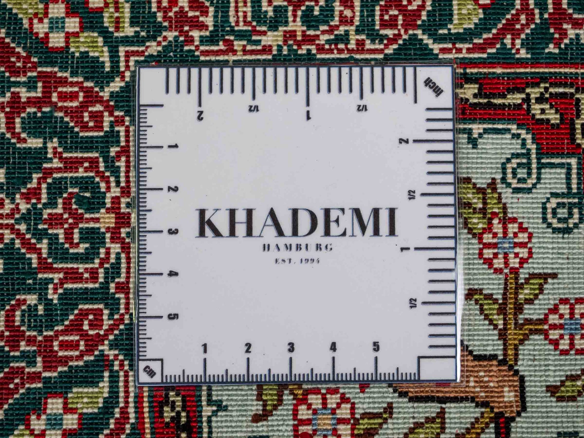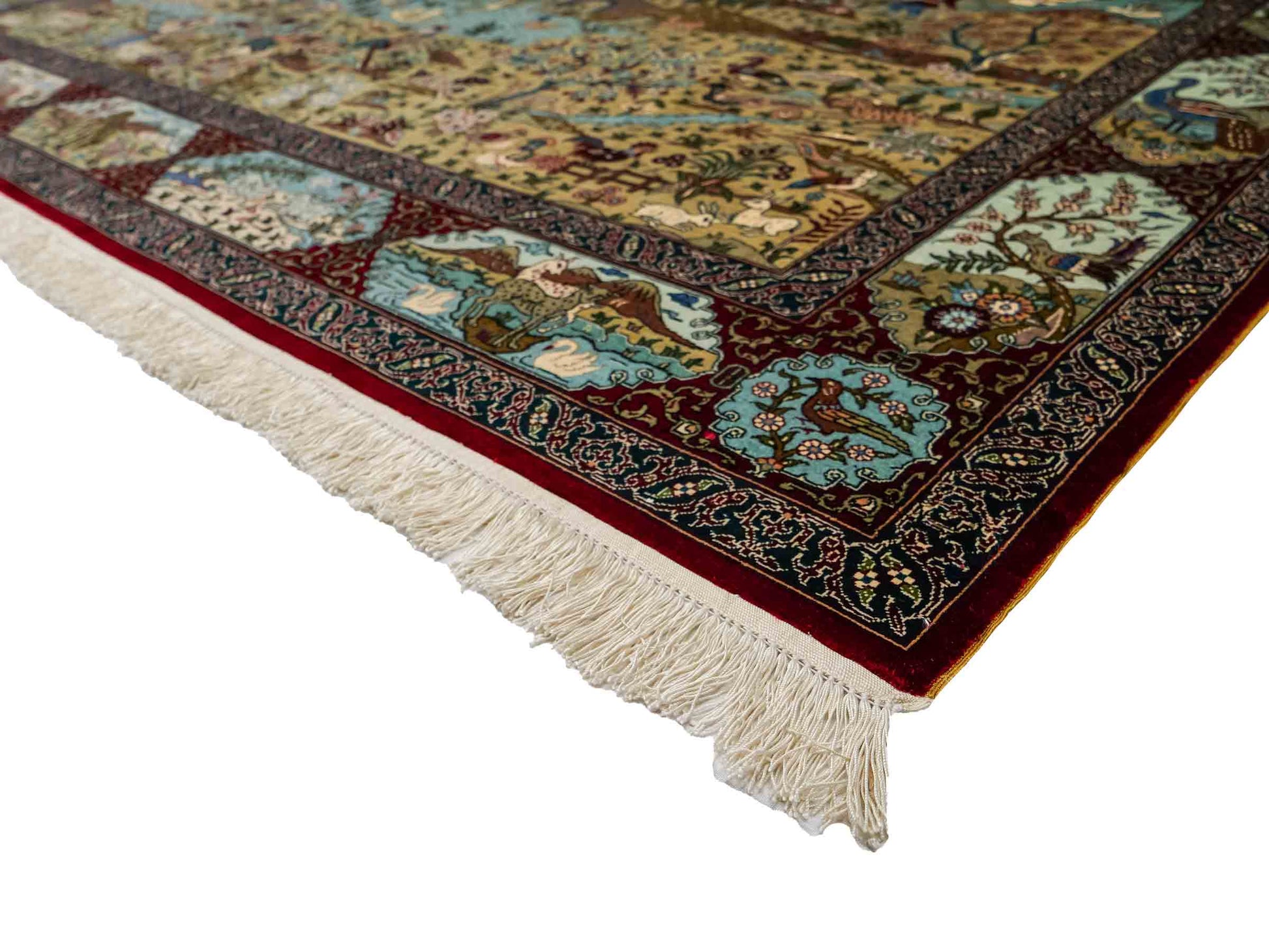 Der Flor und die Kette bestehen aus reiner Seide, was dem Teppich nicht nur einen unfassbaren Wert, eine unvergleichliche Haptik und atemberaubende Schönheit, sondern auch je nach Blickwinkel und Lichtverhältnis ein einzigartig schimmerndes Antlitz verleiht.