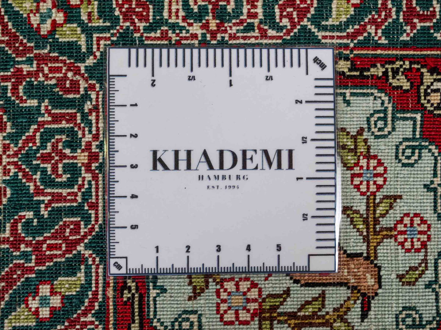 Der Flor und die Kette bestehen aus reiner Seide, was dem Teppich nicht nur einen unfassbaren Wert, eine unvergleichliche Haptik und atemberaubende Schönheit, sondern auch je nach Blickwinkel und Lichtverhältnis ein einzigartig schimmerndes Antlitz verleiht.