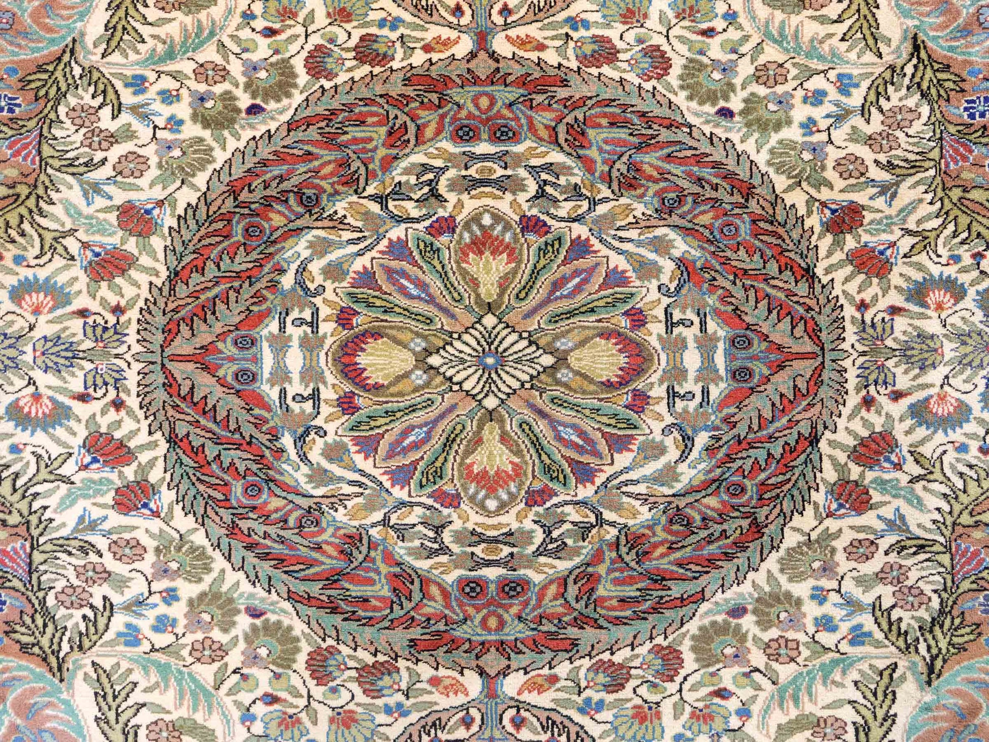 Dieser Teppich besticht durch die Verwendung hochwertigster Wolle, die vor dem Knüpfen sorgfältig behandelt wurde, um Strapazierfähigkeit und Wärme zu gewährleisten. Gepaart mit einer hohen Knotendichte garantiert er nicht nur Langlebigkeit, sondern ermöglicht es auch, sein ikonisches Ghom Design mit all seinen floralen Motiven, geometrischen Formen und dem zentralen Medaillon perfekt zur Geltung zu bringen.