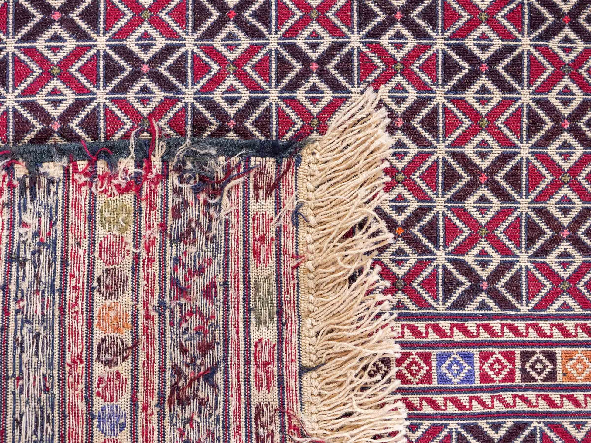 Die bunten, geometrischen Muster verleihen den Kelim Afghan Teppichen ihren charakteristischen Look. Sie bestehen aus hochwertiger Schafswolle, die für ihre Strapazierfähigkeit geschätzt wird. Da sie nicht geknüpft, sondern gewoben werden, haben sie eine andere Textur und Dynamik, was sie besonders vielseitig macht.