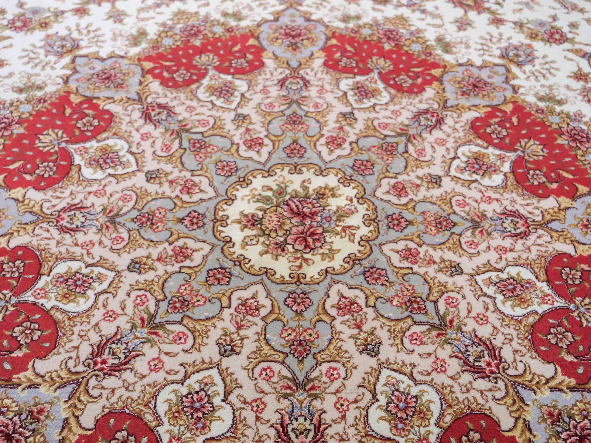 Bekannt durch die Seidenstraße blickt das Ursprungsland dieses aus chinesischer Meisterhand stammenden Unikats zurück auf eine überaus traditionsreiche Knüpfkultur. Neben seiner herausragenden Qualität und bemerkenswerten Anzahl an Knoten zeichnet sich dieses Exemplar durch sein zeitloses Täbriz Design und seine unbeschreibliche Detailverliebtheit aus.
