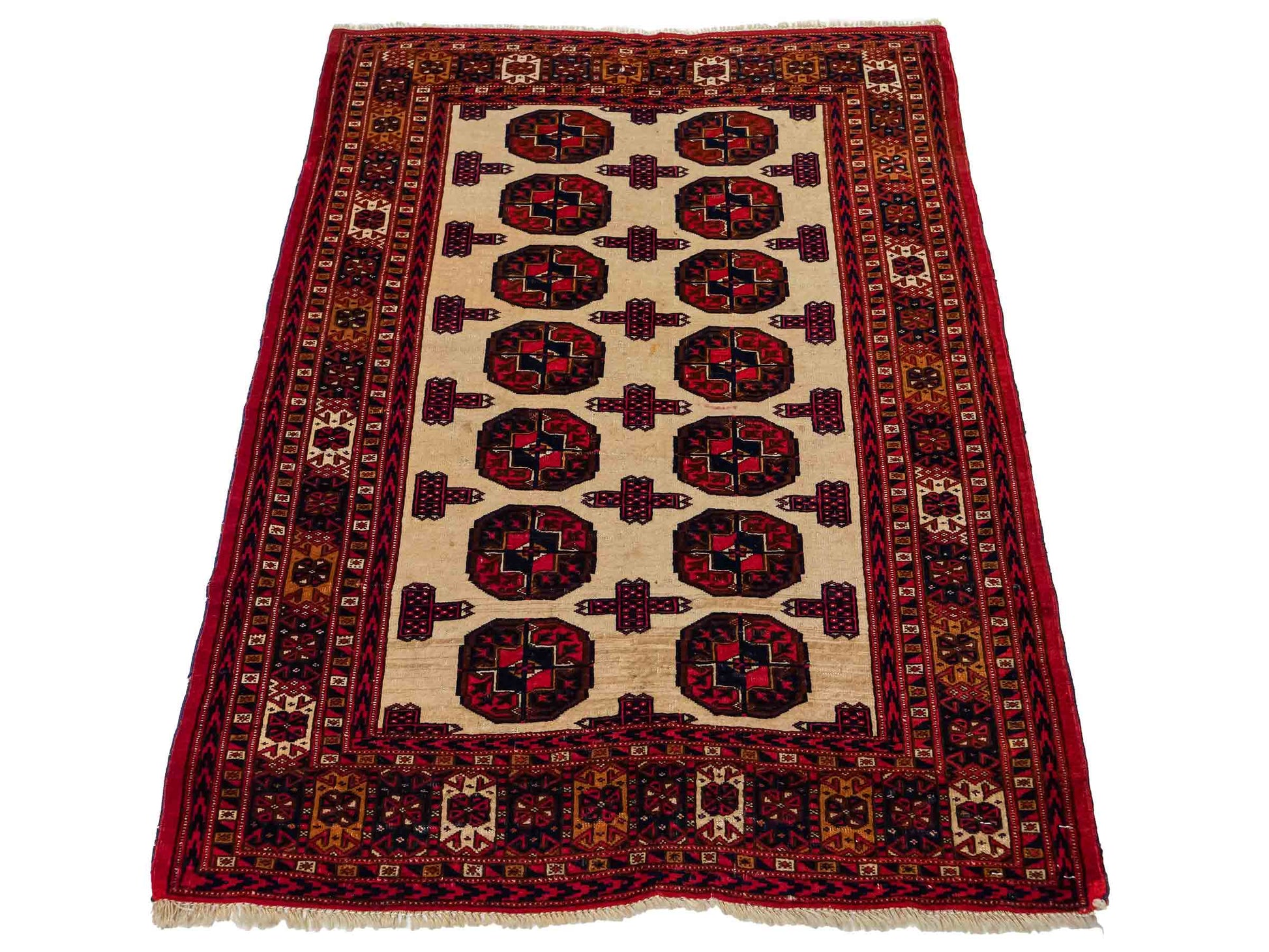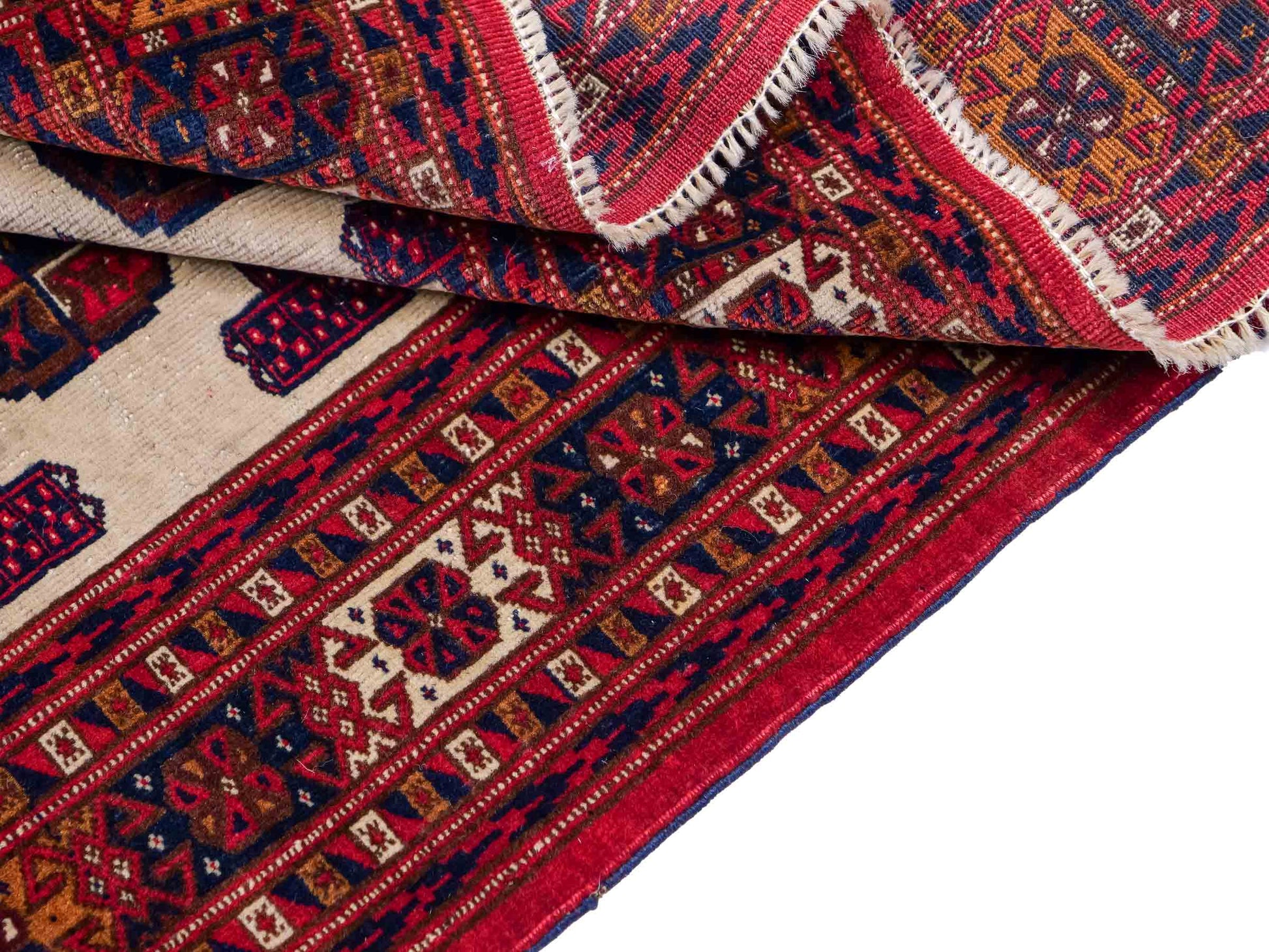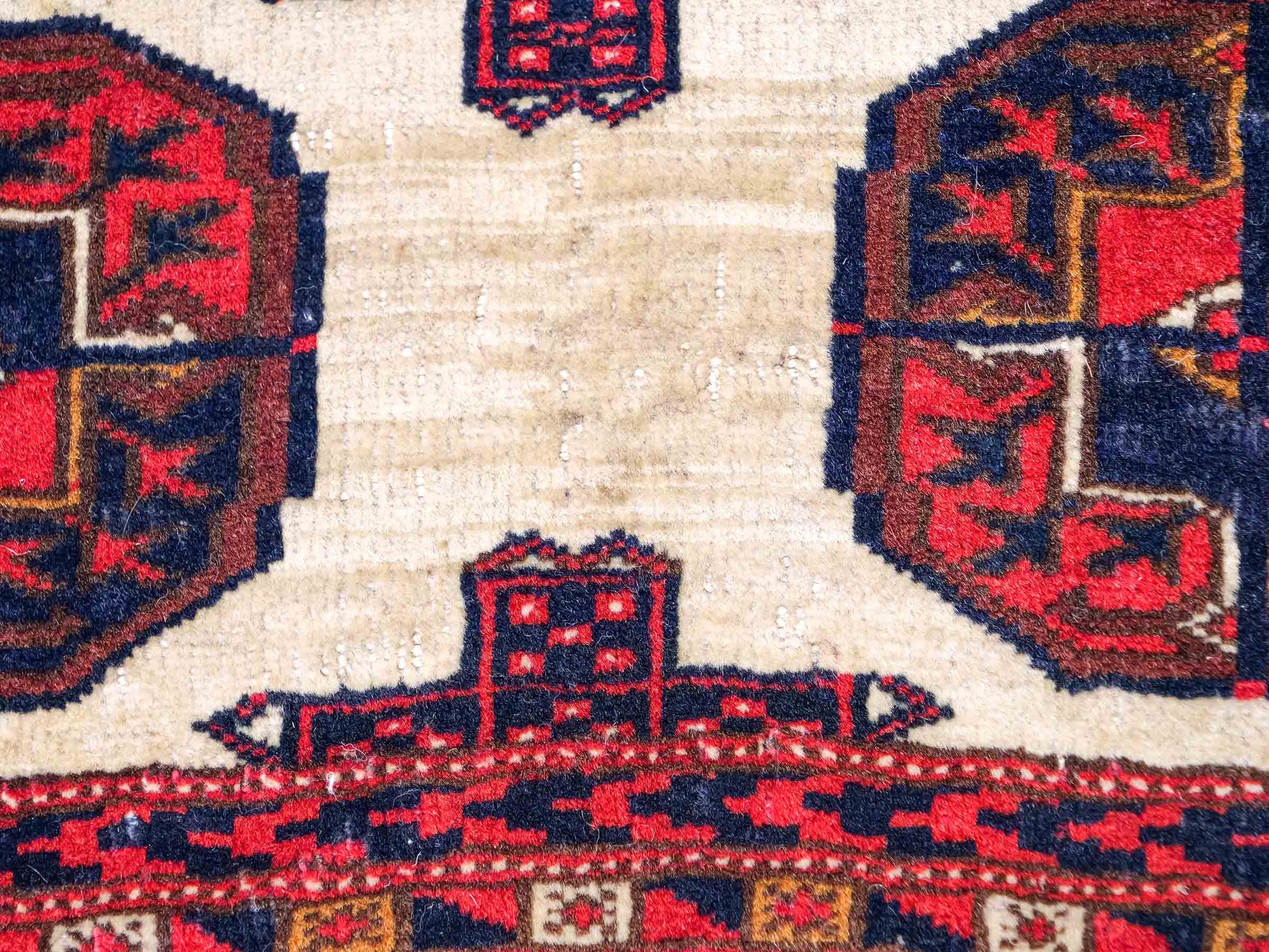 This antique Russia Oriental rug, around 70 years old, displays visible signs of wear, discoloration, and flaws that highlight its history and authenticity. Nevertheless, it shines in a soft cream white, vibrantly rounded out with rich red and deep blue accents. Its characteristic allover design, blending geometric shapes and stylized flowers, draws the eye and infuses any space with a touch of oriental elegance.