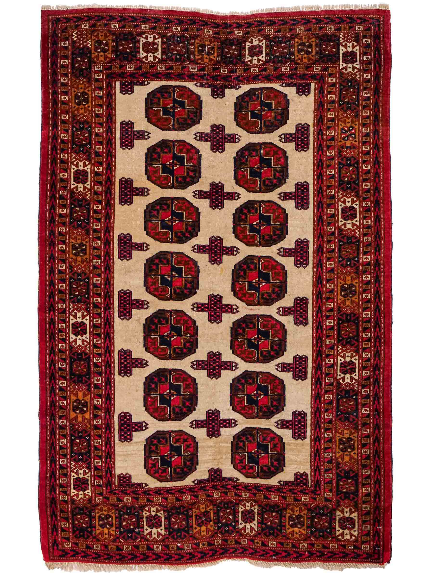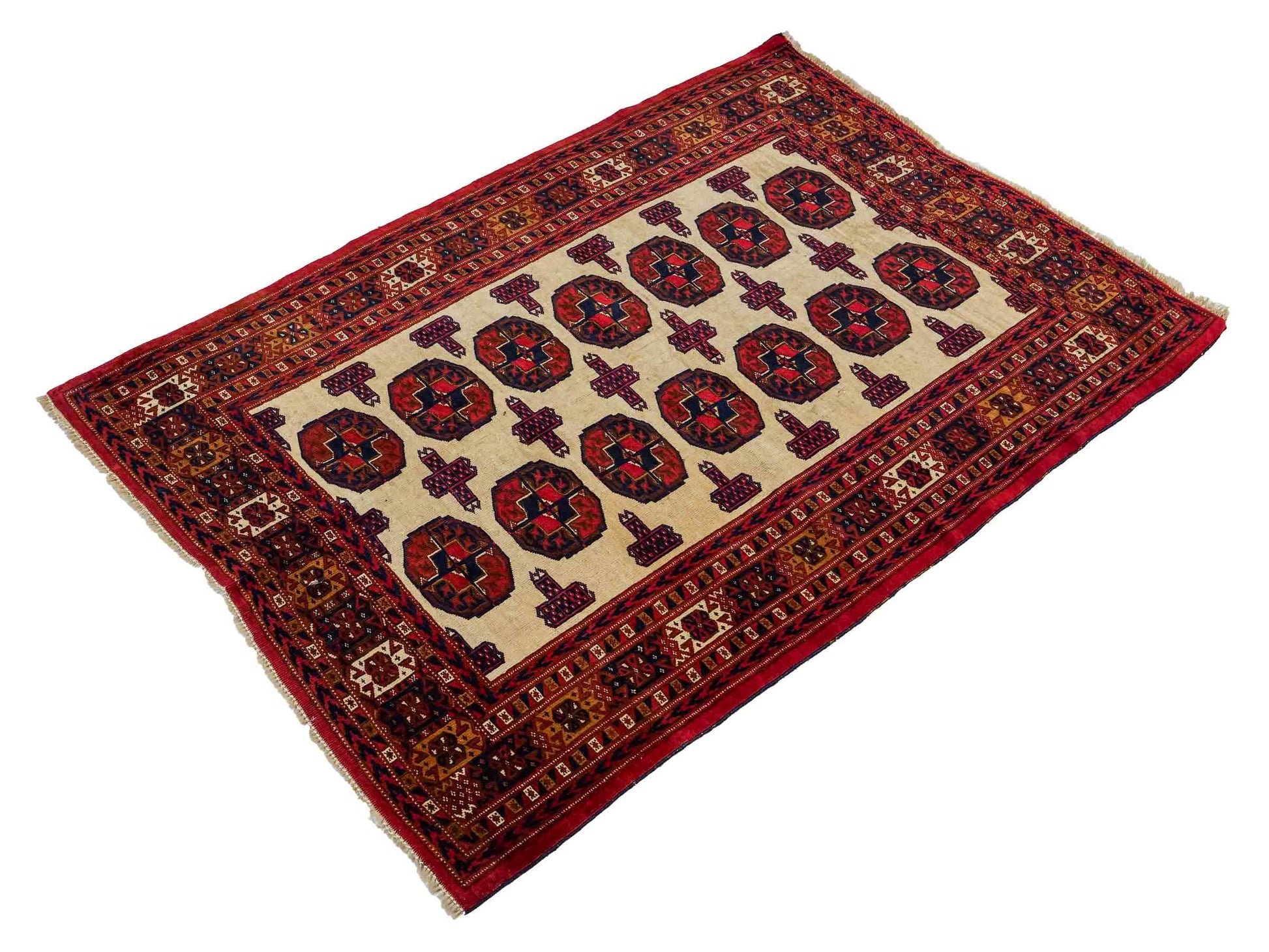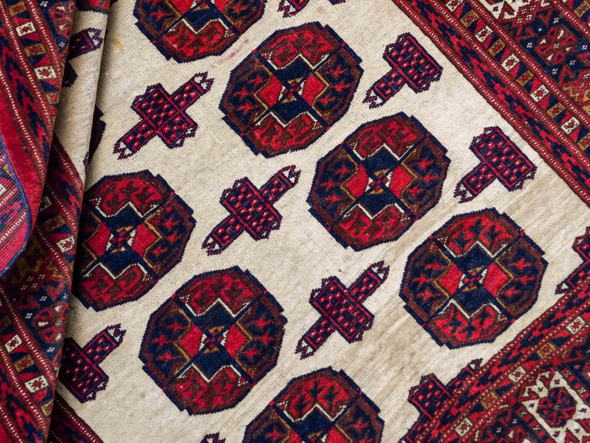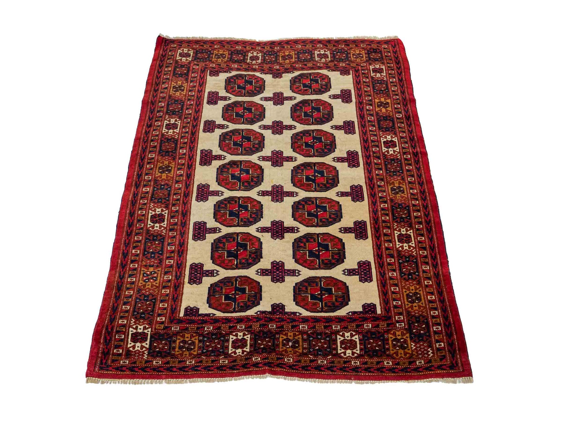 This antique Russia Oriental rug, around 70 years old, displays visible signs of wear, discoloration, and flaws that highlight its history and authenticity. Nevertheless, it shines in a soft cream white, vibrantly rounded out with rich red and deep blue accents. Its characteristic allover design, blending geometric shapes and stylized flowers, draws the eye and infuses any space with a touch of oriental elegance.