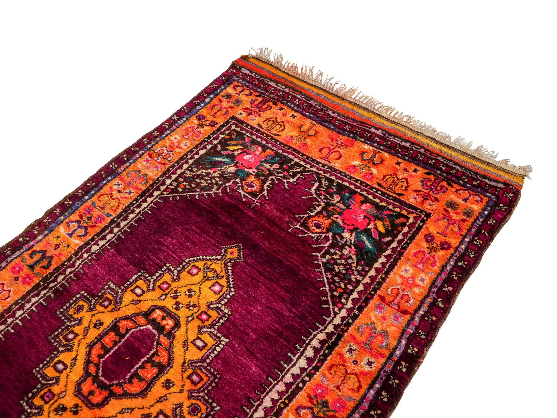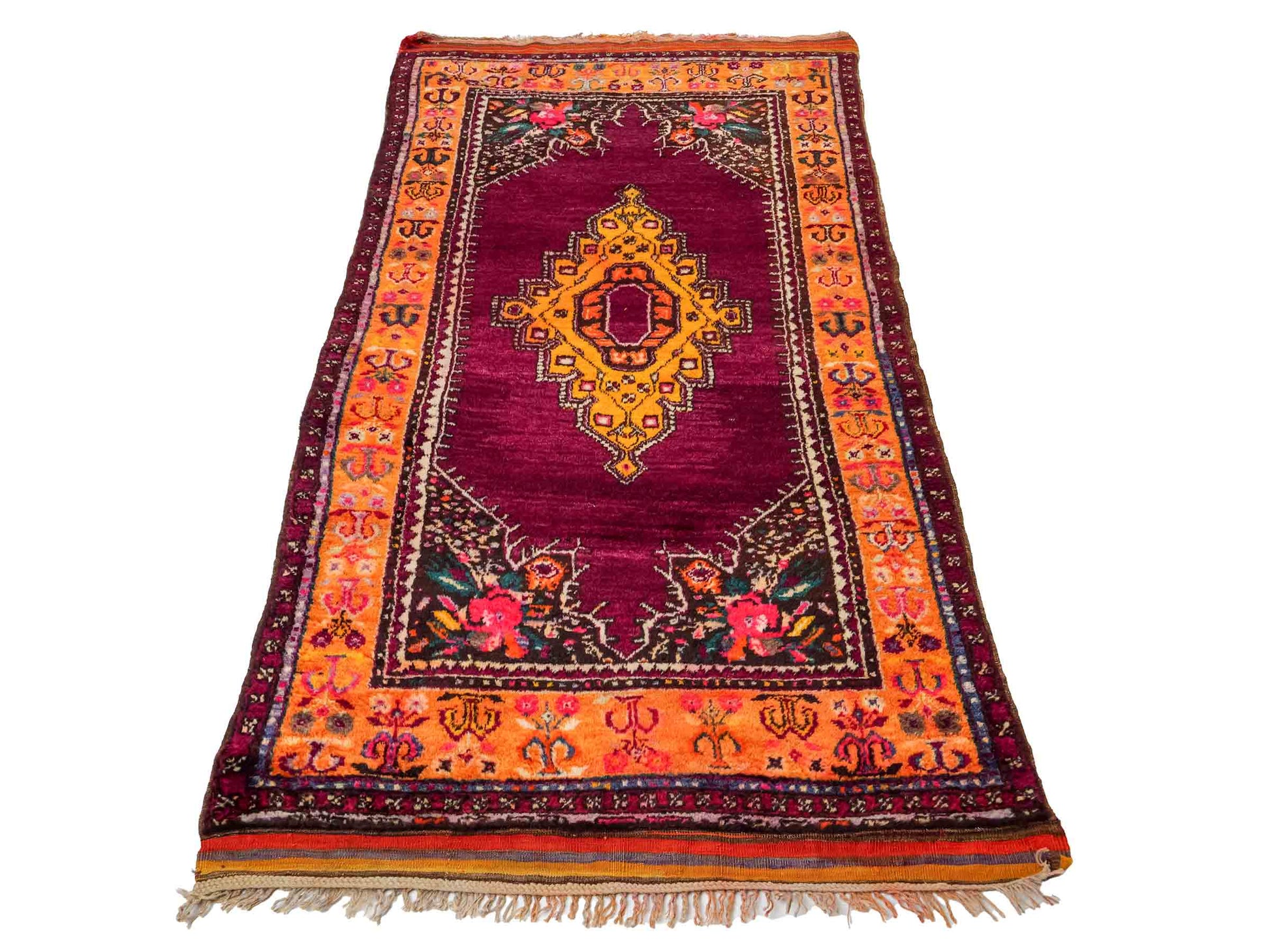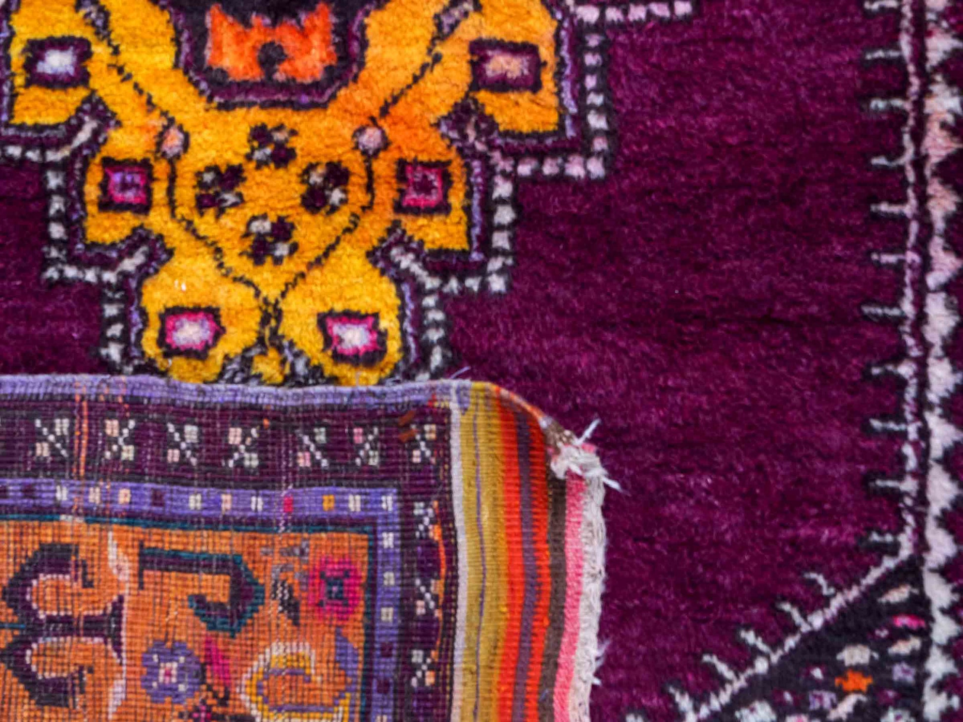 The dominant violet palette, balanced by lively yellow accents, creates an impressive contrast that highlights the unique medallion design. The pile is made of high-quality natural wool, while the sturdy cotton warp ensures lasting durability. With a knot density of approximately 90,000 knots per square meter, this rug exhibits detailed precision and excellent resilience.
