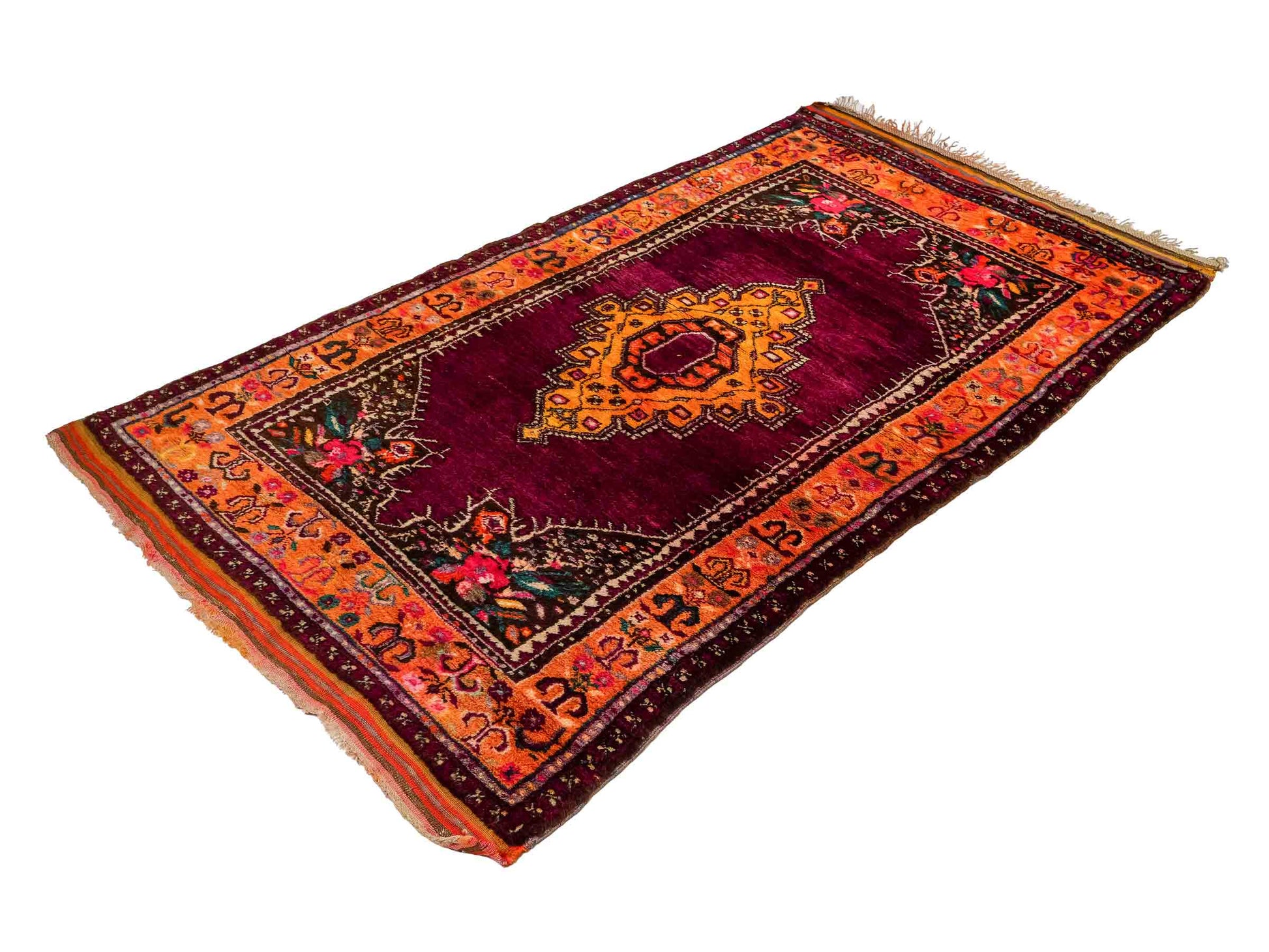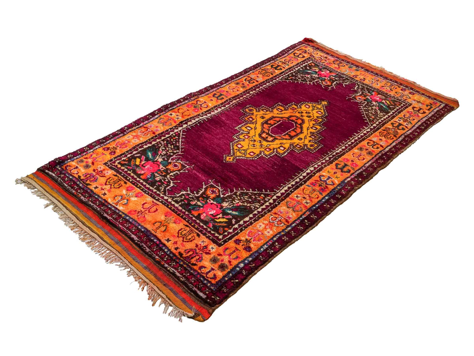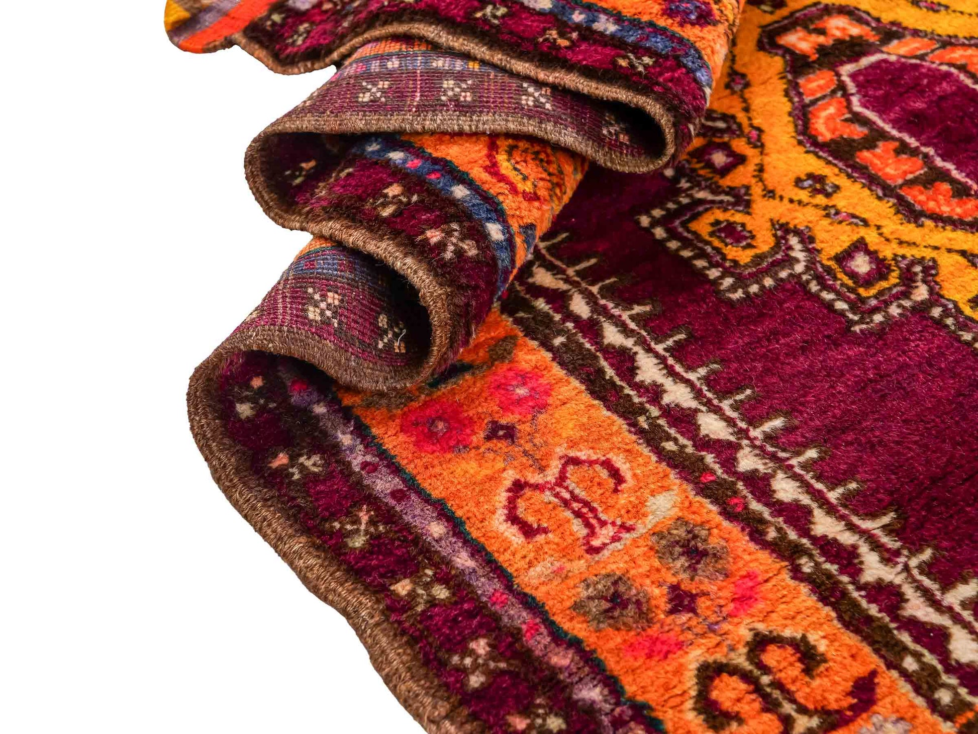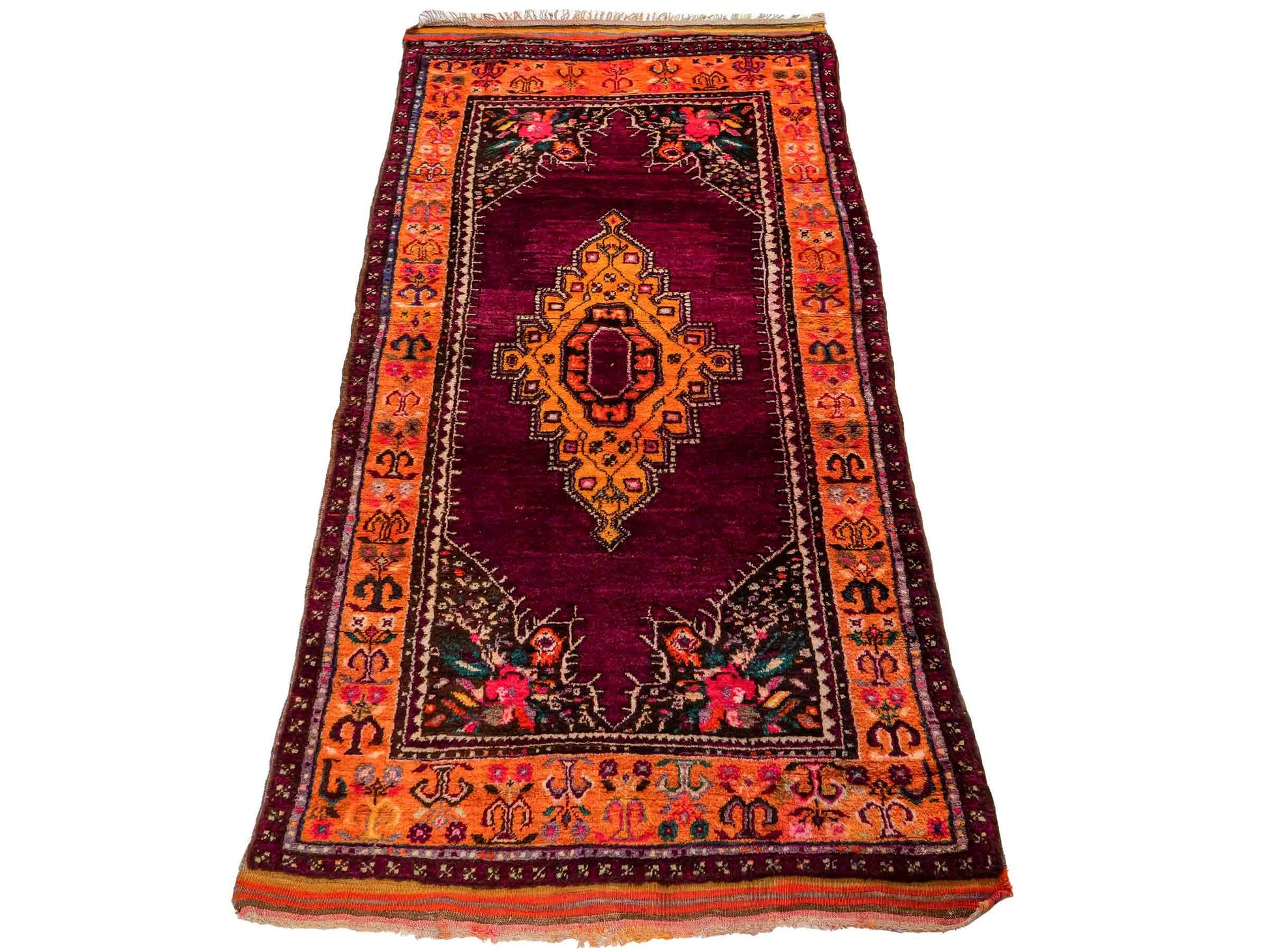 The dominant violet palette, balanced by lively yellow accents, creates an impressive contrast that highlights the unique medallion design. The pile is made of high-quality natural wool, while the sturdy cotton warp ensures lasting durability. With a knot density of approximately 90,000 knots per square meter, this rug exhibits detailed precision and excellent resilience.