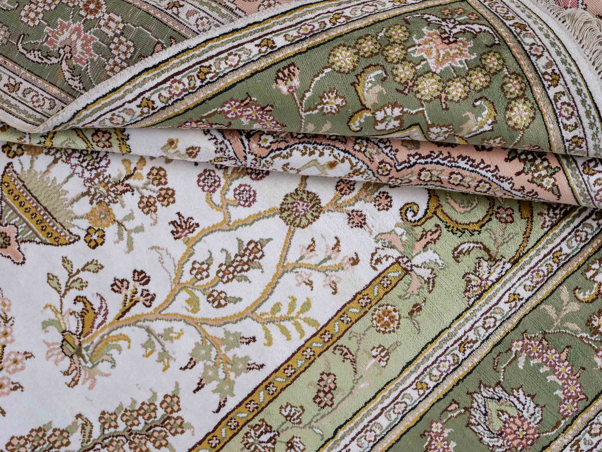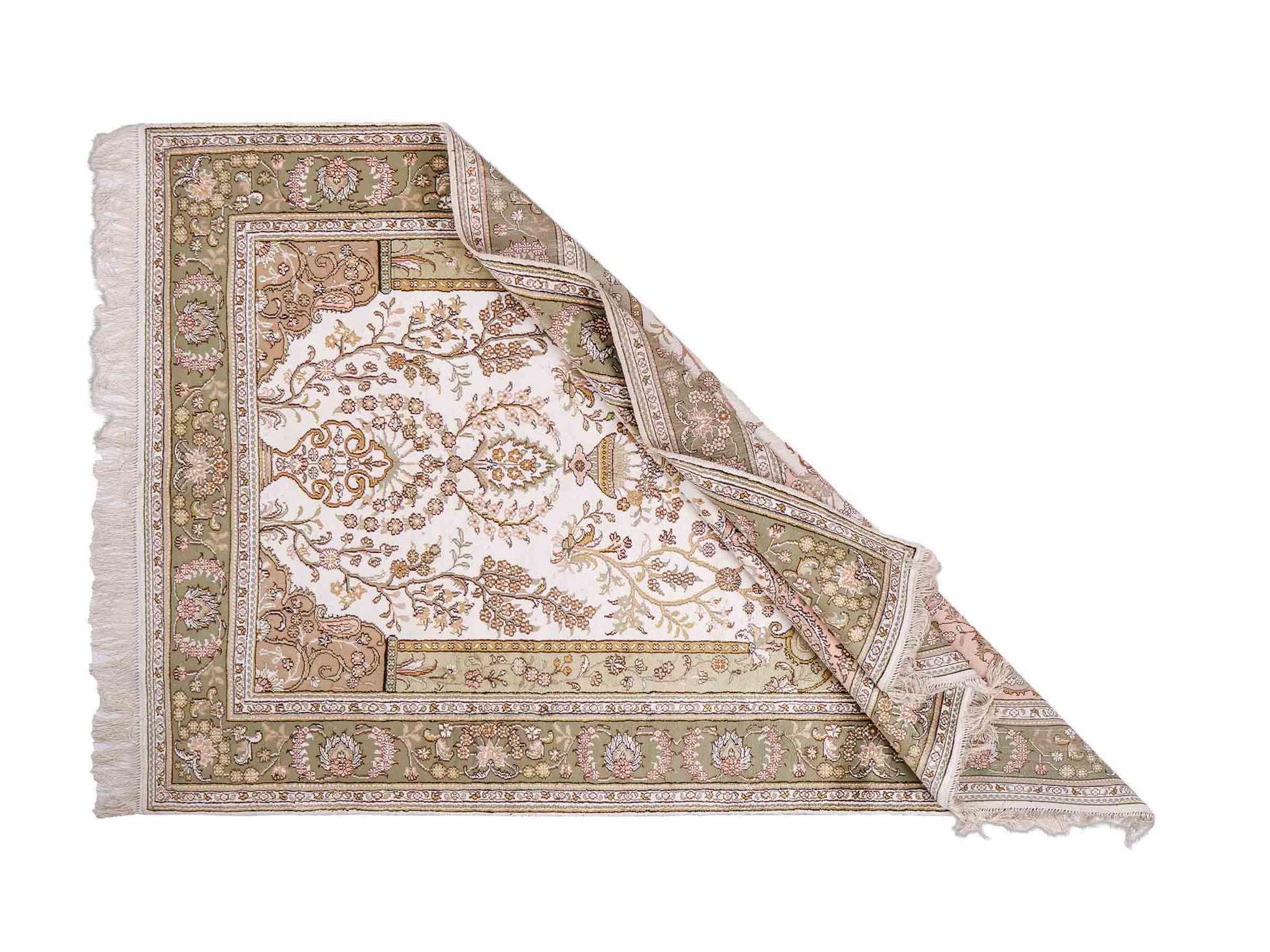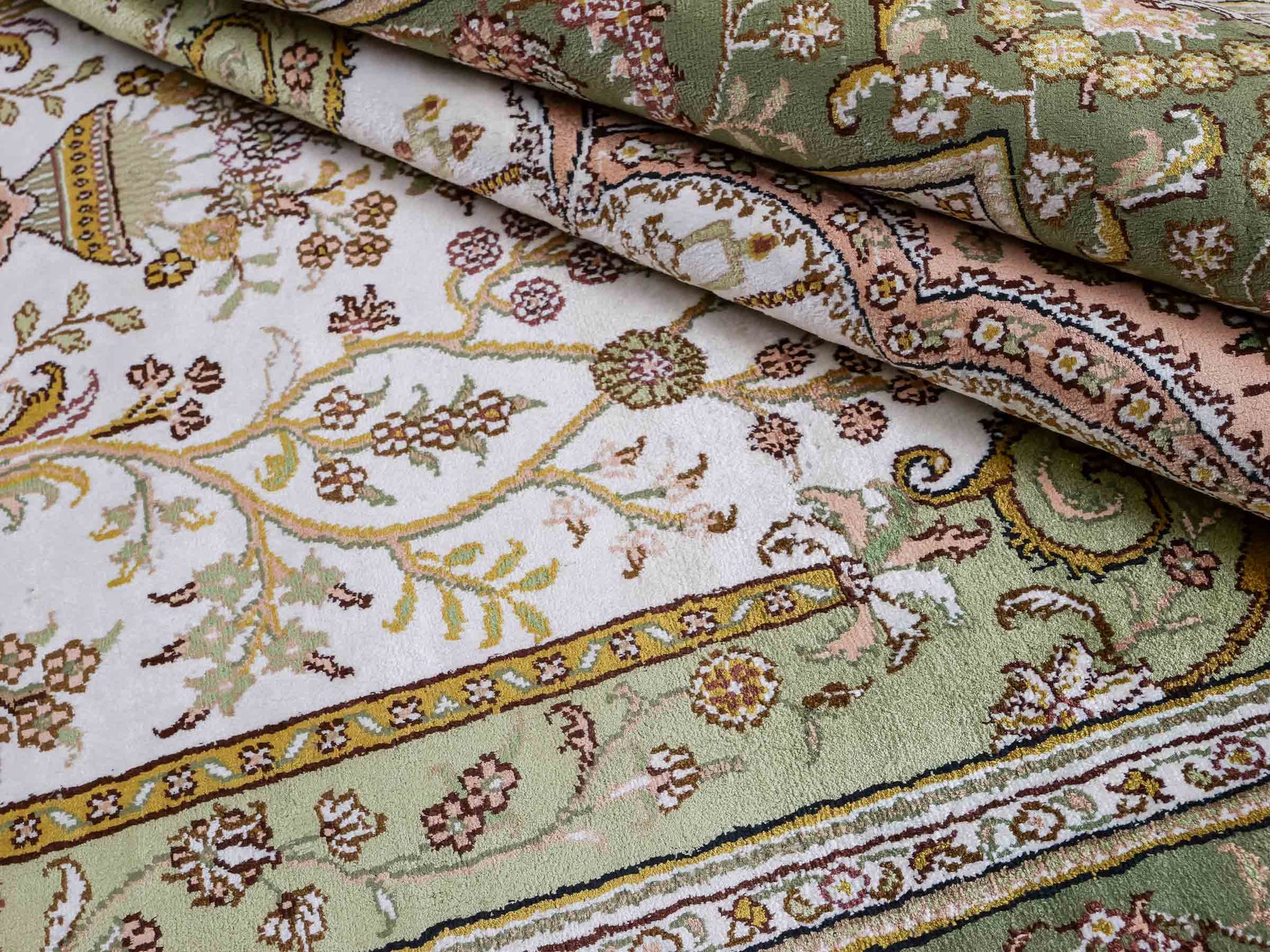 Wool with Silk: These rugs require particularly careful storage, as the combination of wool and silk makes both materials sensitive. Store them in a cool, dry place away from direct sunlight. A constant temperature of about 18 degrees Celsius is ideal. Use breathable cotton dust covers to protect the rug while ensuring ventilation. Regular inspections help to detect mold and pests early.