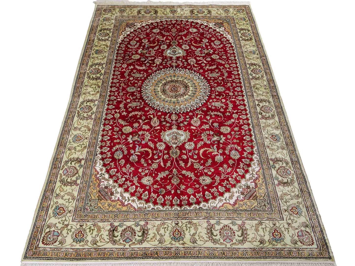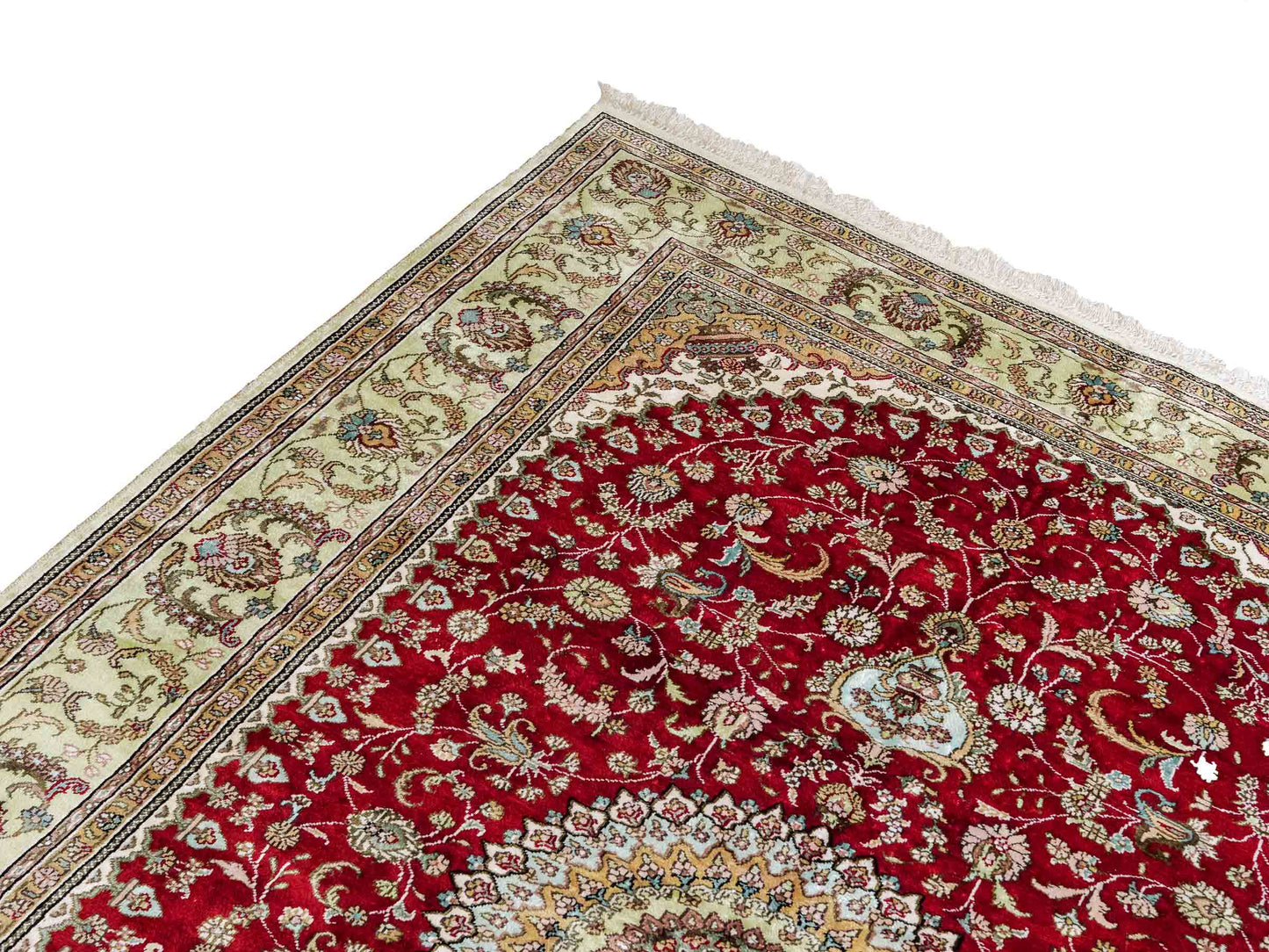 Silk rugs should never get wet, as water can severely damage their delicate fibers and colors. Moisture can lead to deformation, color loss, and fiber weakening. If the rug accidentally comes into contact with liquid, immediately blot the area with a clean, absorbent cloth and avoid vigorous rubbing. The rug should be air-dried as quickly as possible, without direct sunlight or heat sources, to prevent further damage. In severe cases, professional help is strongly recommended.